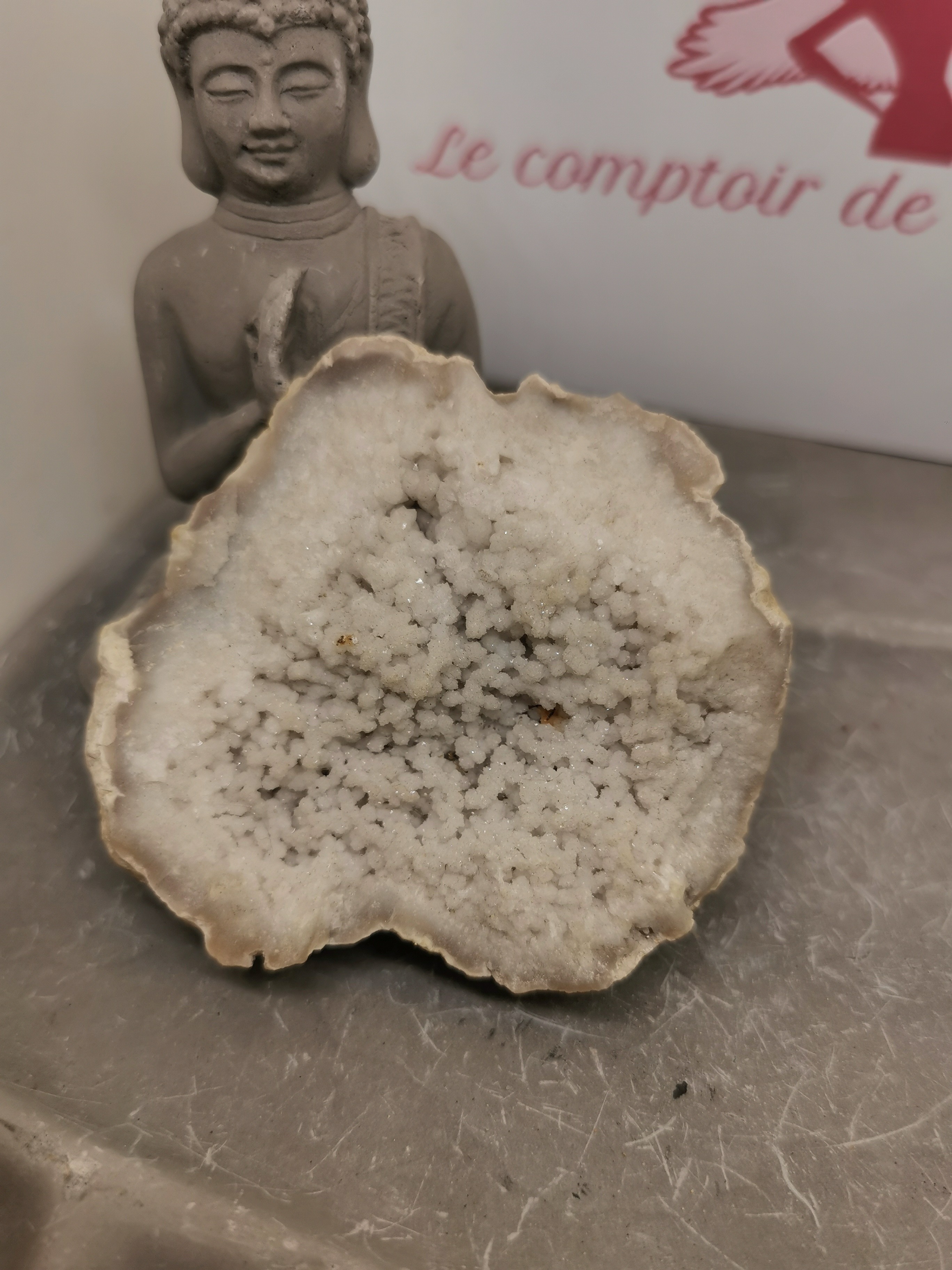Cette géode de cristal de roche naturelle, aux cristaux fins et lumineux, diffuse une énergie douce, purifiante et équilibrante.