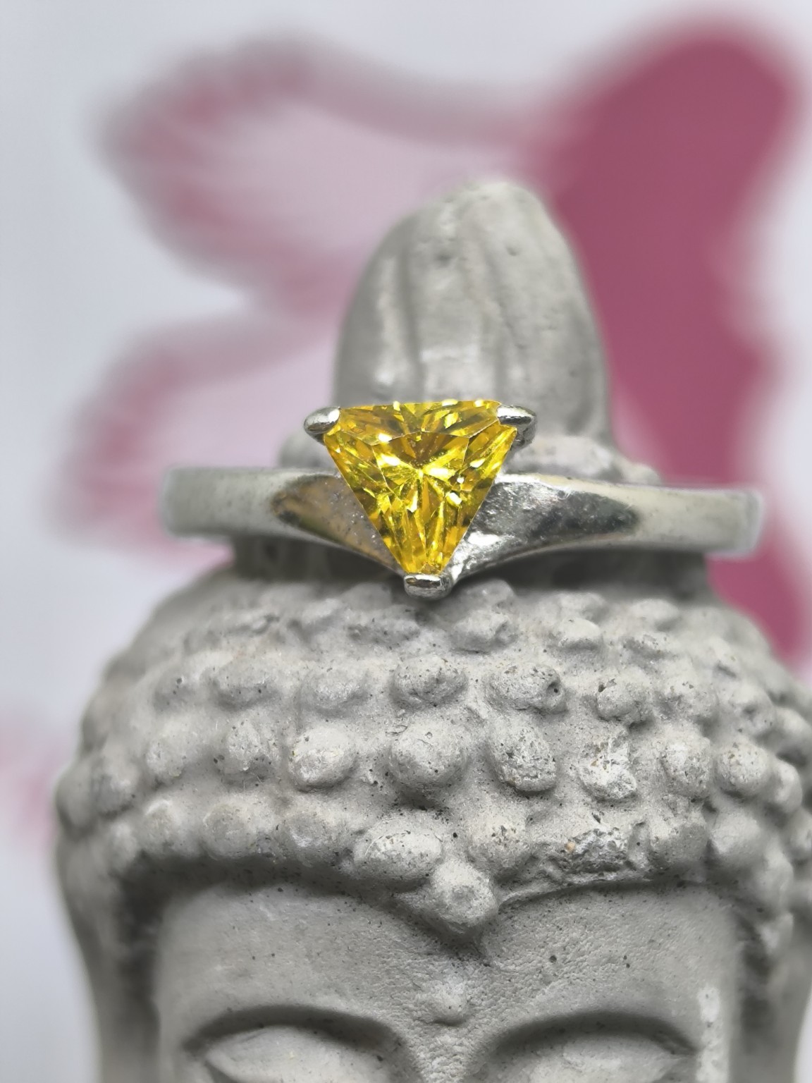 Sa pierre centrale, taillée en forme triangulaire lumineuse, capte intensément la lumière et révèle des reflets dorés éclatants. Sa couleur jaune soleil apporte immédiatement une sensation de chaleur, de vitalité et d’énergie positive.