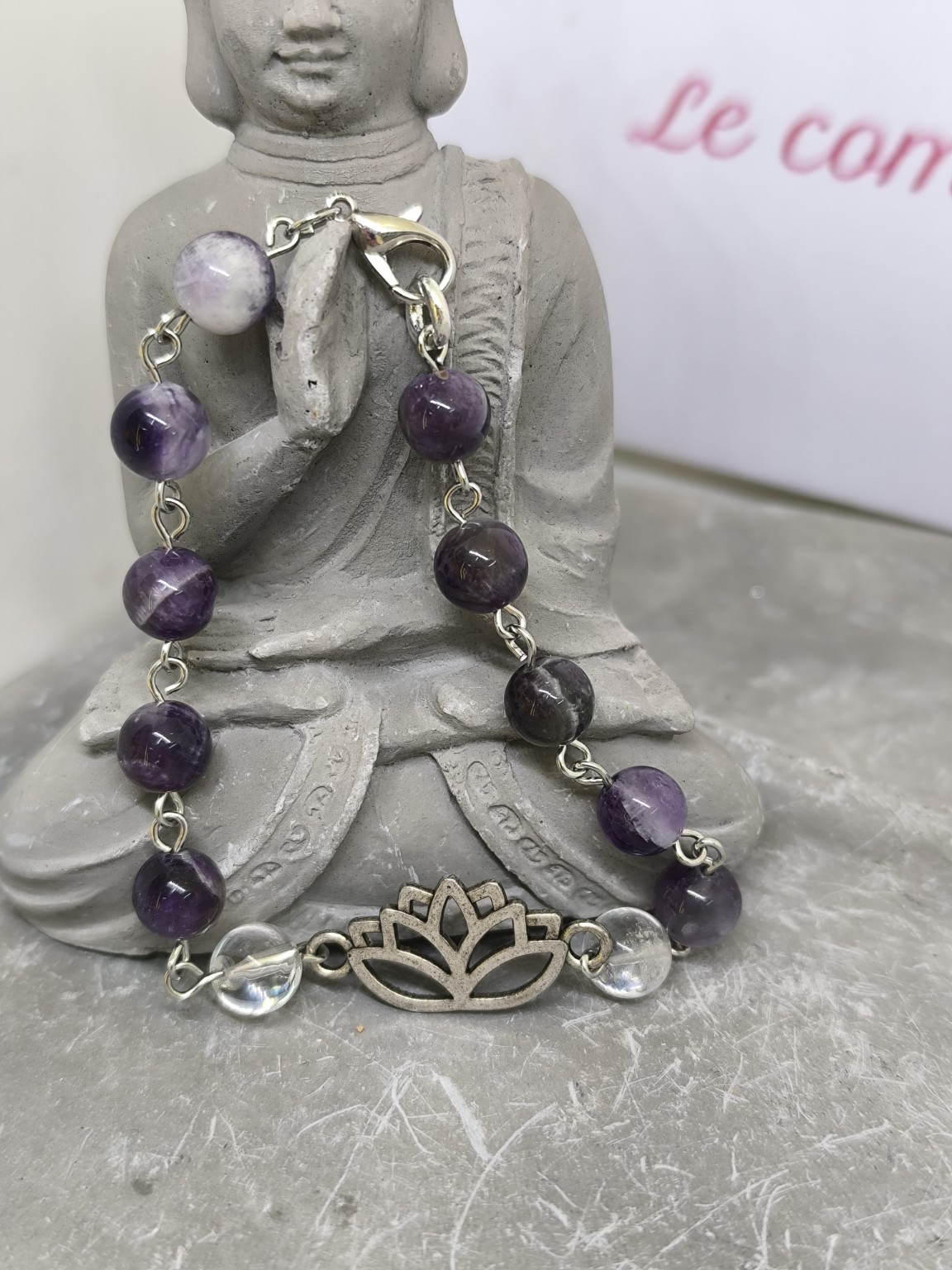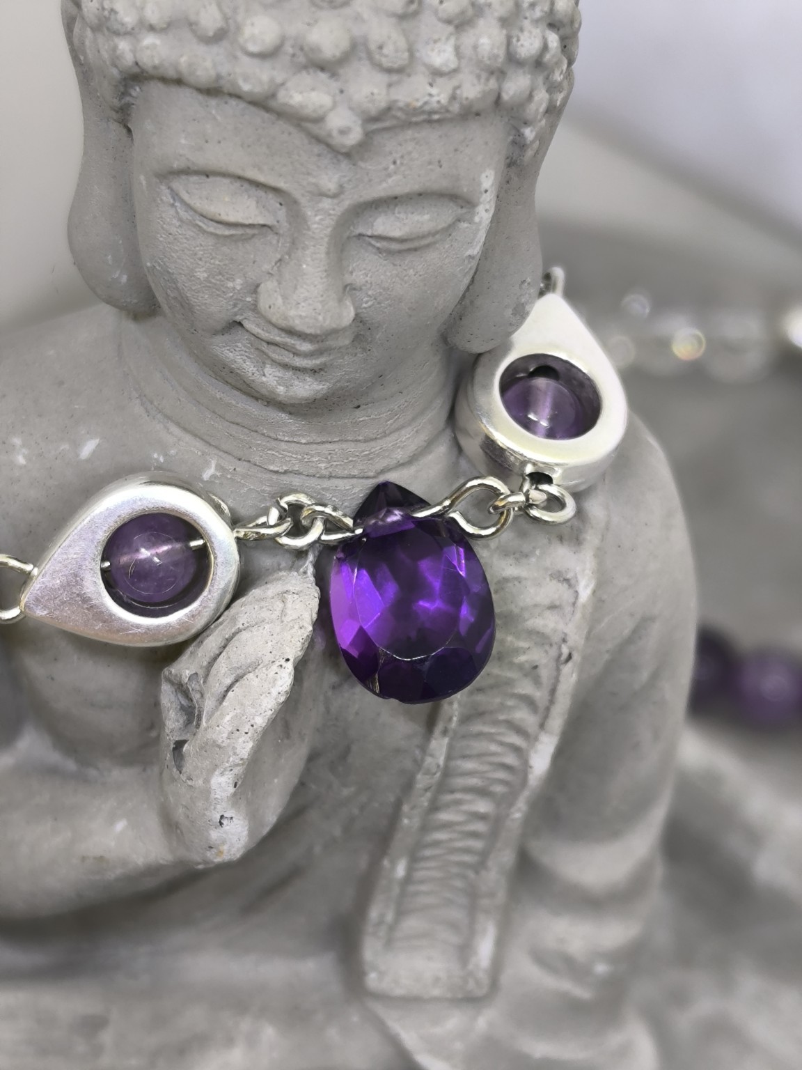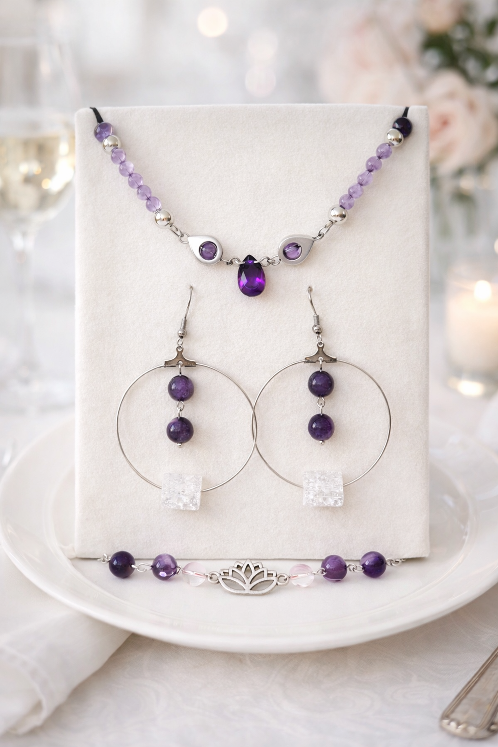 Découvrez cette magnifique parure en améthyste et cristal de roche, composée d’un collier raffiné, d’un bracelet avec symbole lotus et d’une paire de boucles d’oreilles créoles martelées.