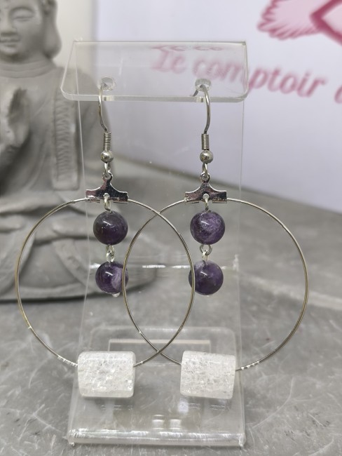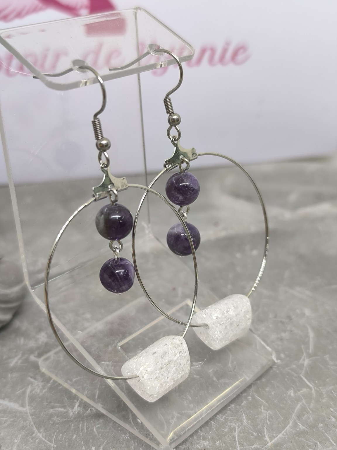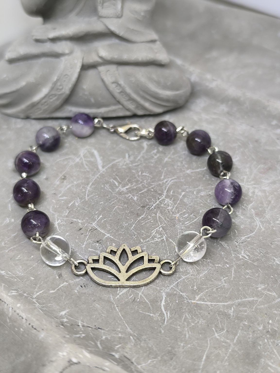 Découvrez cette magnifique parure en améthyste et cristal de roche, composée d’un collier raffiné, d’un bracelet avec symbole lotus et d’une paire de boucles d’oreilles créoles martelées.