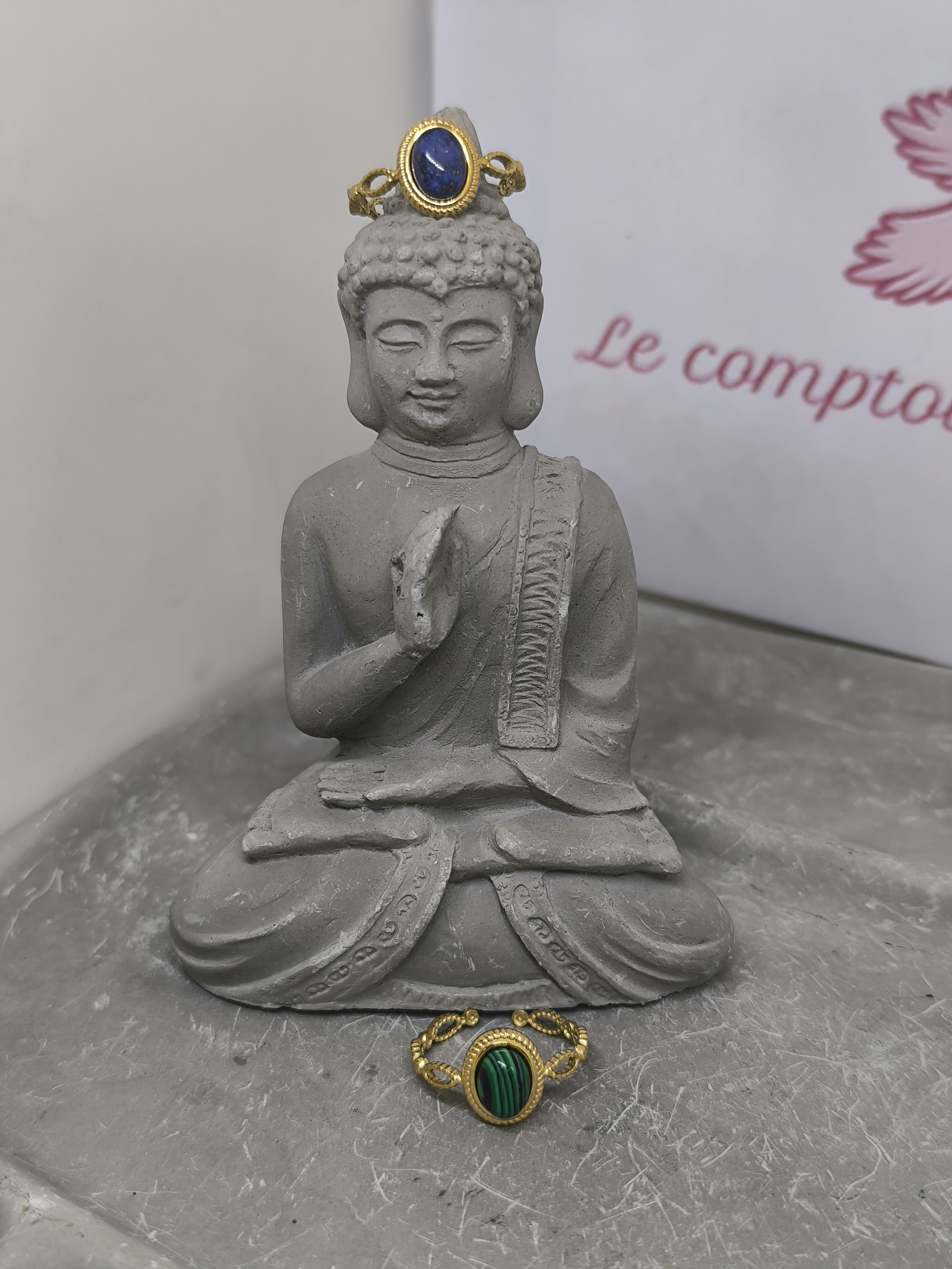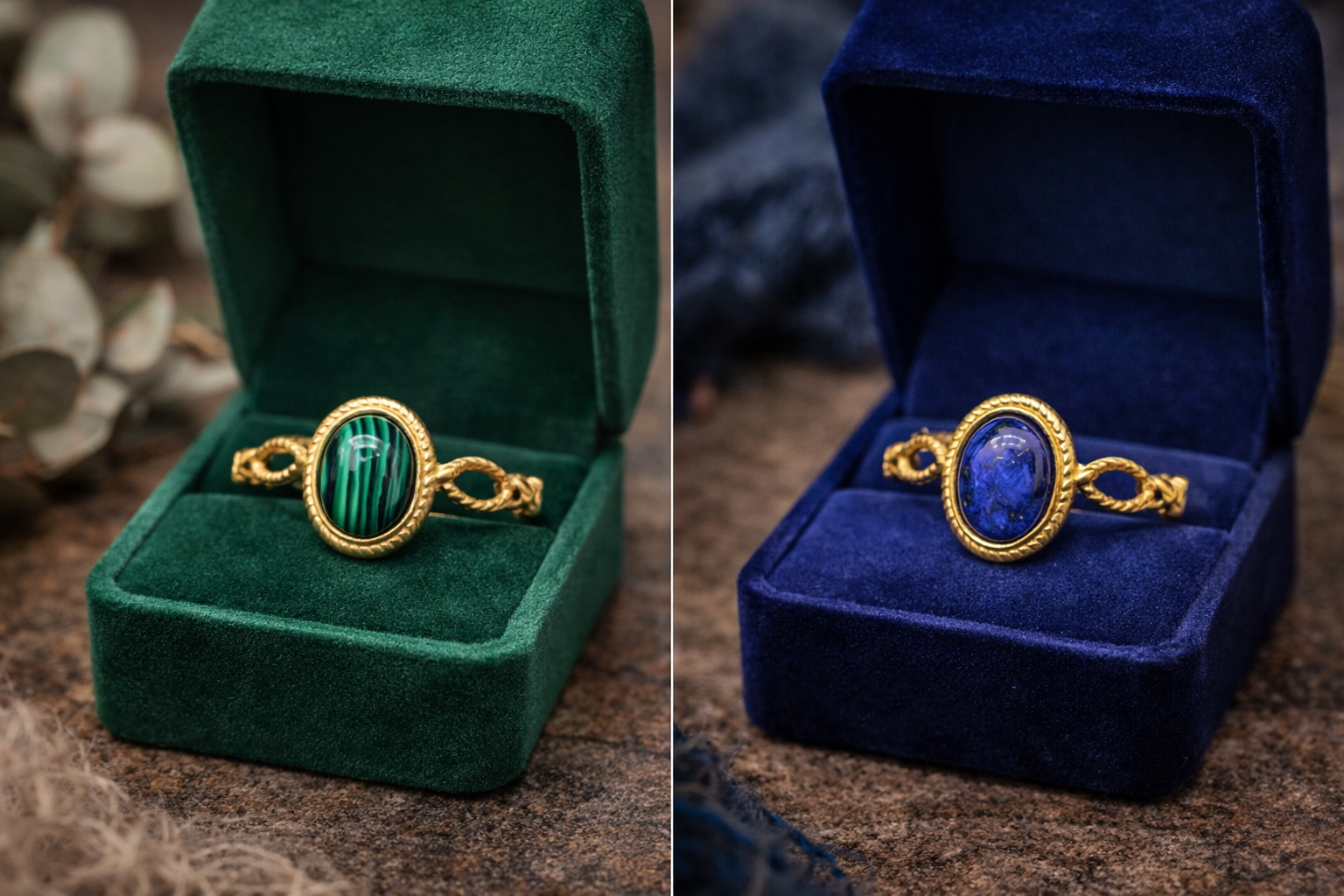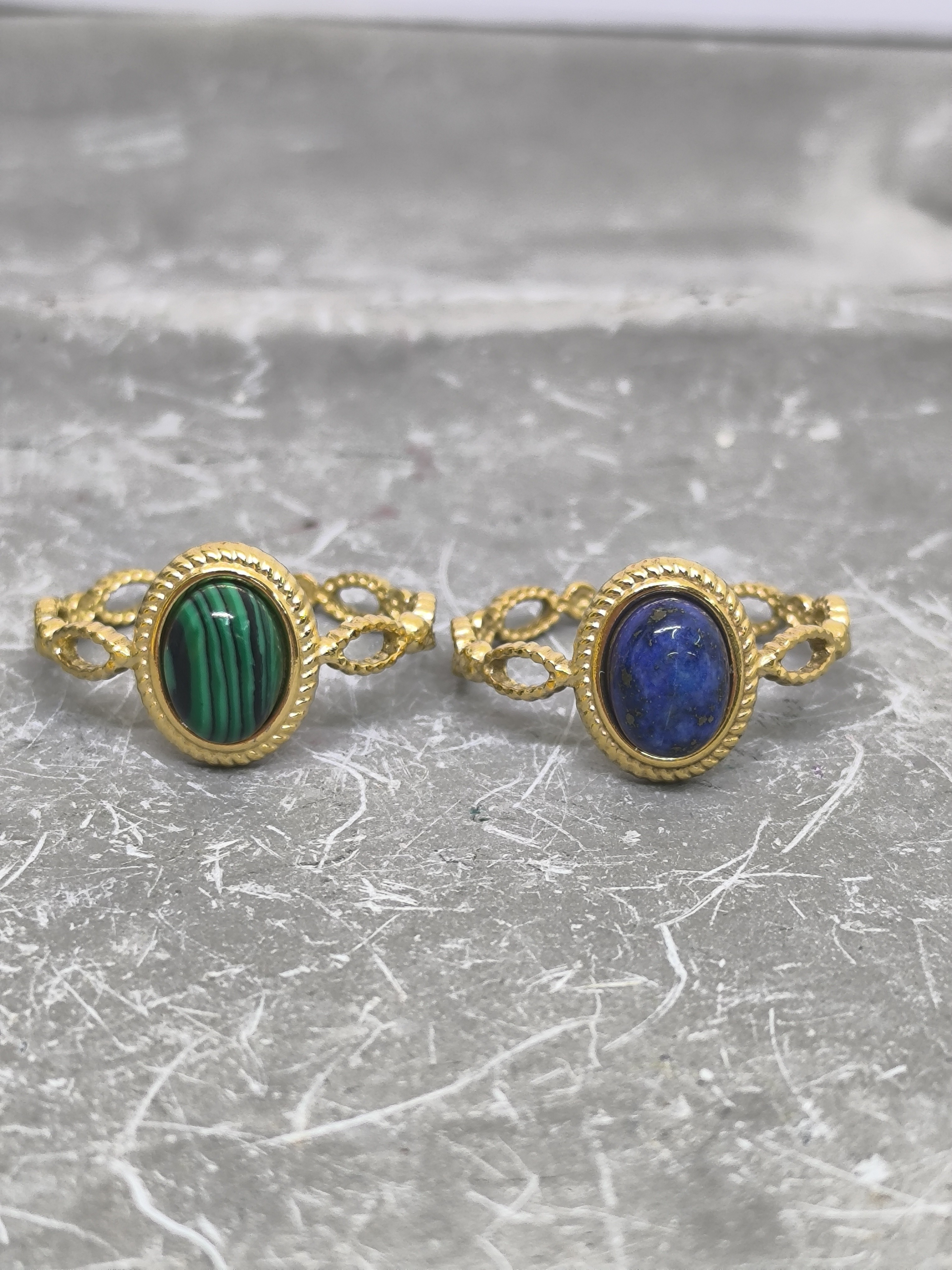 Apportez une touche d’élégance et de caractère à votre style avec cette bague en acier inoxydable doré ajustable, ornée d’une pierre ovale imitation malachite ou imitation lapis lazuli.