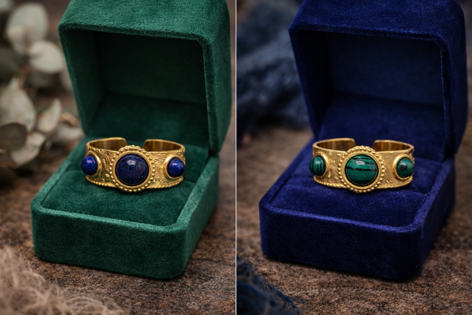 Apportez une touche d’élégance et de caractère à votre style avec cette bague en acier inoxydable doré ajustable, ornée d’une pierre ovale imitation malachite ou imitation lapis lazuli.