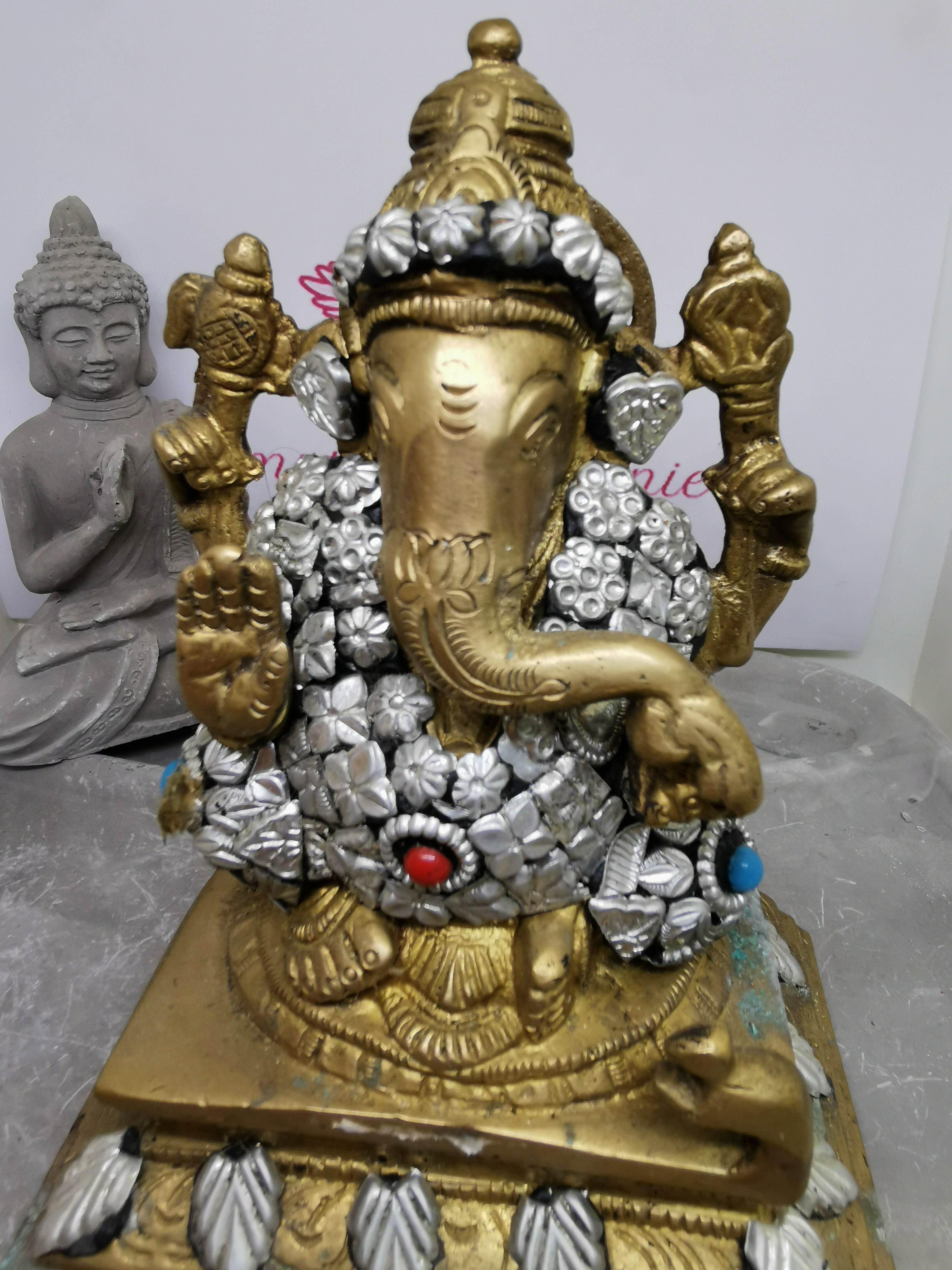 Les détails travaillés, les ornements argentés et les touches colorées mettent en valeur la richesse symbolique de Ganesh et lui confèrent un aspect à la fois traditionnel et décoratif.