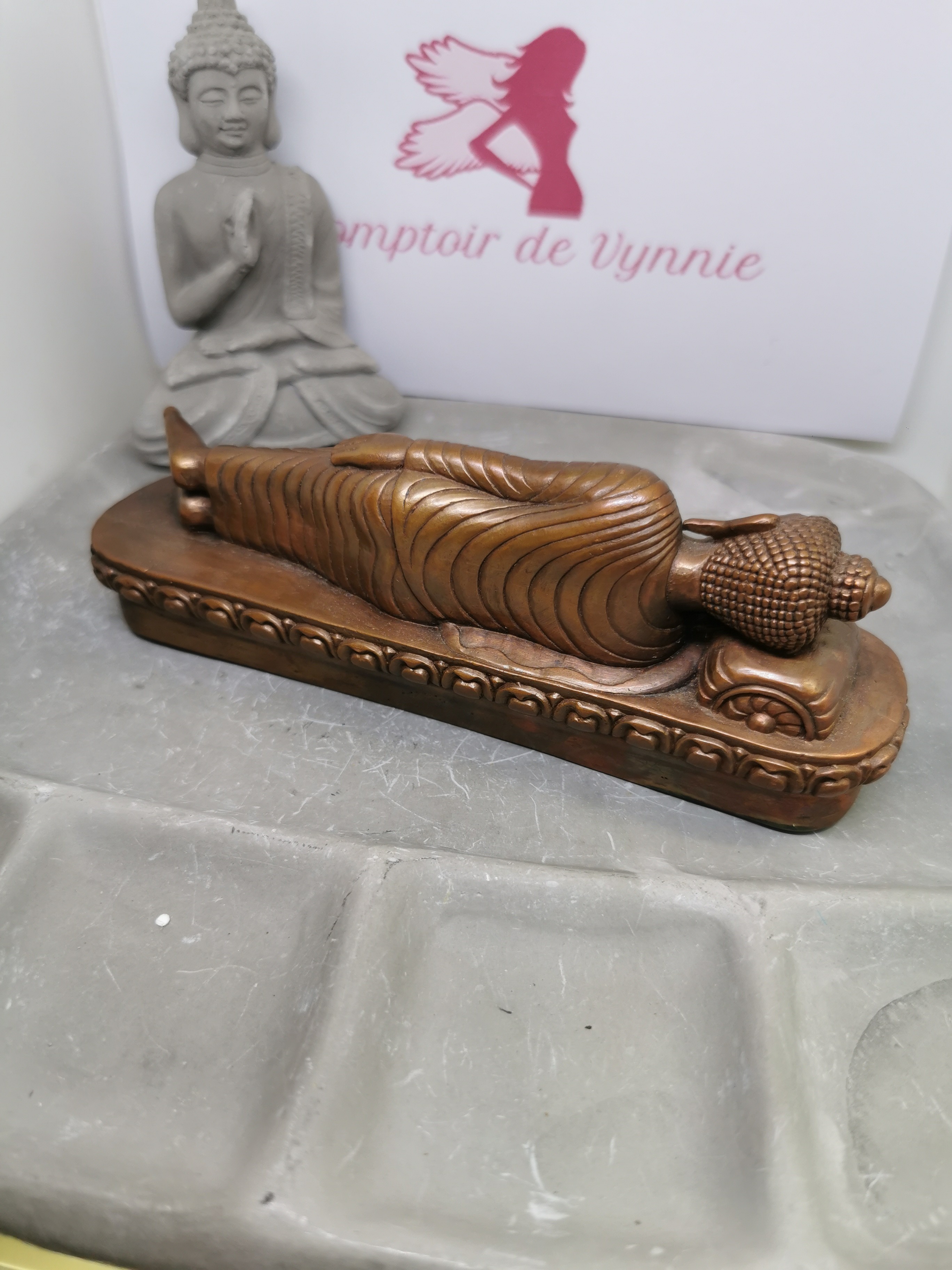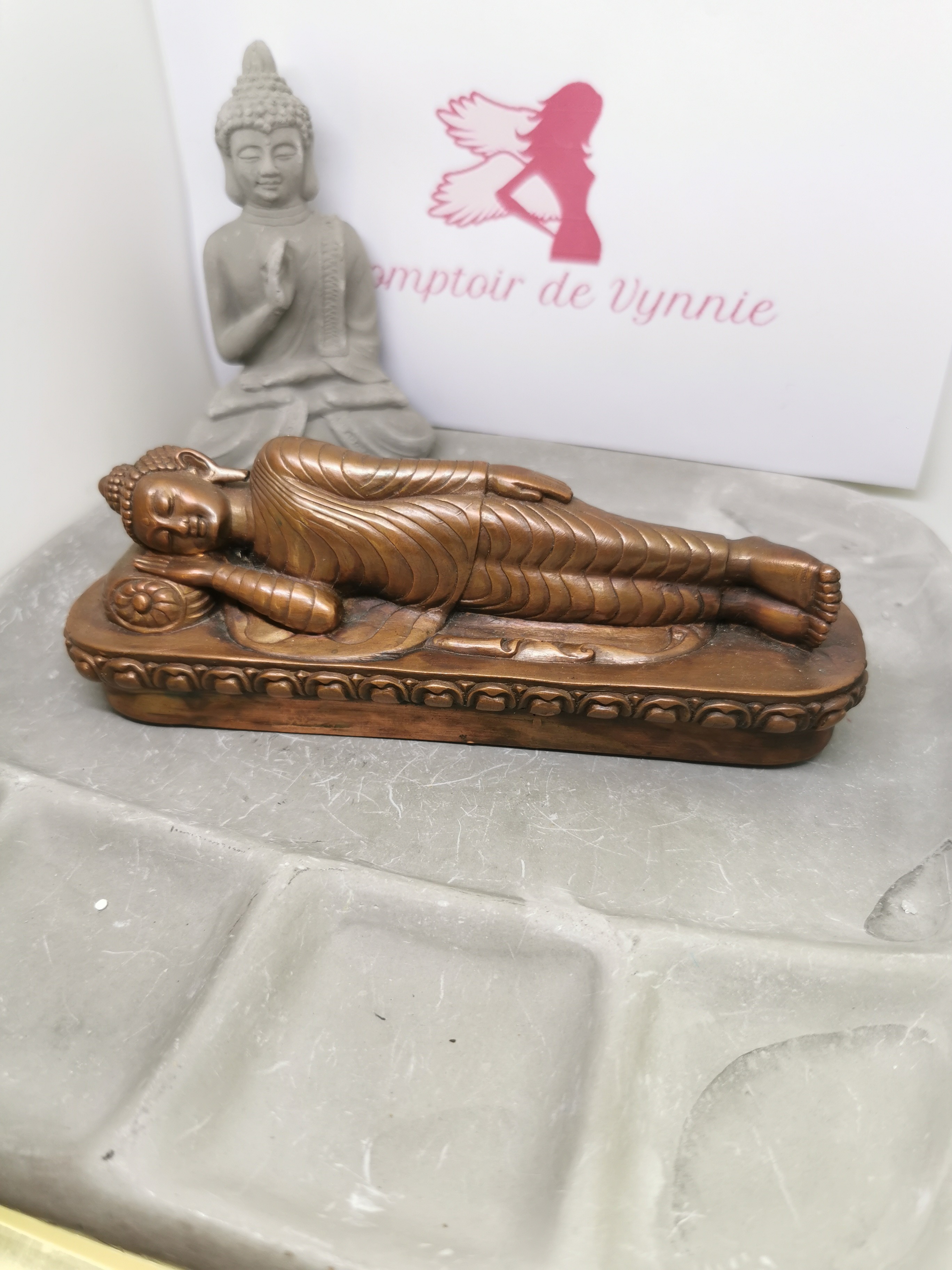 Les détails délicatement sculptés soulignent la posture paisible du Bouddha allongé, symbole profond de sagesse et d’accomplissement spirituel.