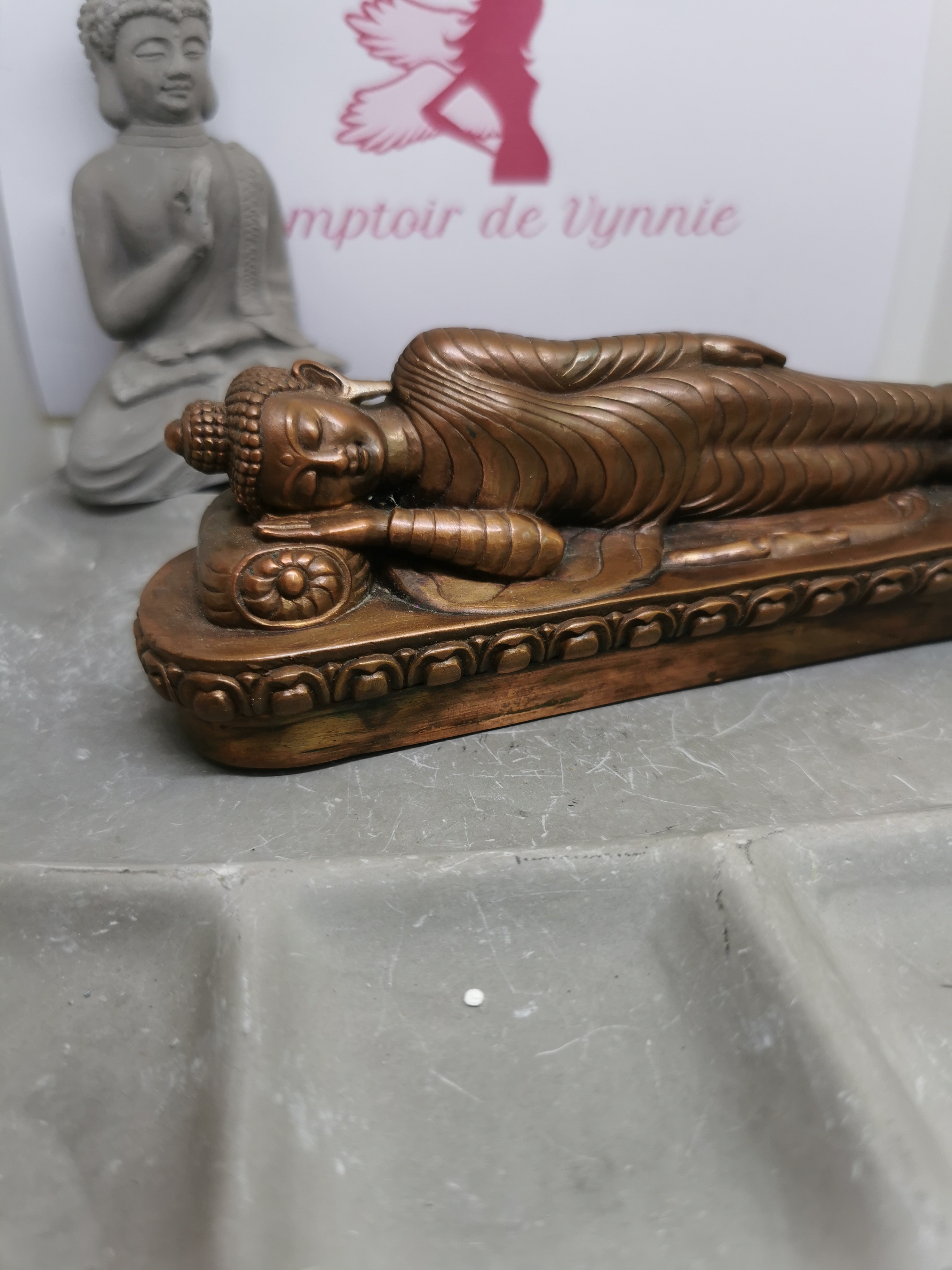 Apportez une atmosphère de sérénité et d’harmonie à votre intérieur avec cette magnifique statue de Bouddha couché en cuivre, entièrement réalisée en métal et finement décorée.