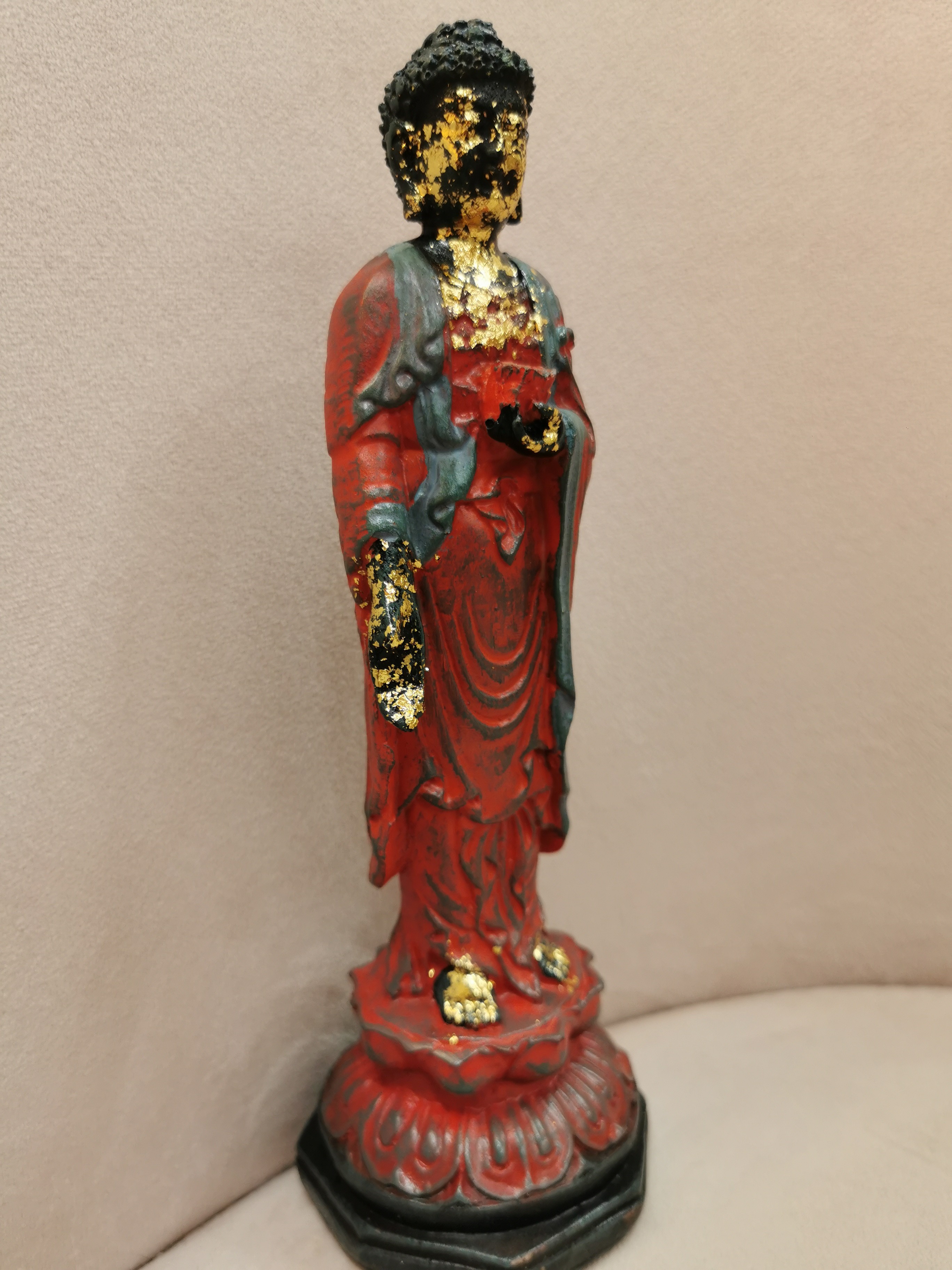 Elle représente Bouddha debout, vêtu d’un drapé rouge profond et gris patiné, rehaussé de délicats fragments de feuille d’or appliqués sur :