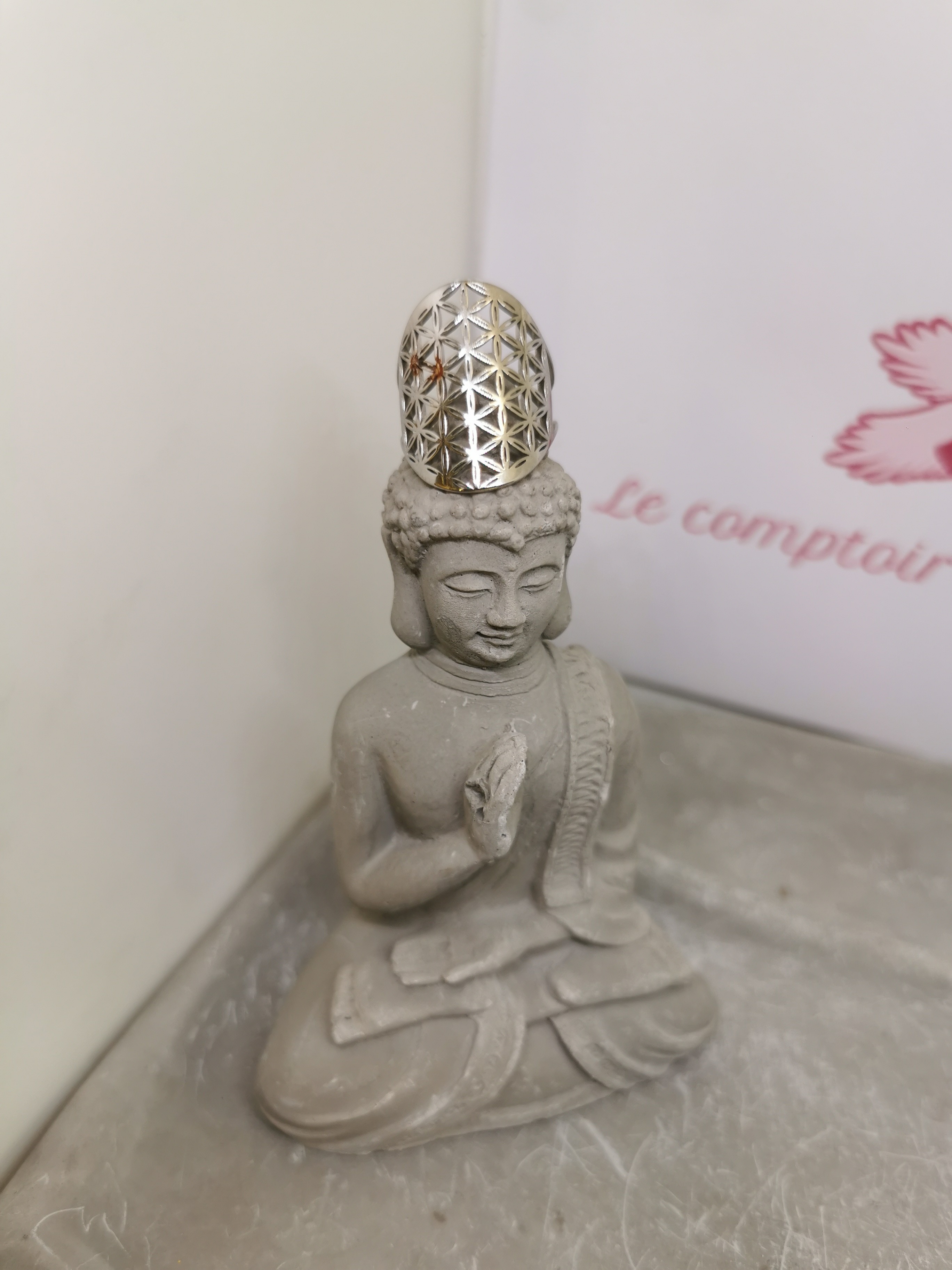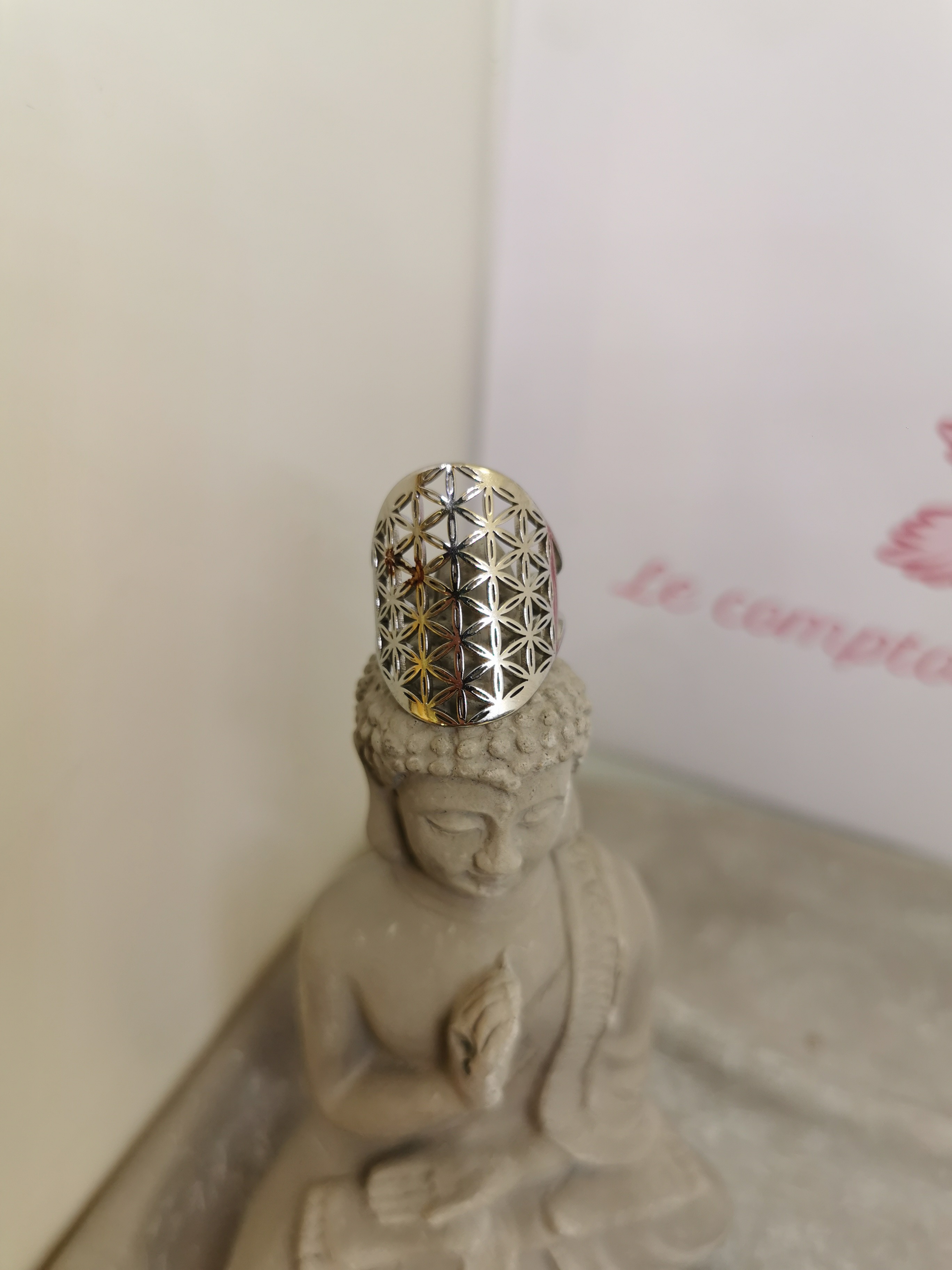 Cette bague Fleur de Vie en acier inoxydable couleur argent allie modernité, spiritualité et élégance.
