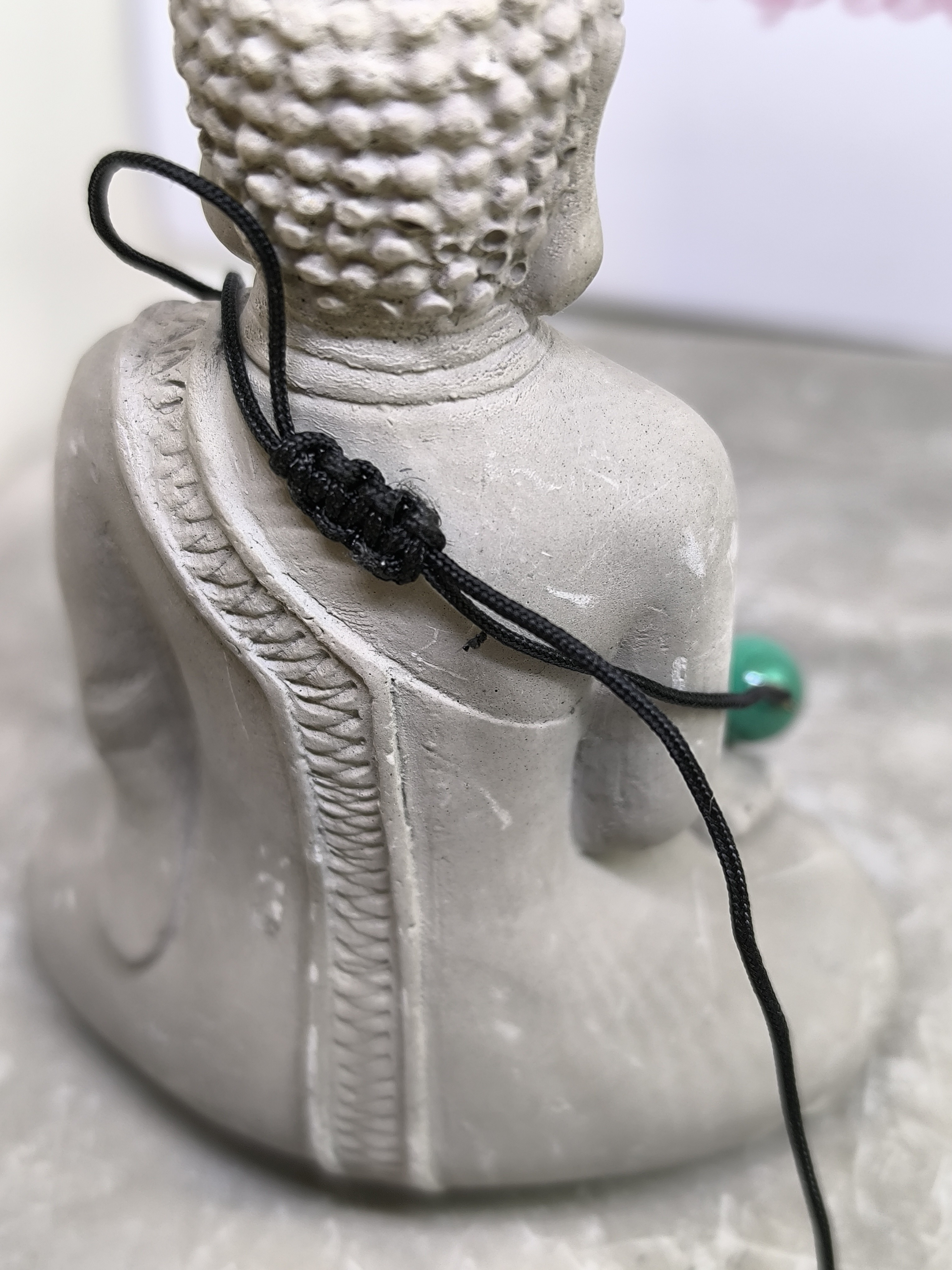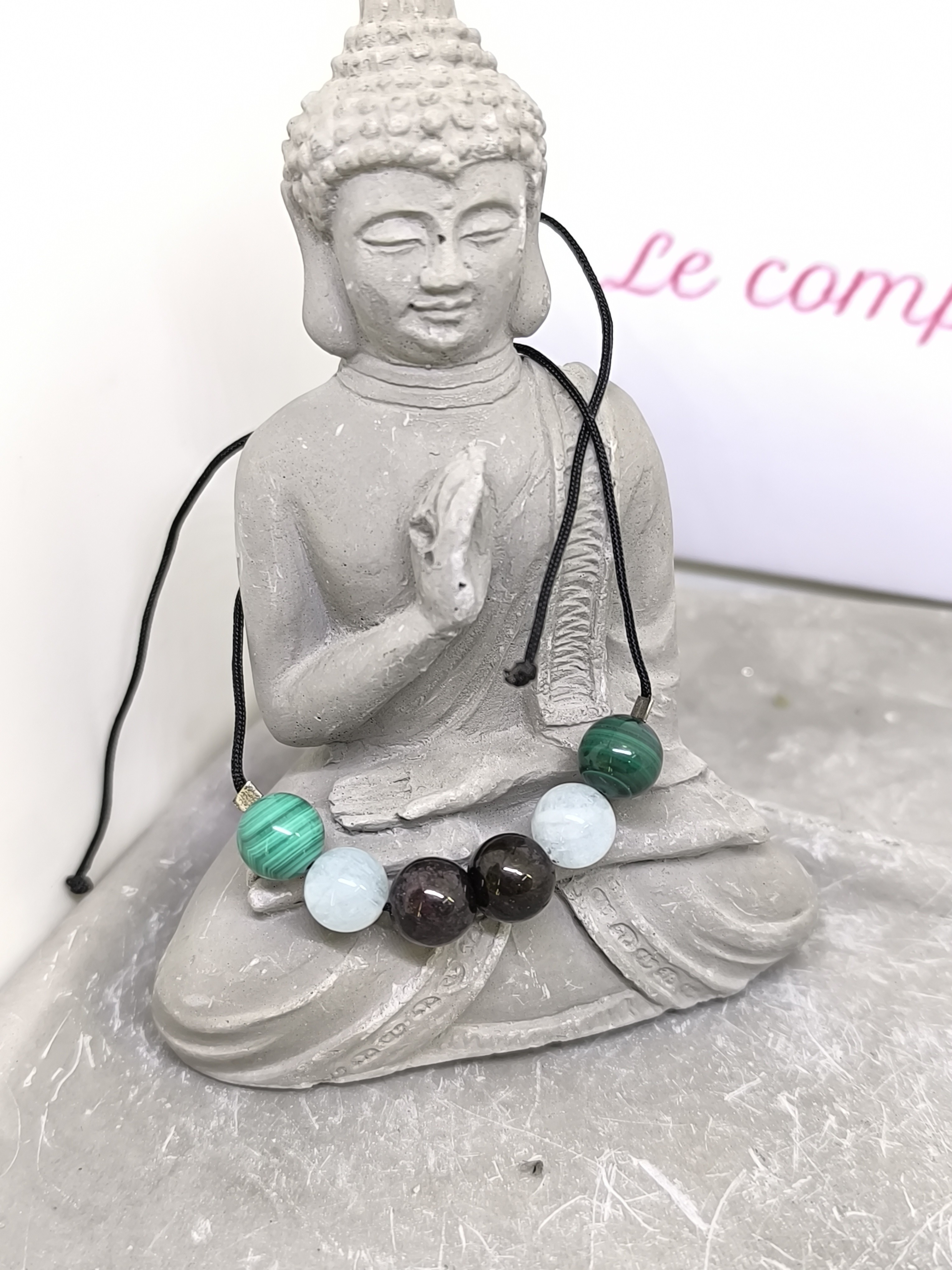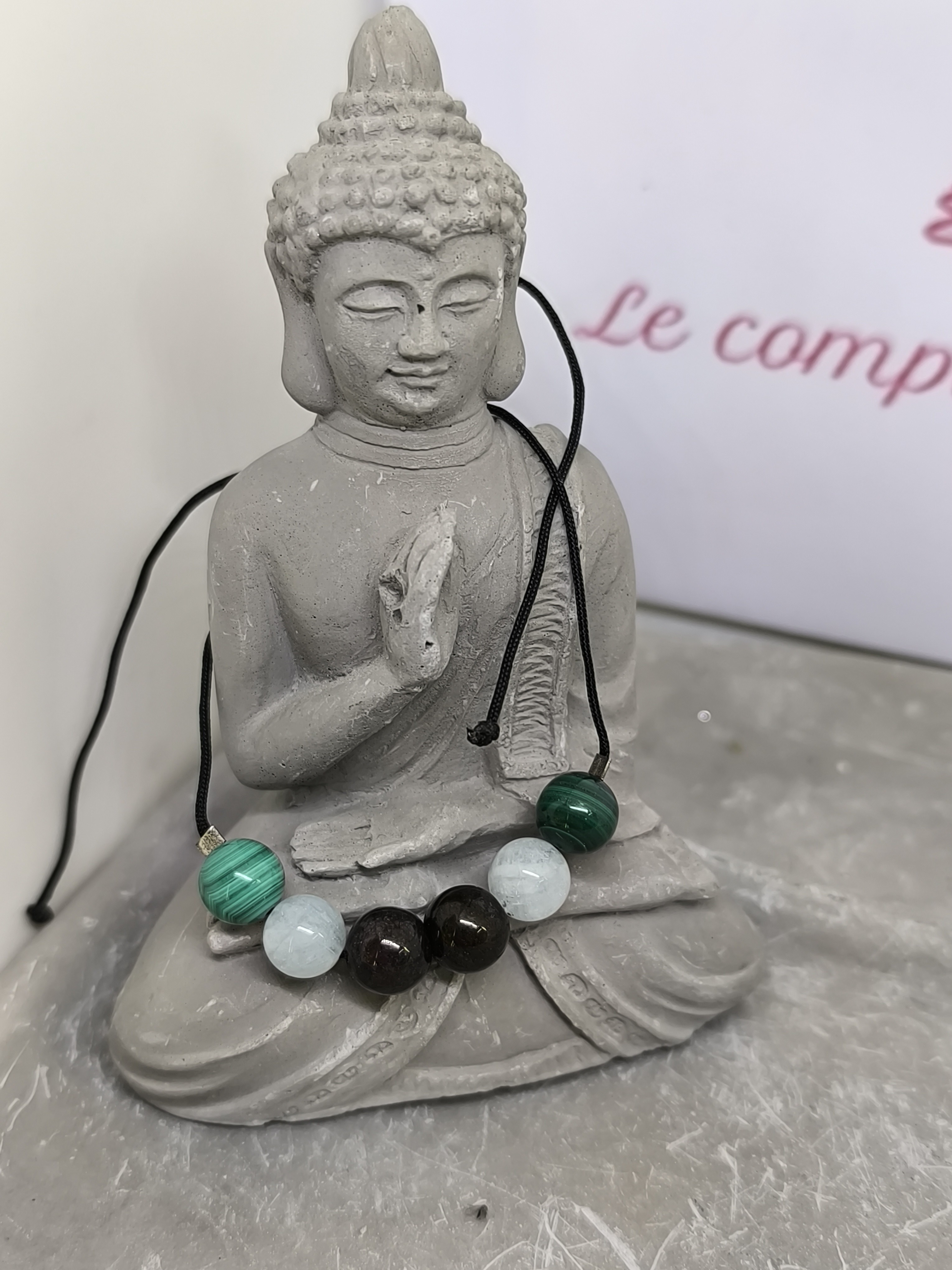 Ce bracelet est composé de perles naturelles de malachite, grenat et aigue-marine de 8mm, montées sur un cordon noir réglable.