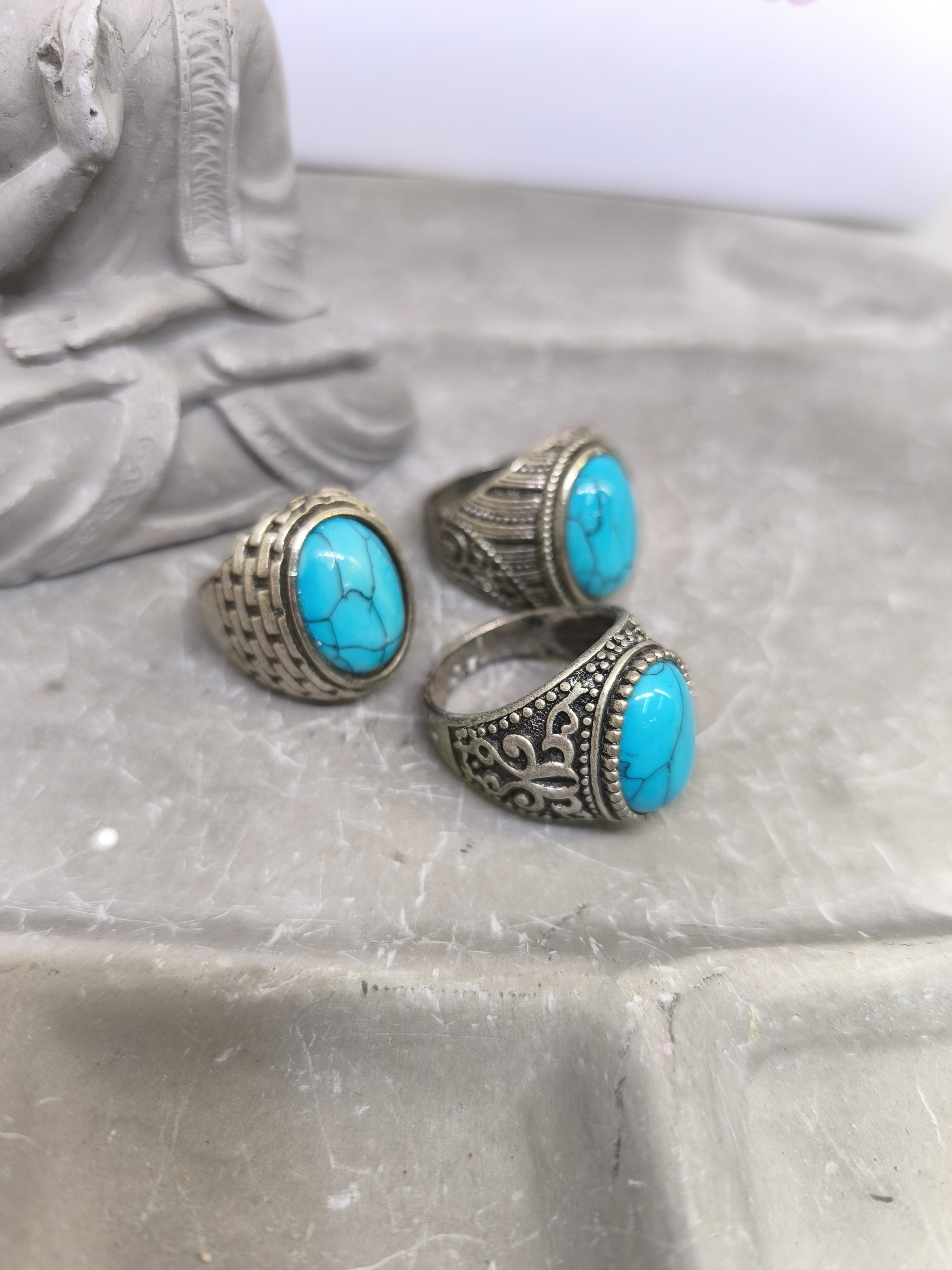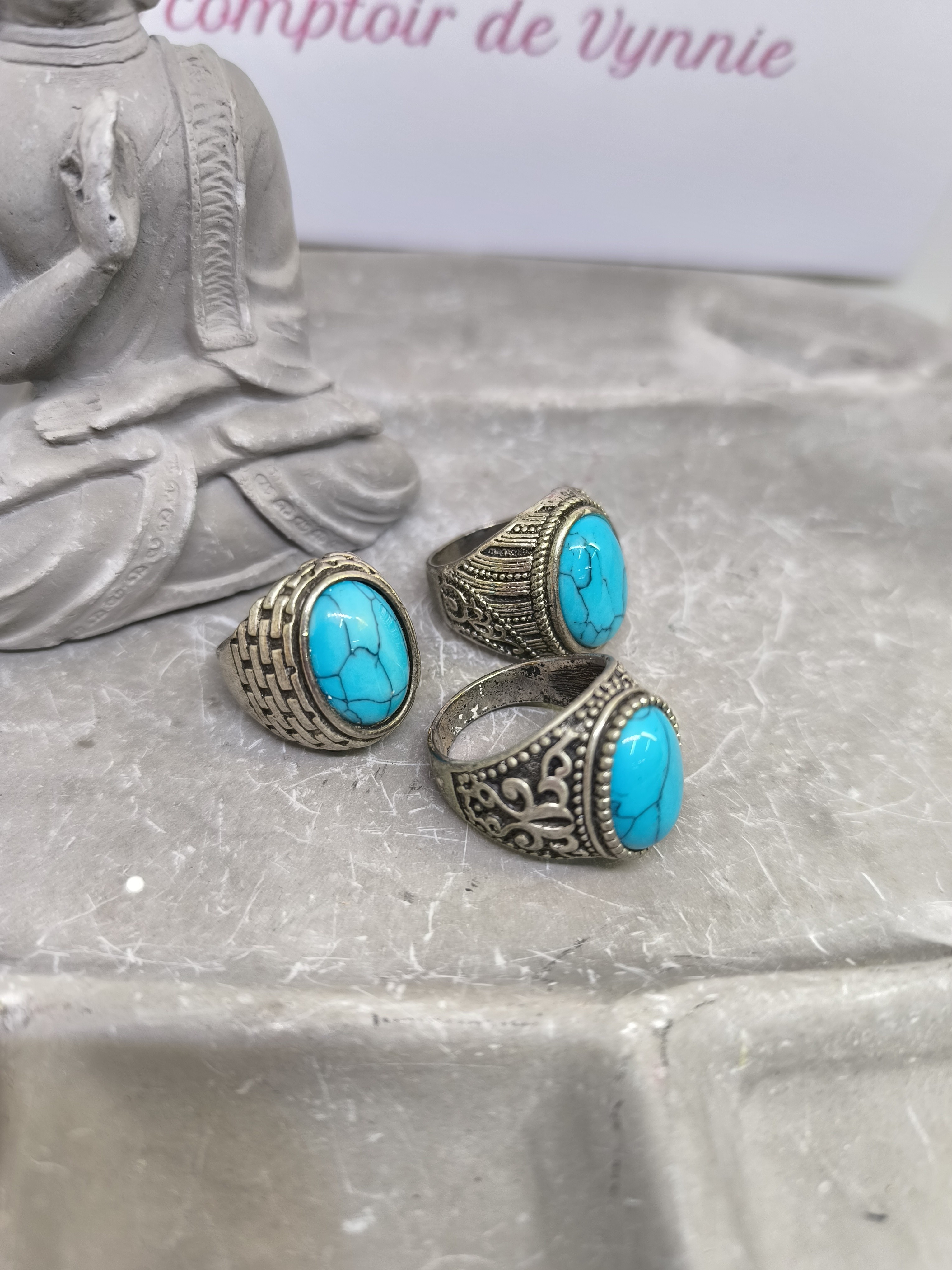 Affirmez votre personnalité avec cette bague masculine en acier inoxydable couleur argent, ornée en son centre d’une howlite teintée bleu intense, rappelant la turquoise par son veinage naturel.