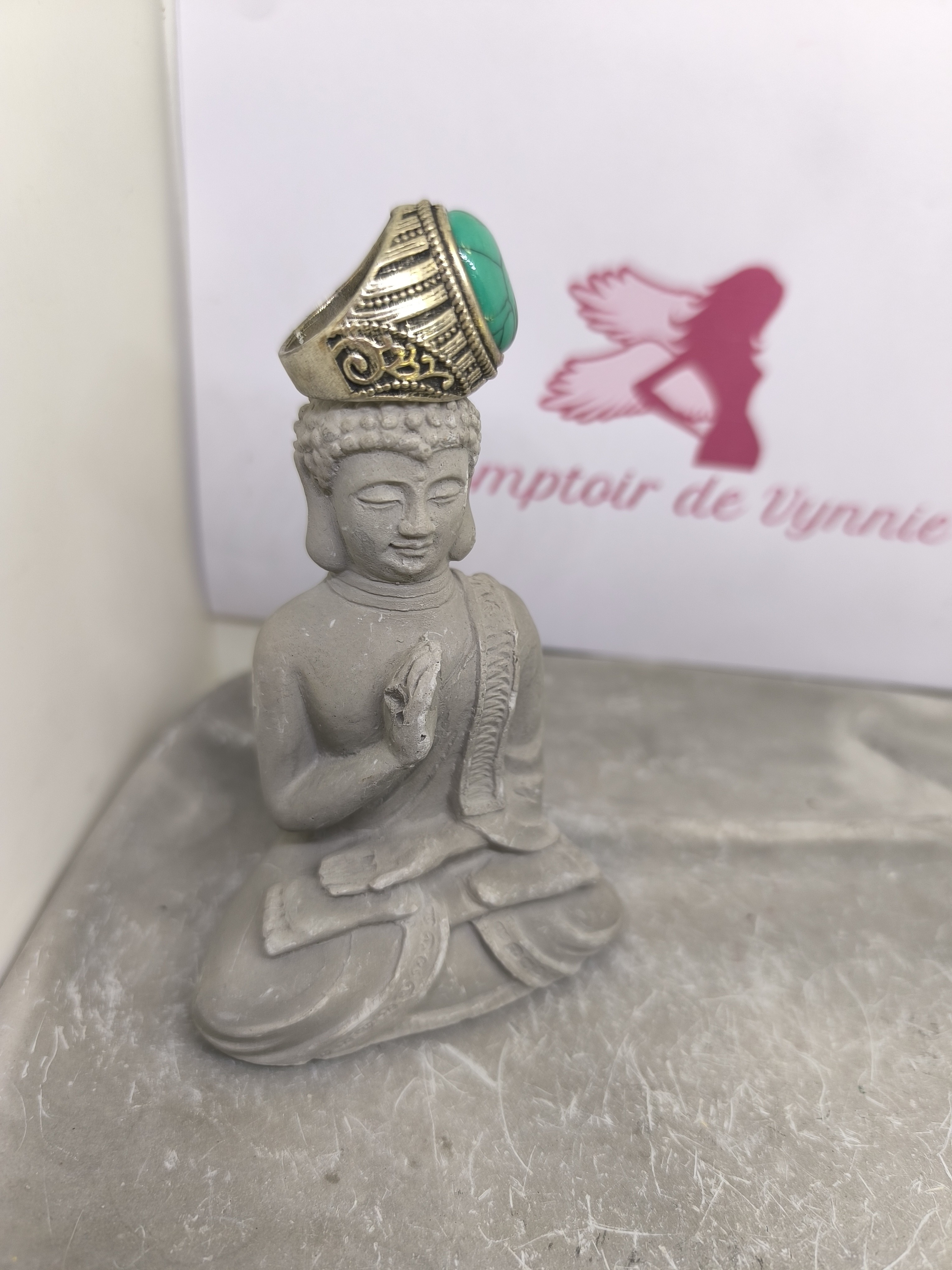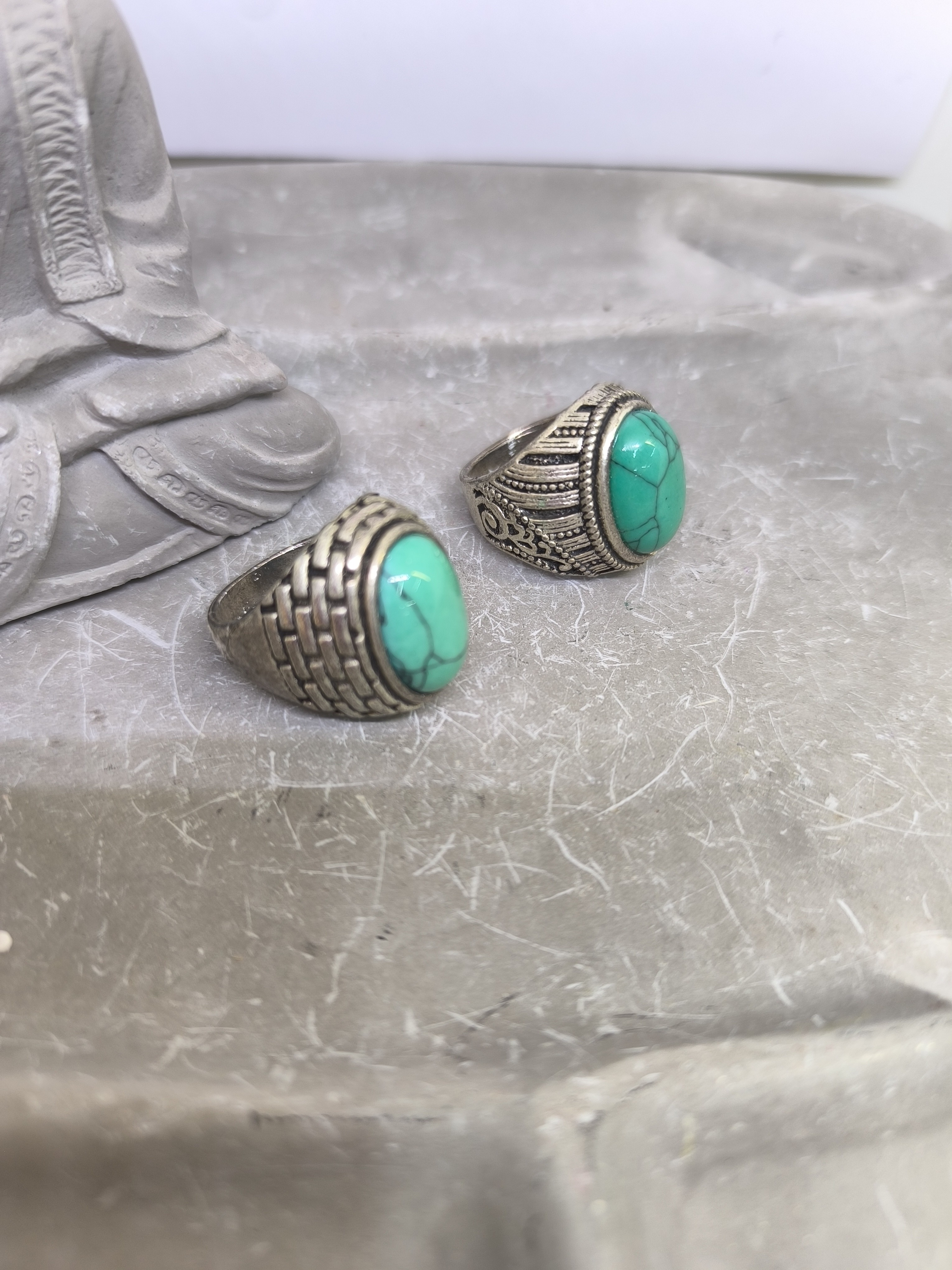 En son centre, une howlite teintée vert d’eau, lumineuse et veinée, apporte une touche fraîche et raffinée, rappelant la turquoise douce.