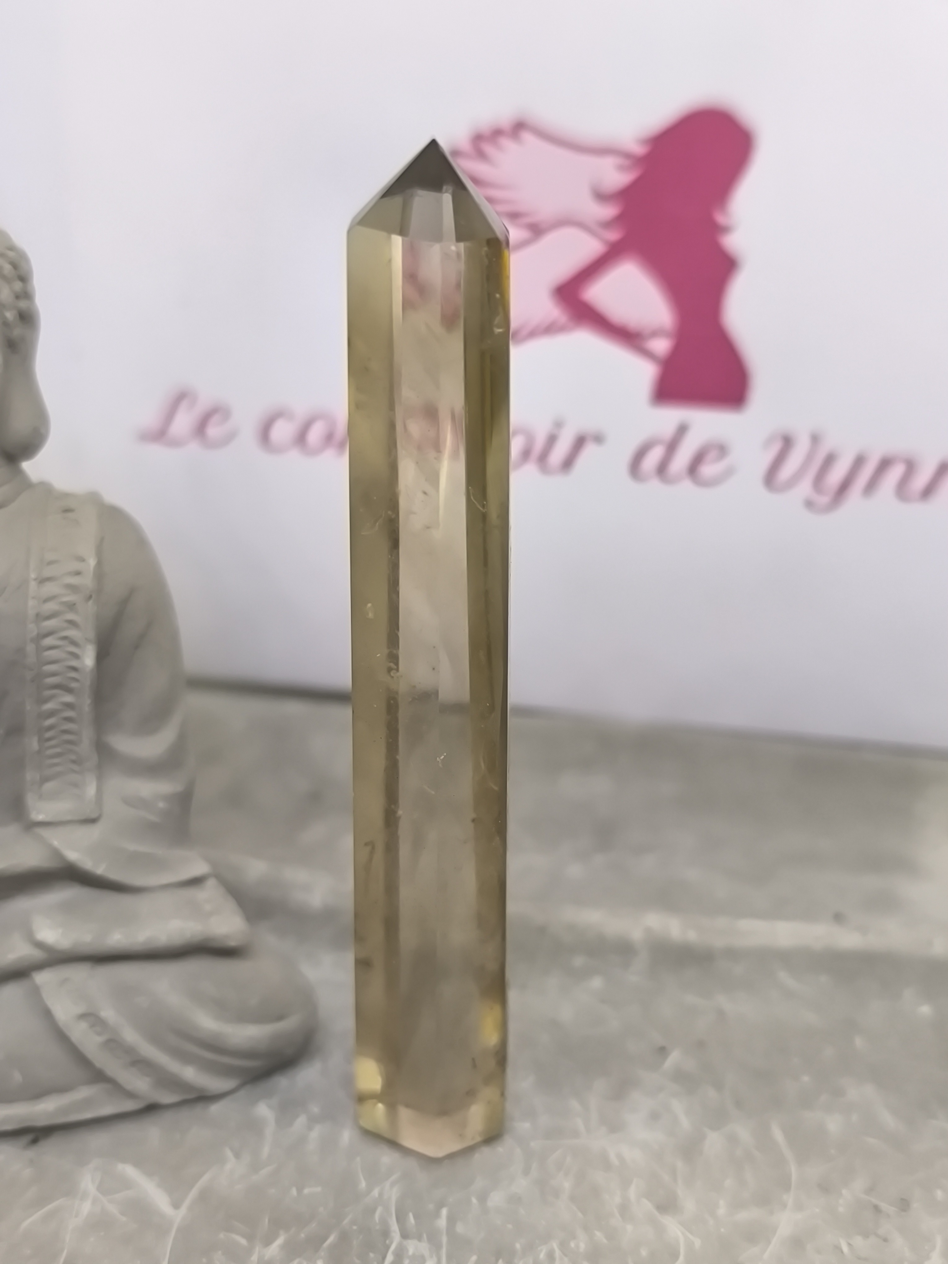 Cette magnifique citrine fumée naturelle, taillée en prisme / obélisque, mesure 10,4 cm de hauteur.