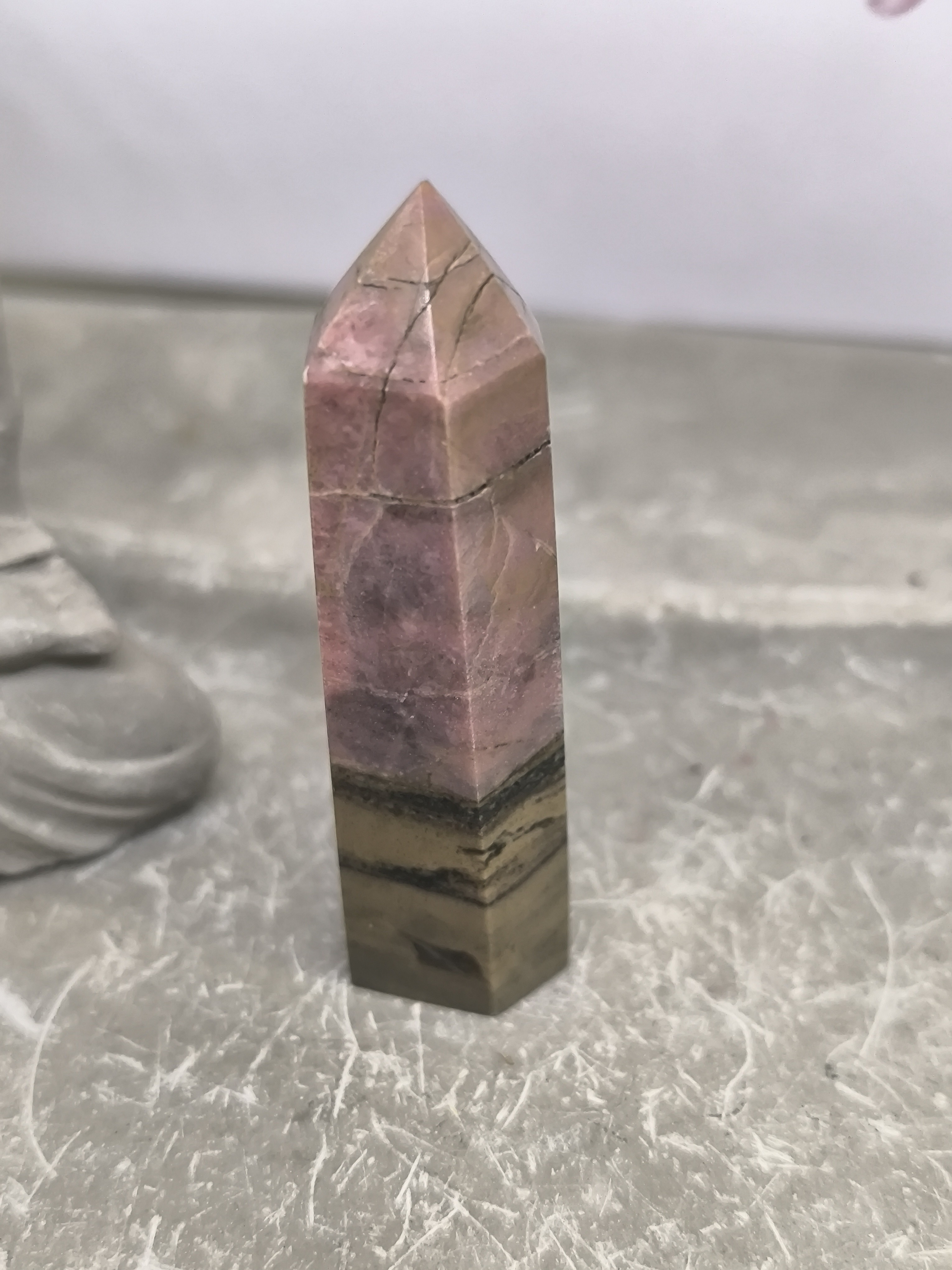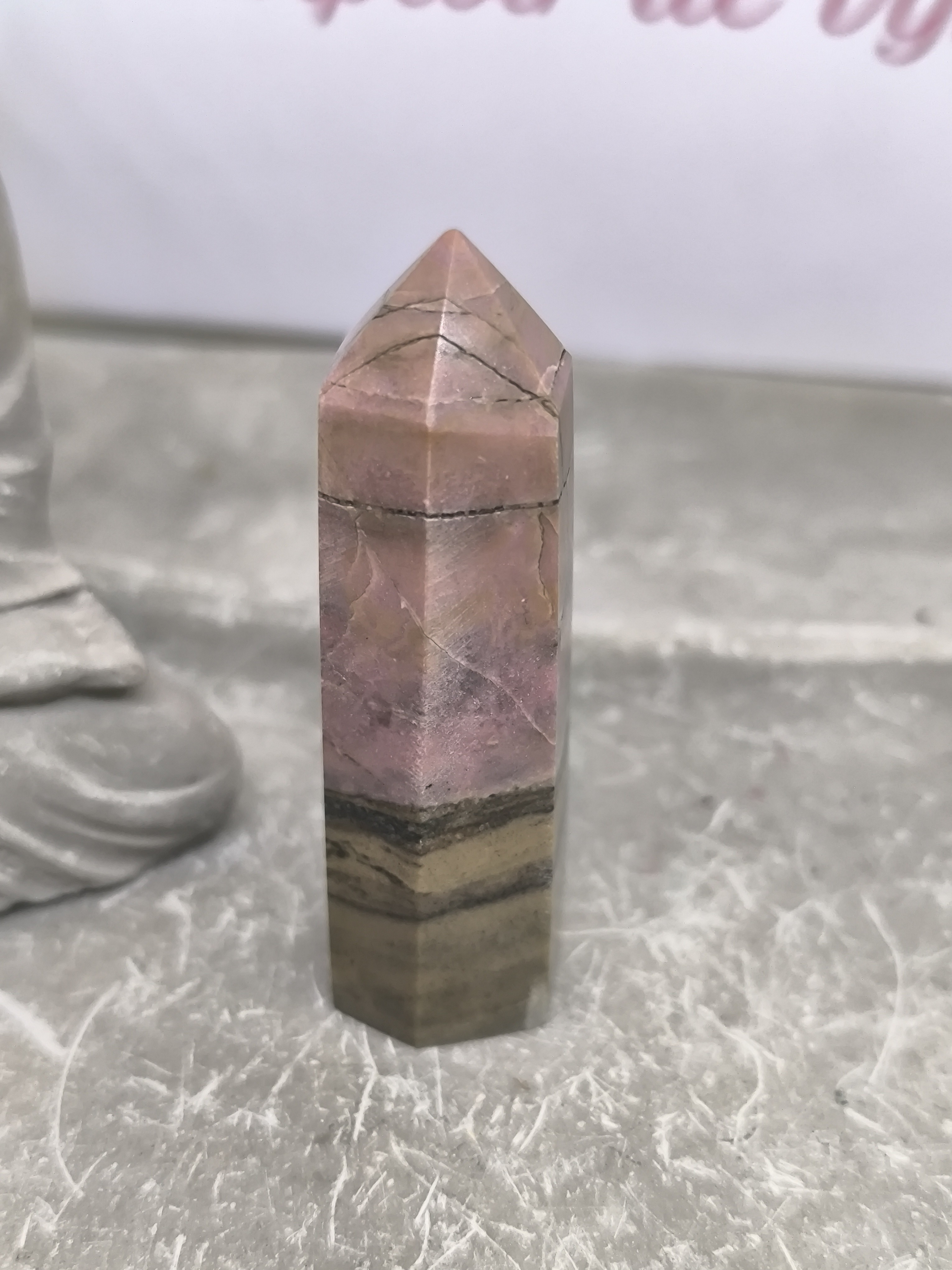 Cette magnifique rhodocrosite naturelle taillée en forme de prisme (obélisque) mesure 6 cm de hauteur.