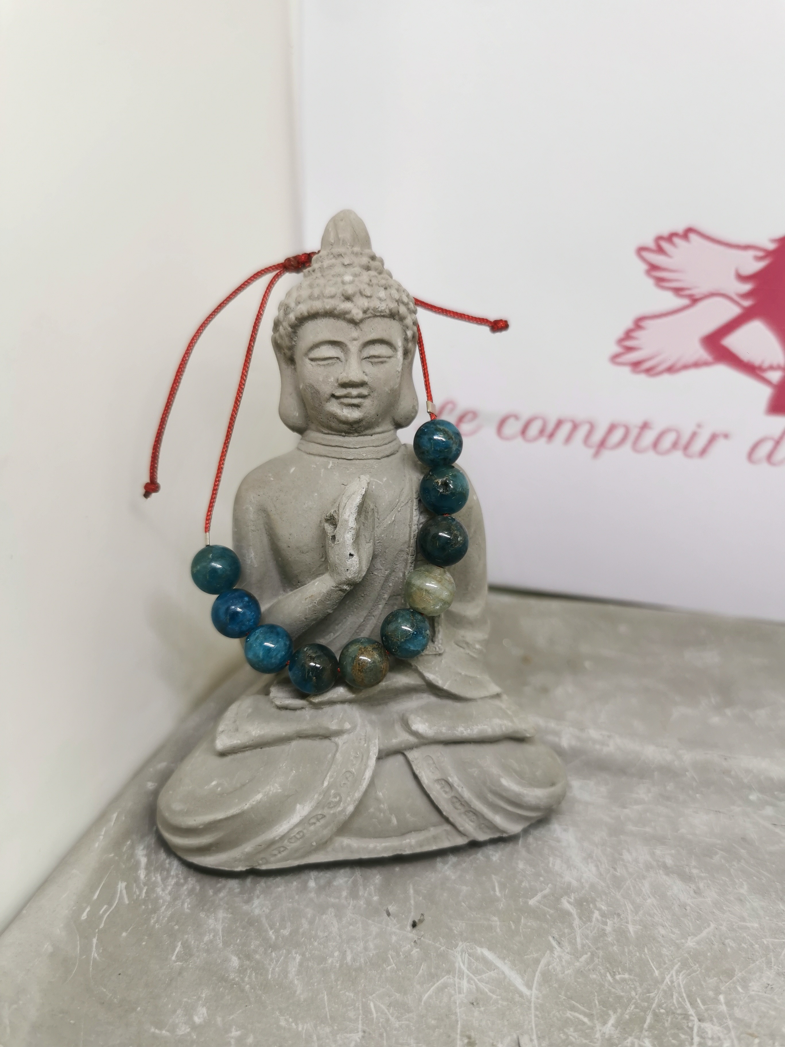 Ce bracelet est composé de 10 perles d’apatite naturelle de 8 mm, montées sur un cordon rouge ajustable grâce à son nœud coulissant.