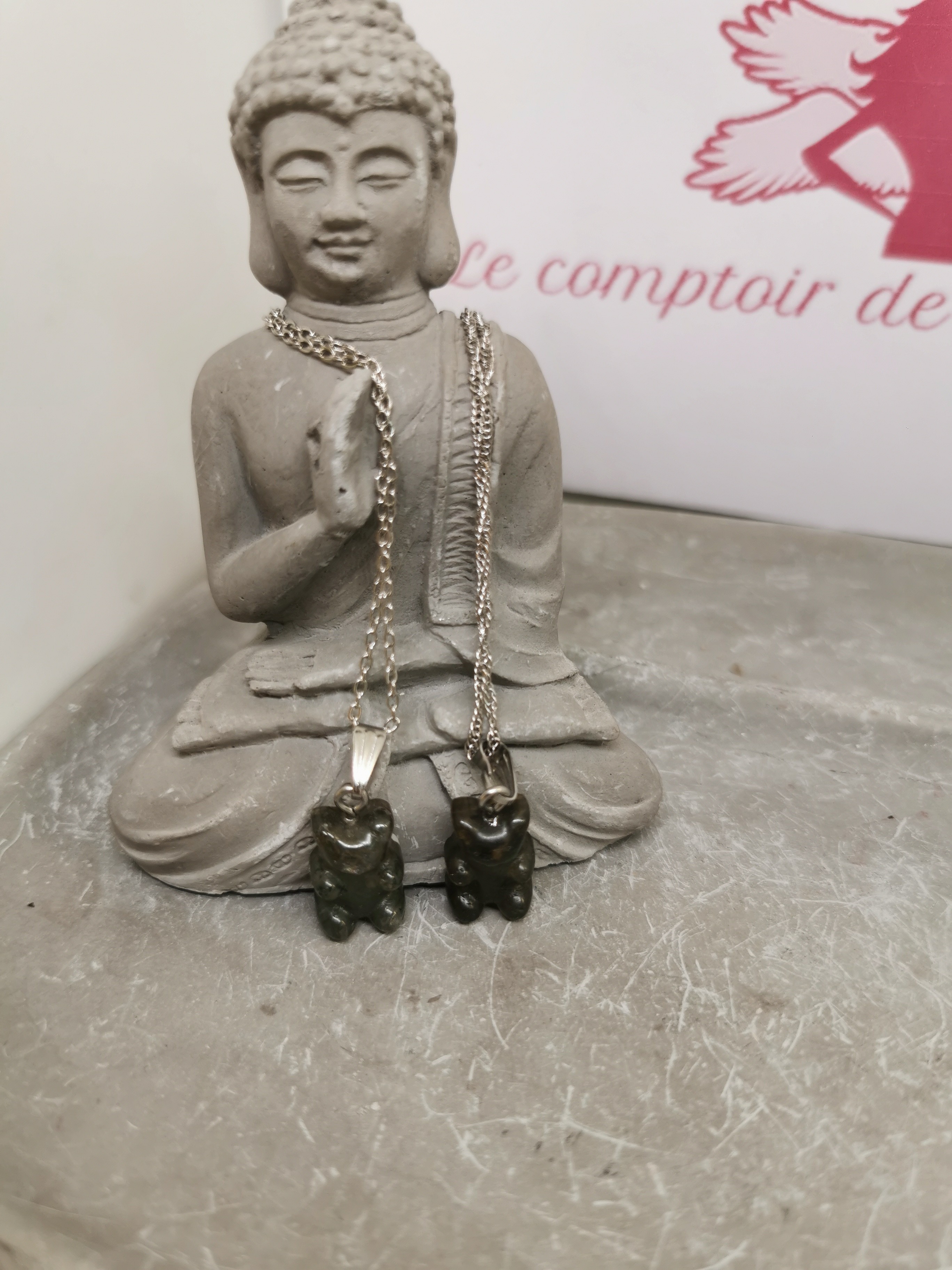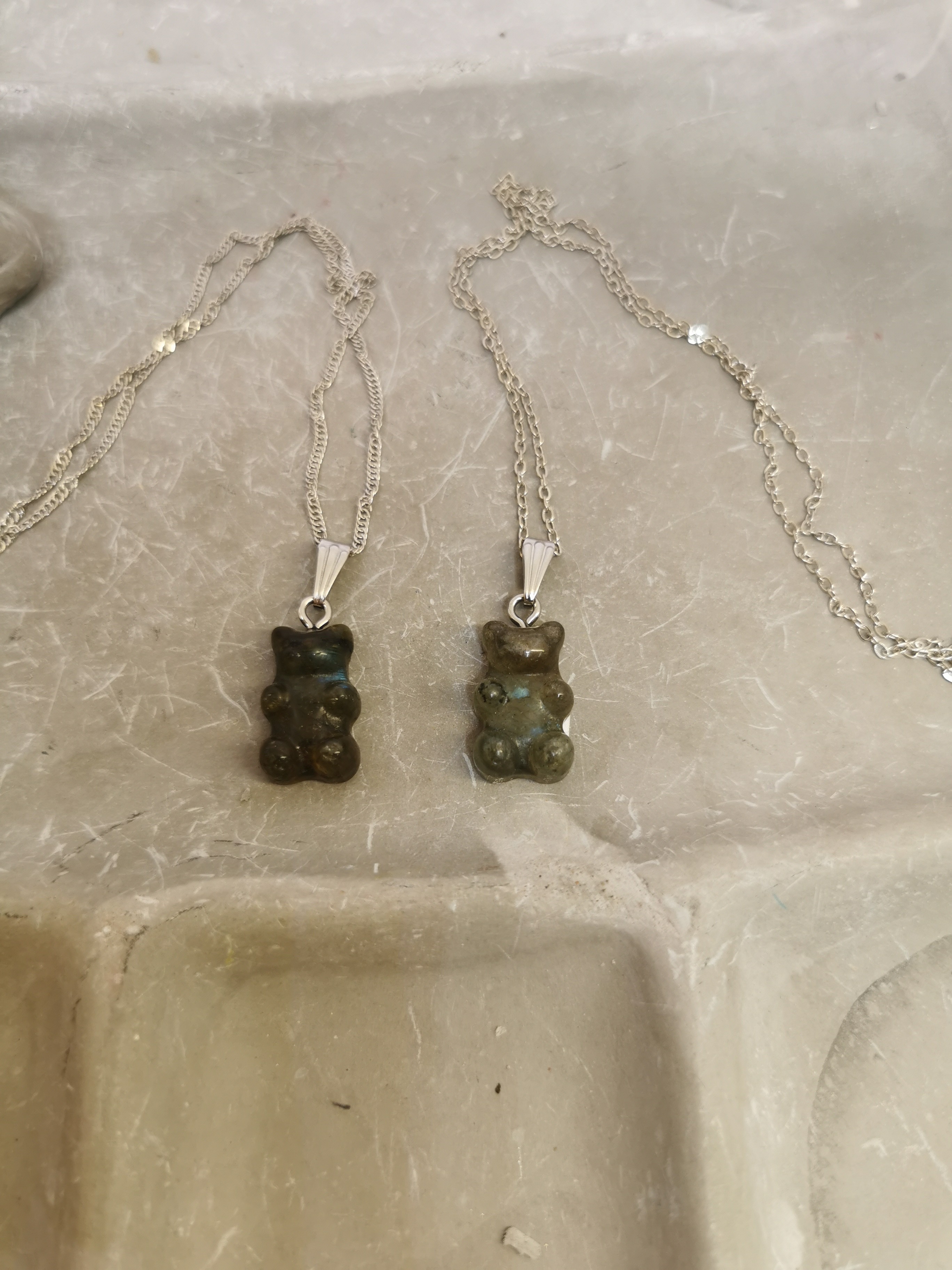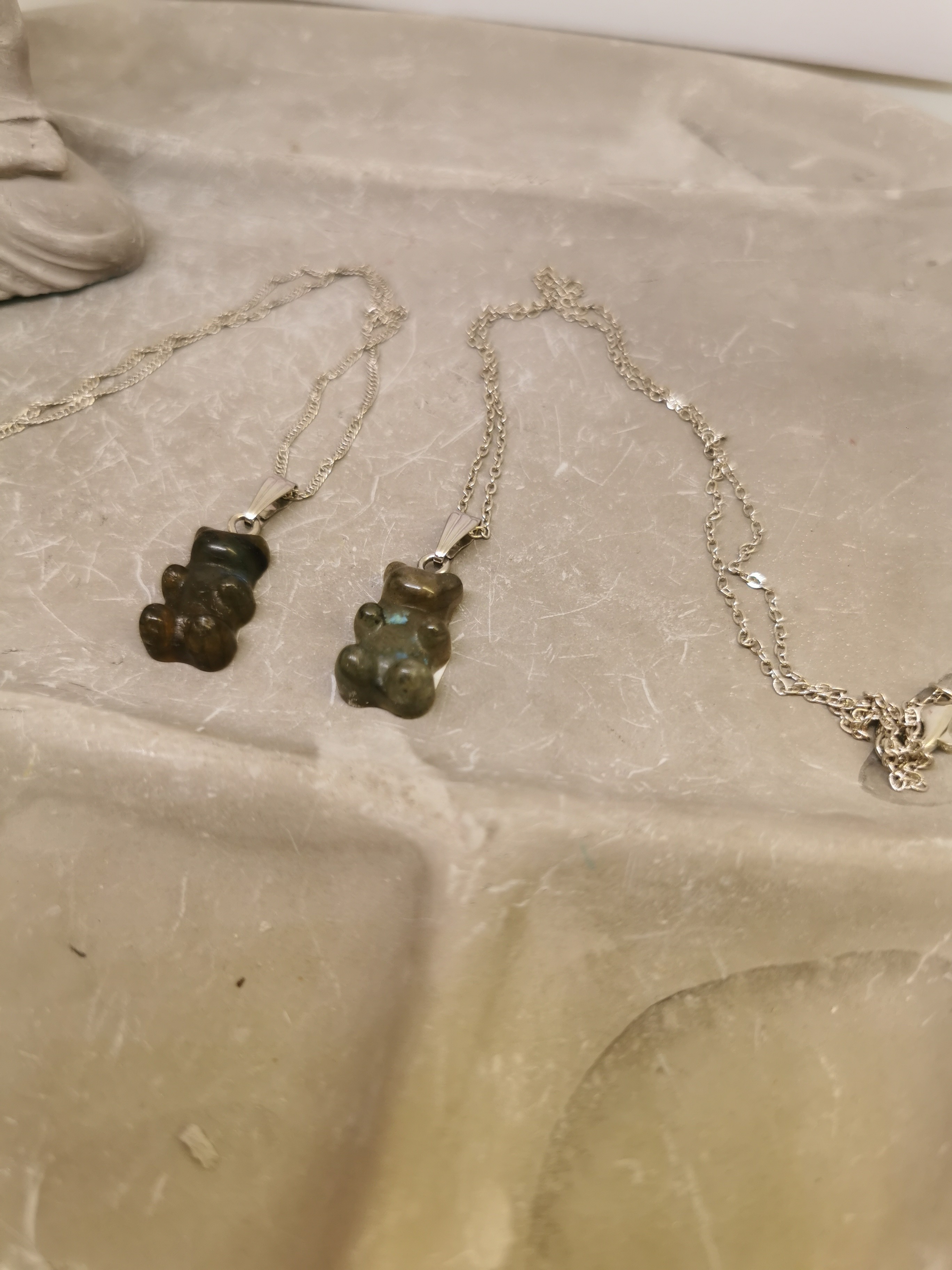 Ce collier délicat associe la douceur de la forme enfantine du petit nounours à la profondeur mystérieuse de la labradorite naturelle.