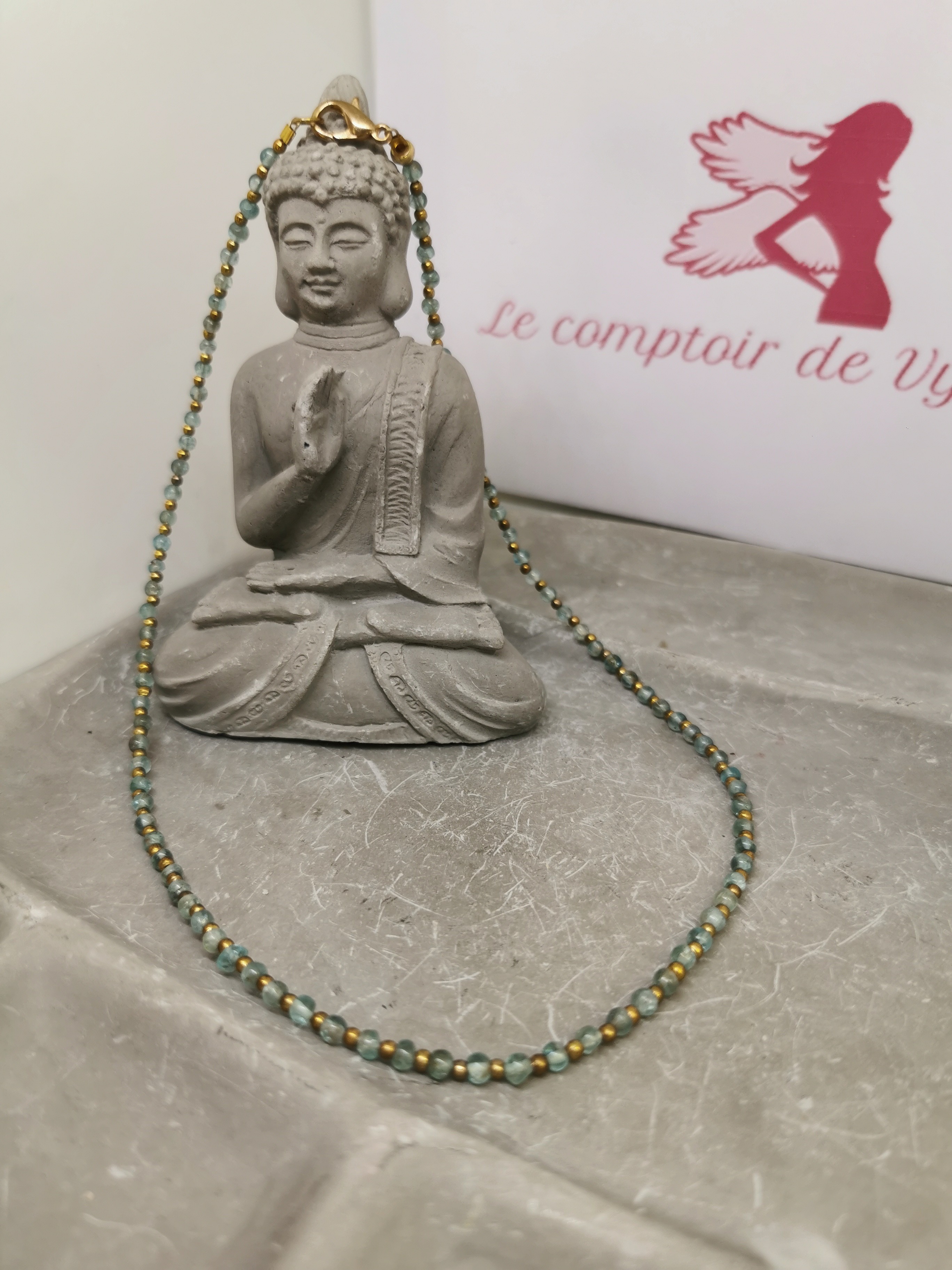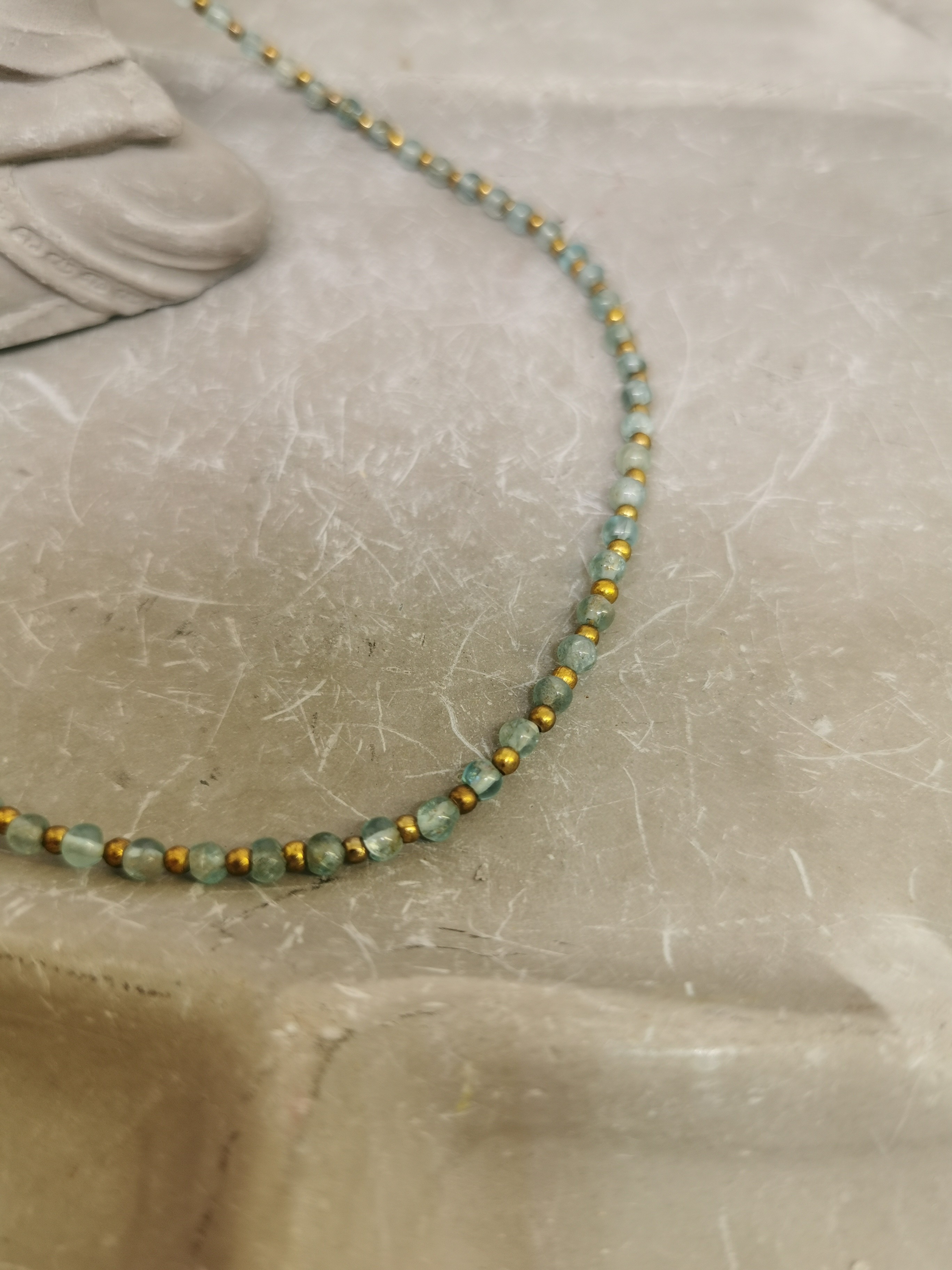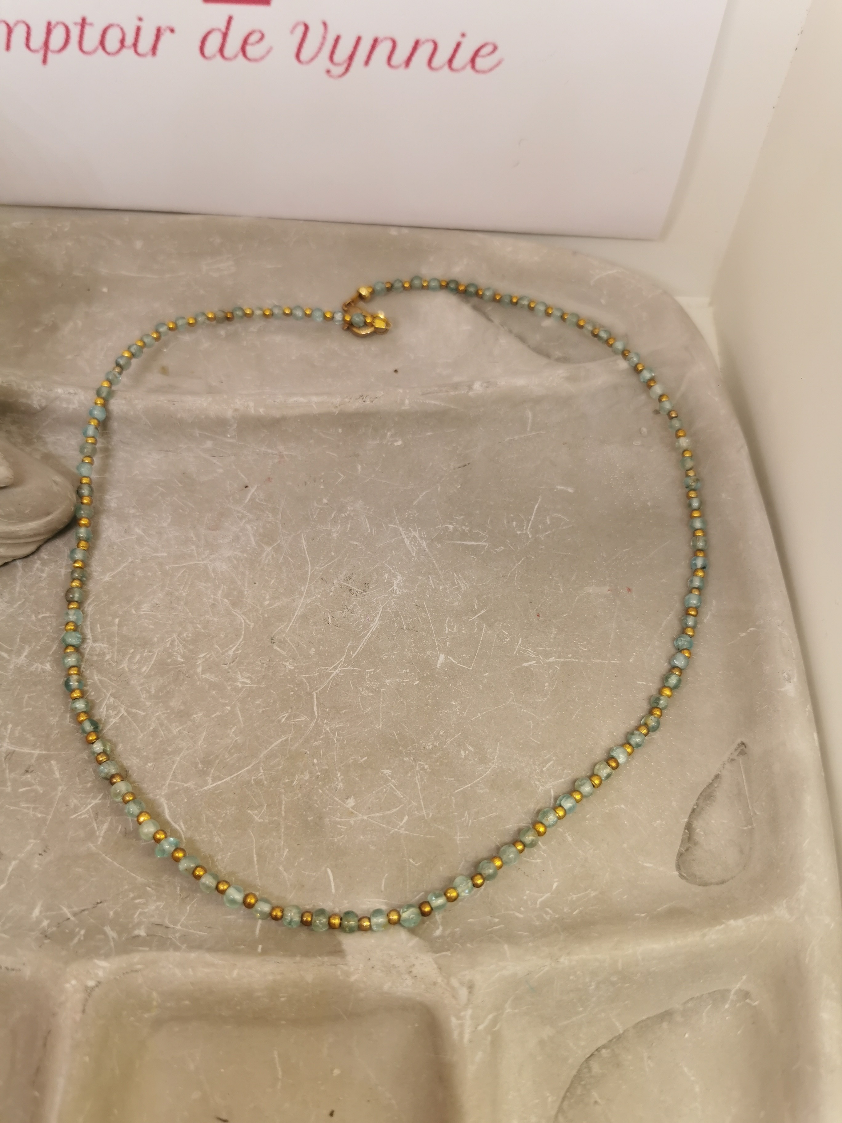 Ce collier délicat est composé de perles d’apatite naturelle aux nuances bleu-vert profondes, subtilement mises en valeur par de petites perles dorées intercalaires.