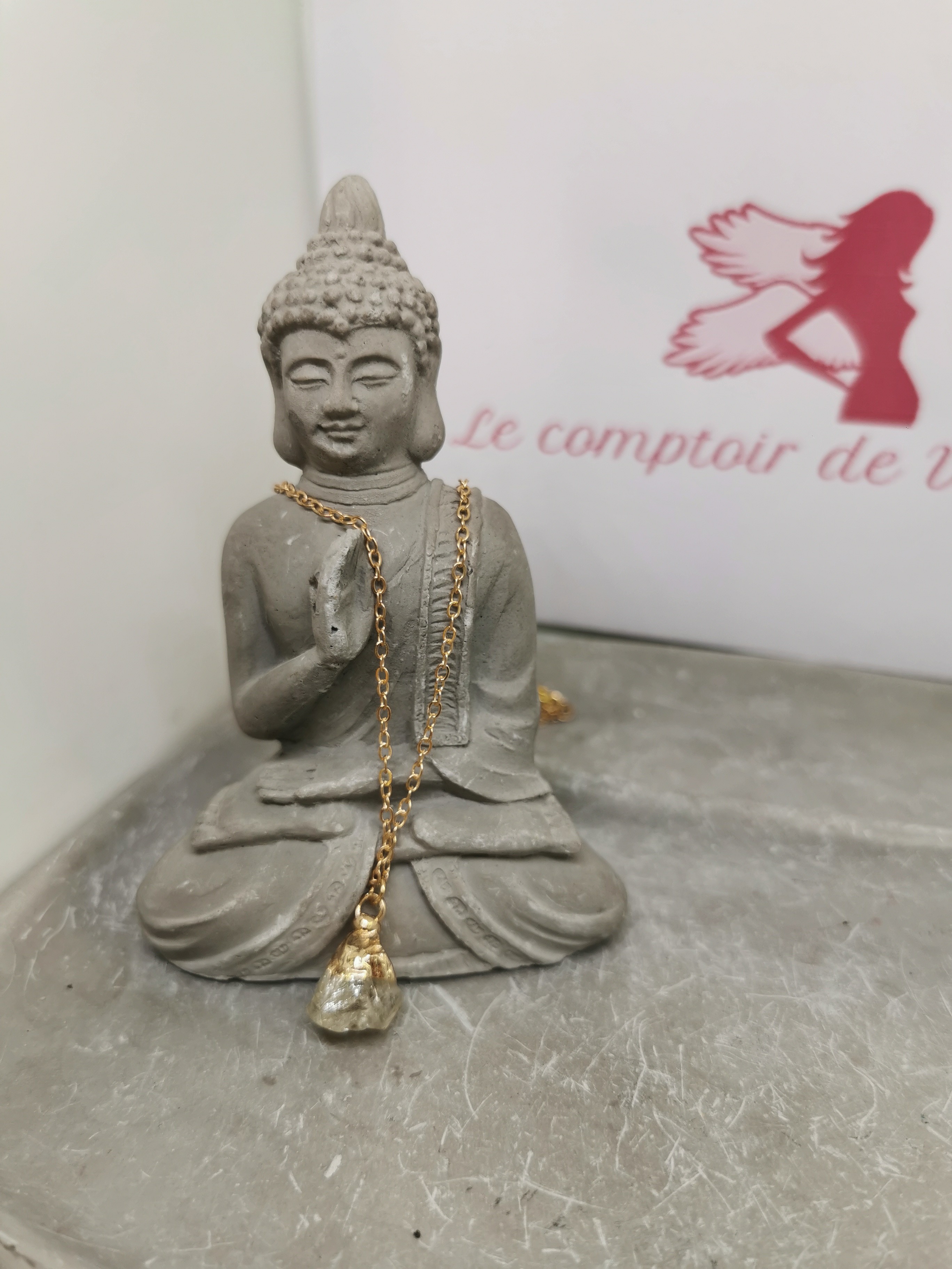 Ce collier met en valeur une citrine naturelle brute, conservée dans son état authentique afin de préserver toute la beauté minérale de la pierre.