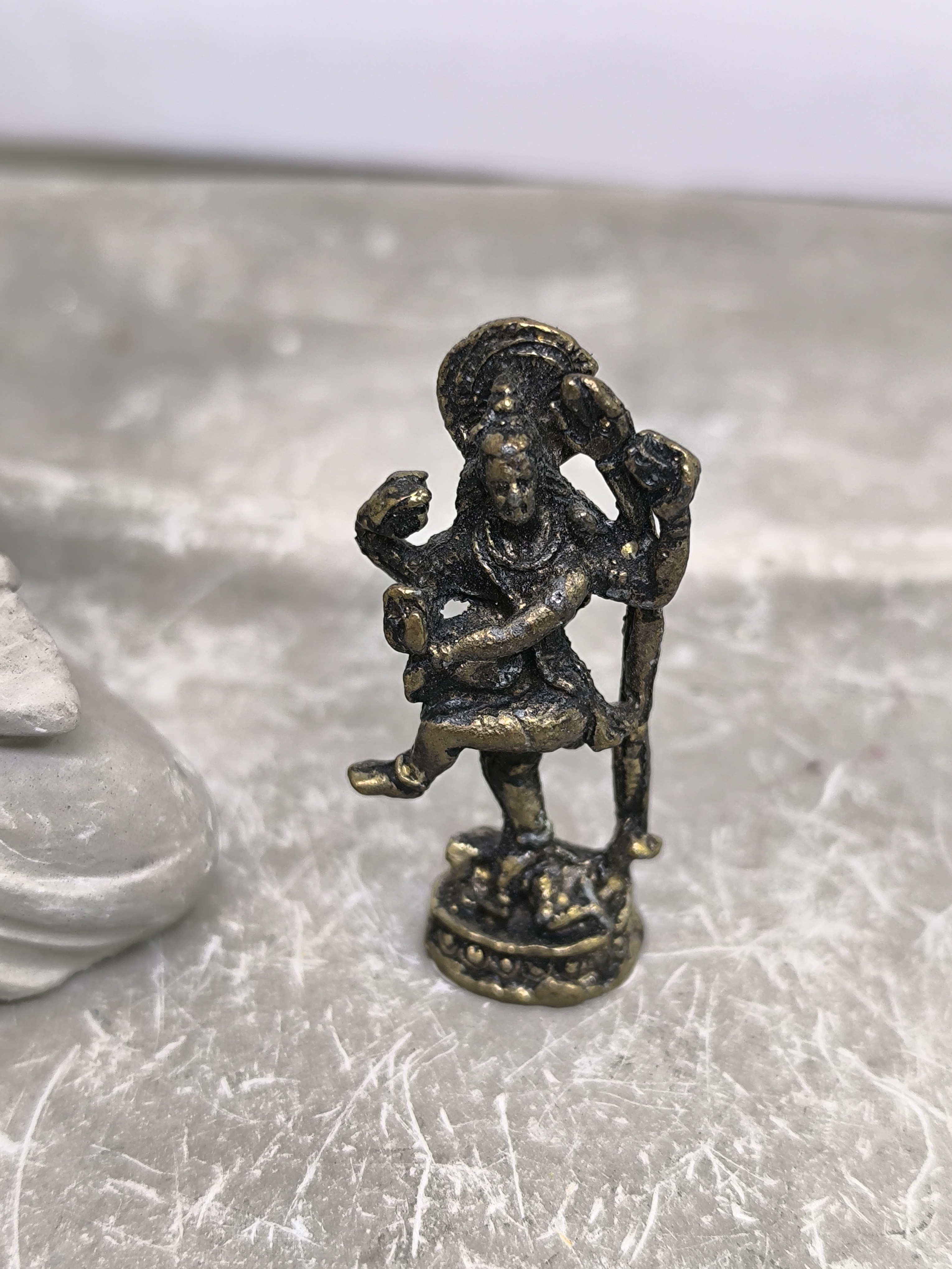 Cette figurine en laiton représente une divinité hindoue dans une posture dynamique, une jambe levée et les bras déployés, incarnant le mouvement et la puissance.