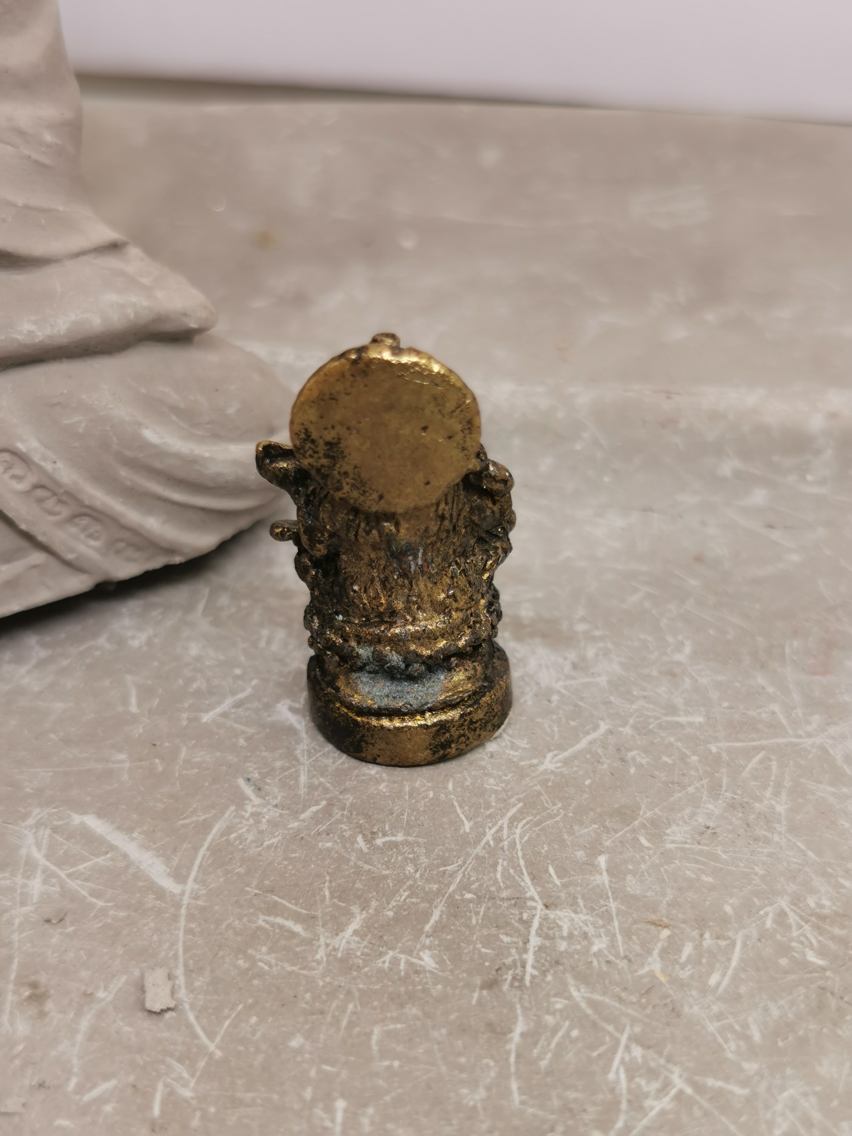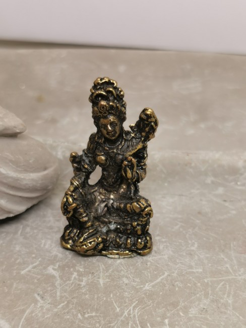 Les détails délicats du visage, de la coiffe et des ornements mettent en valeur le travail artisanal du métal. La patine dorée et sombre du laiton accentue les reliefs et confère à la statuette un aspect ancien et spirituel.