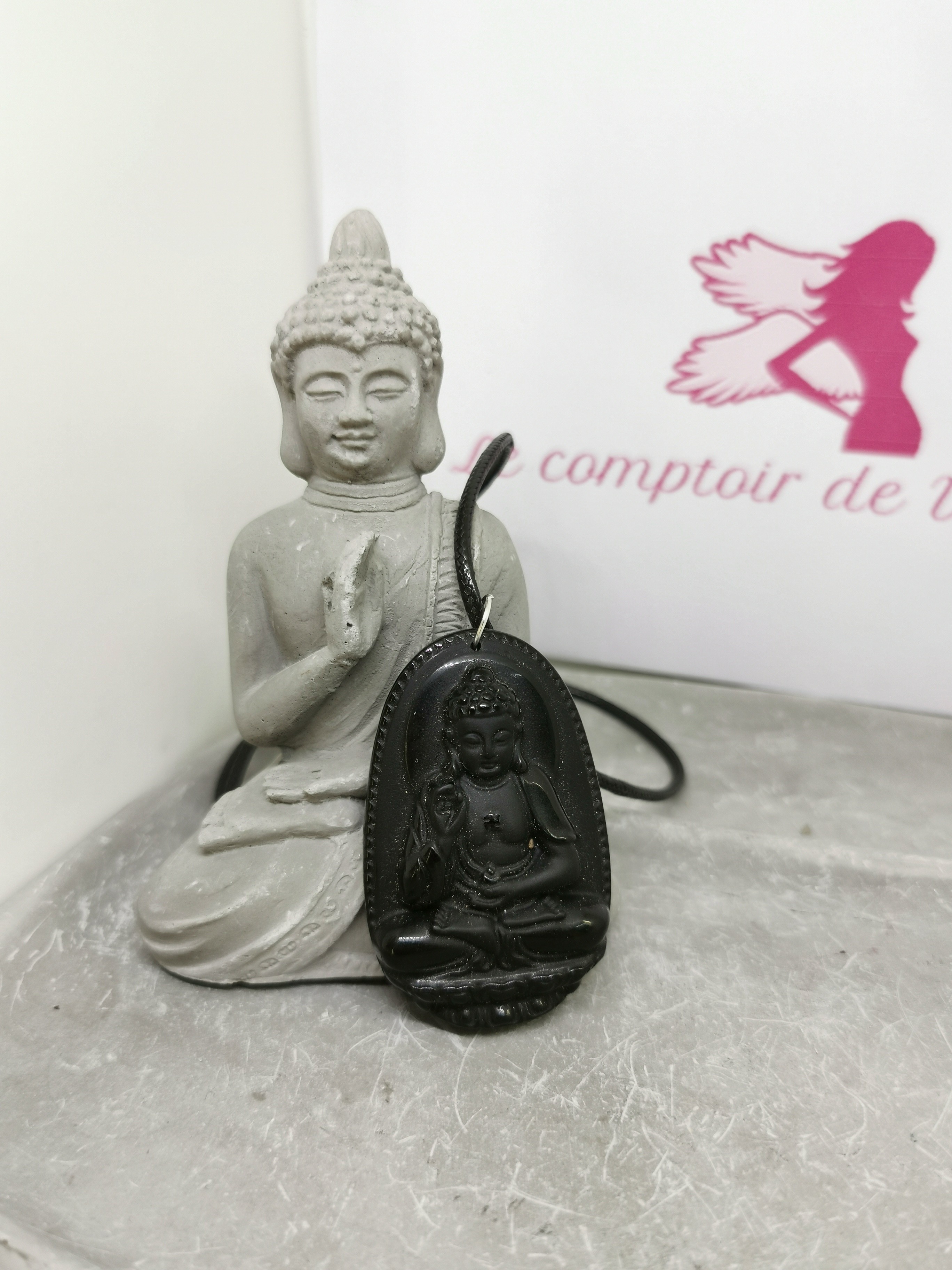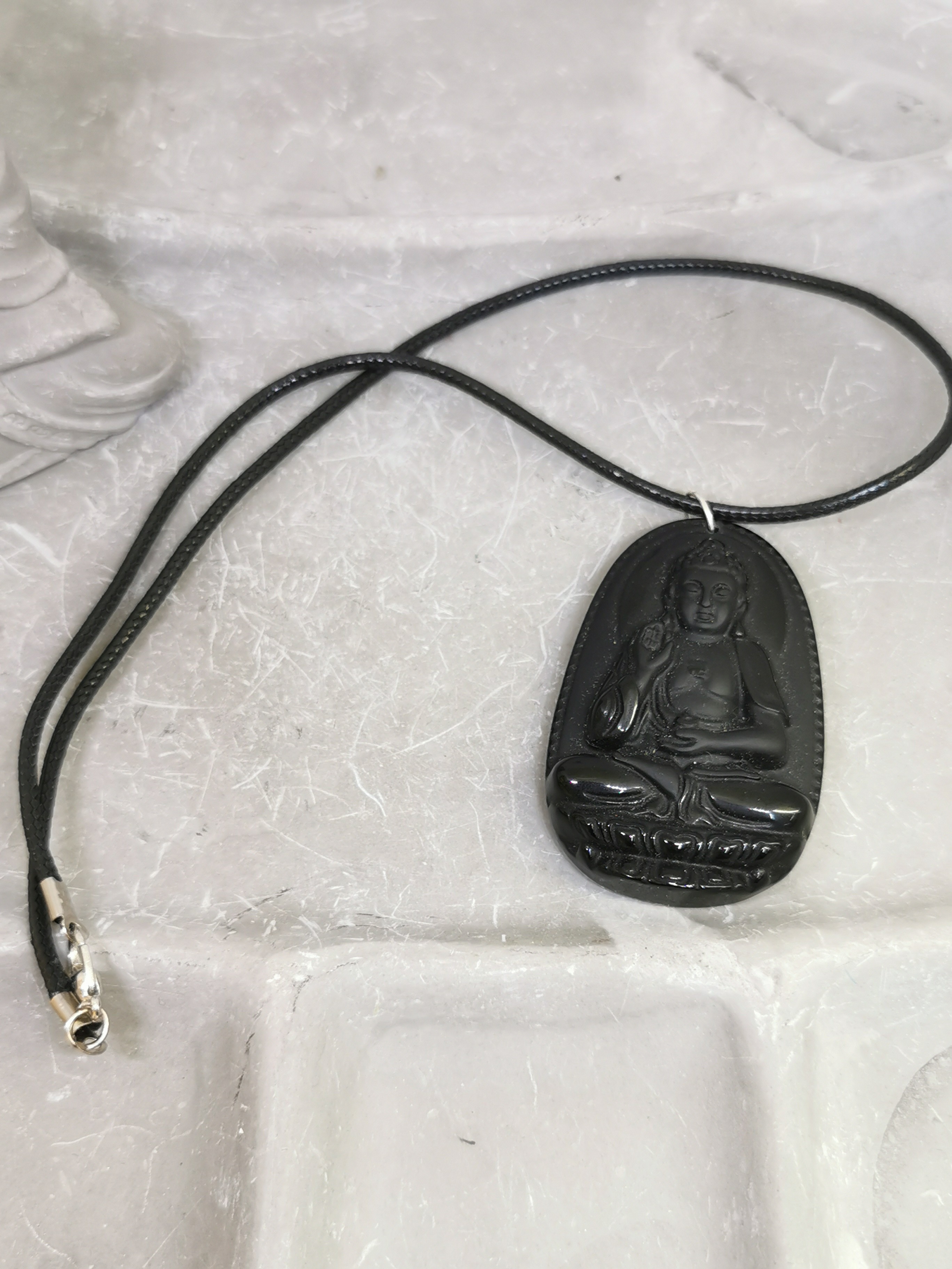 Ce collier spirituel met à l’honneur un Bouddha finement sculpté dans l’obsidienne noire, monté sur un cordon noir sobre et élégant.