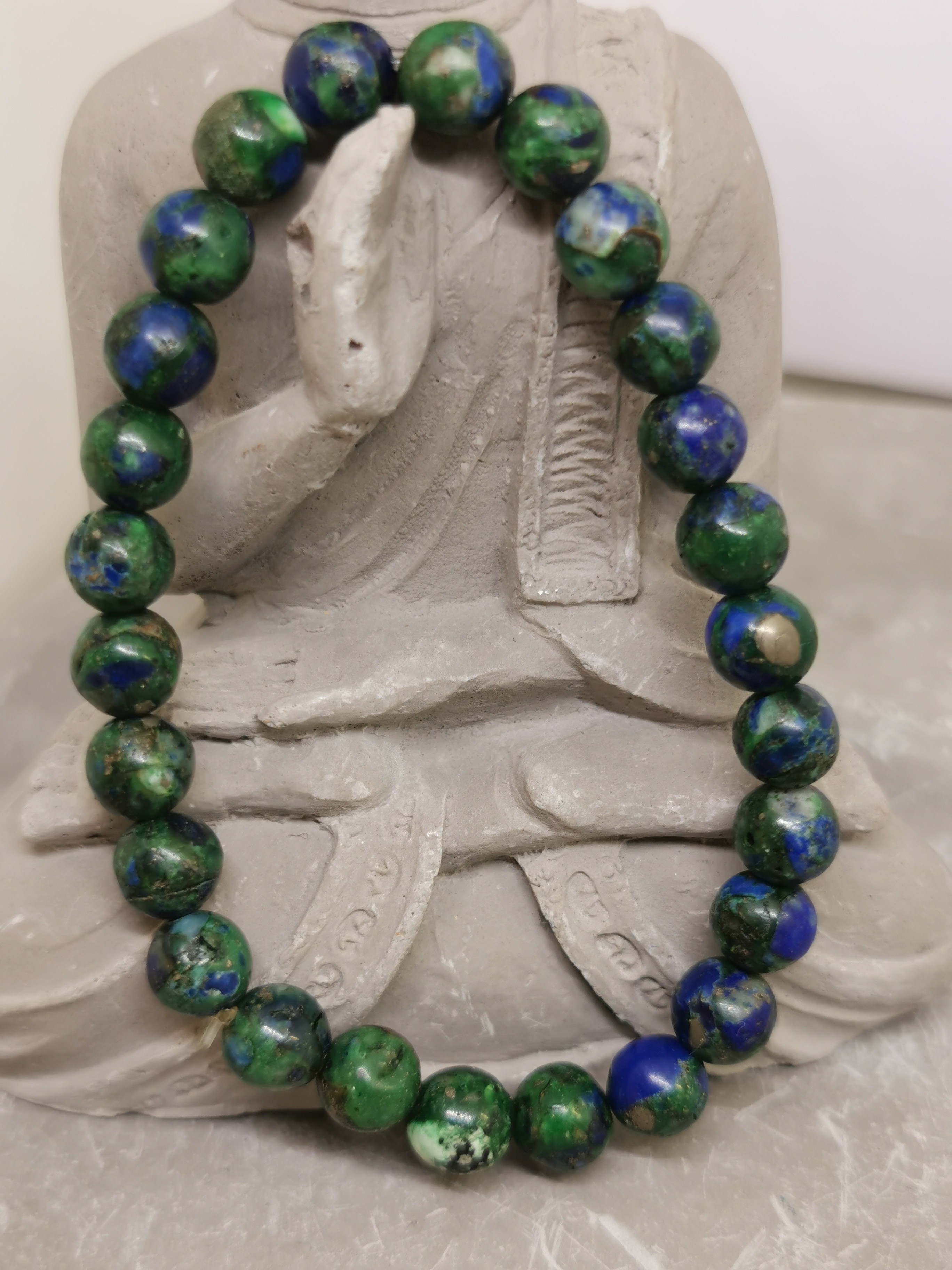 Chaque perle présente un mélange naturel de bleu profond (azurite) et de vert intense (malachite), formant des motifs uniques et vibrants. Aucune pierre ne se ressemble, ce qui rend chaque bracelet singulier.