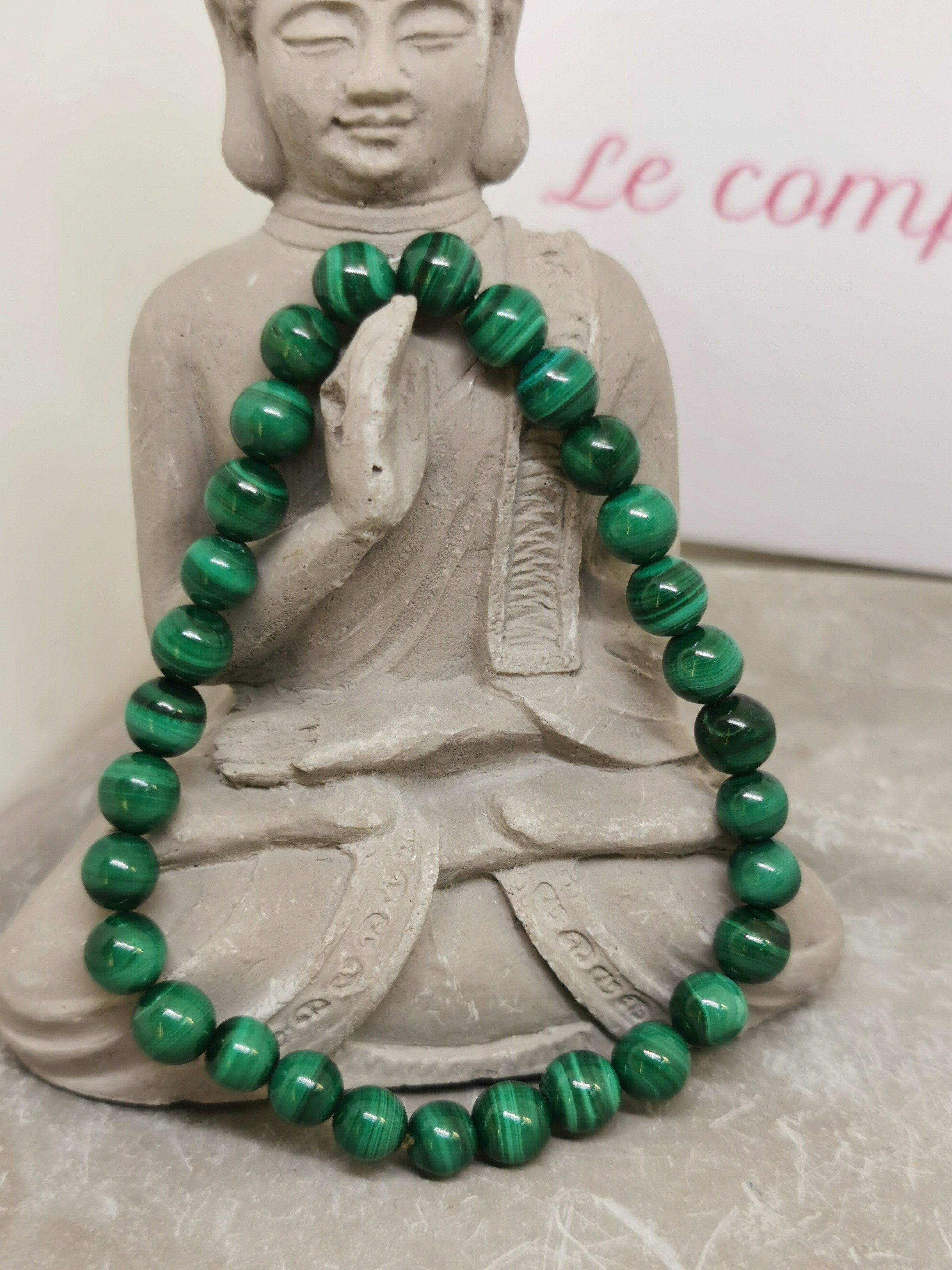 Chaque perle présente les bandes concentriques caractéristiques de la malachite, avec ses nuances de vert clair à vert profond. Chaque bracelet est unique.