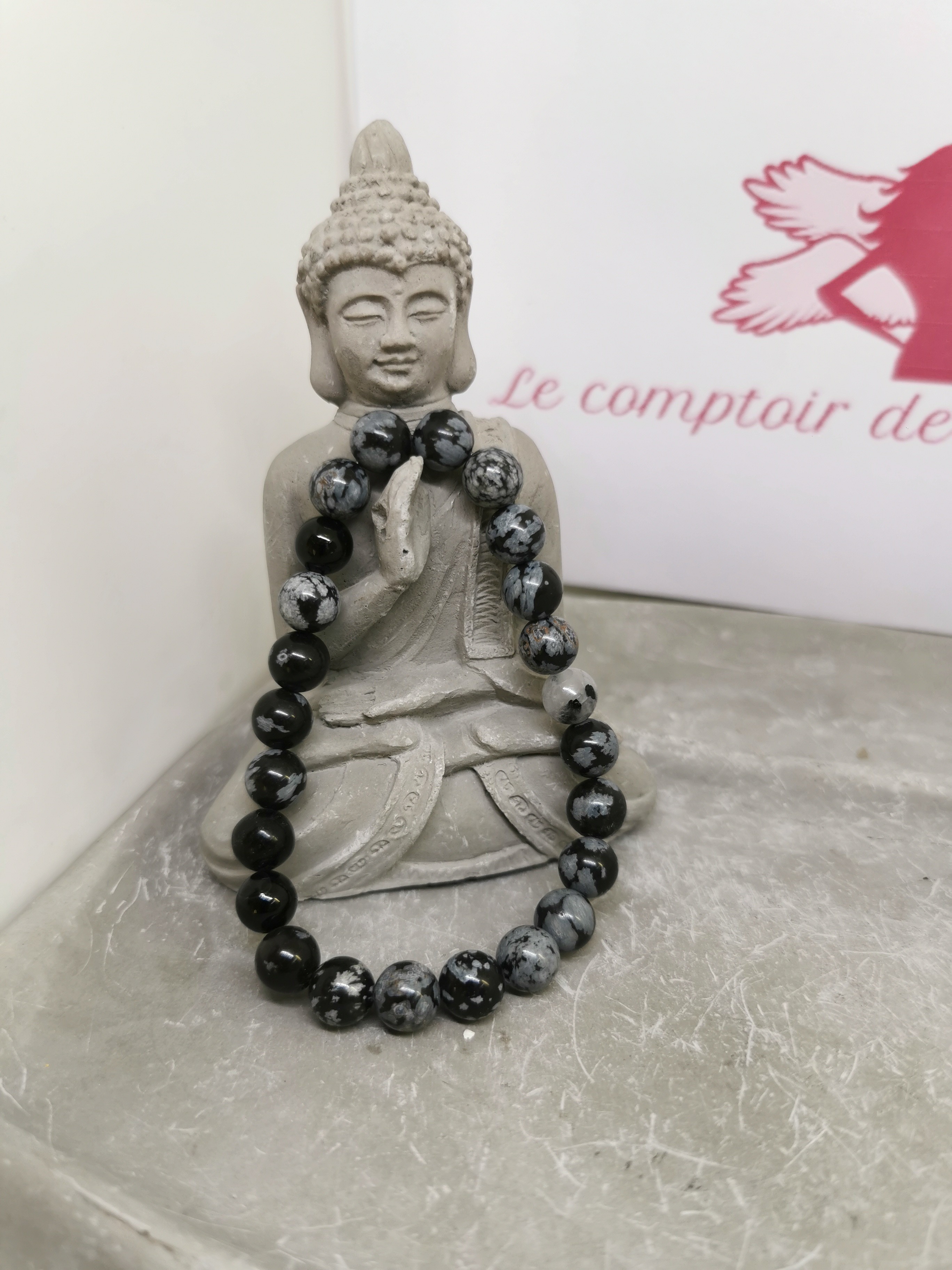 Ce bracelet est composé de perles rondes en obsidienne neige naturelle de 8 mm, montées sur un élastique résistant.