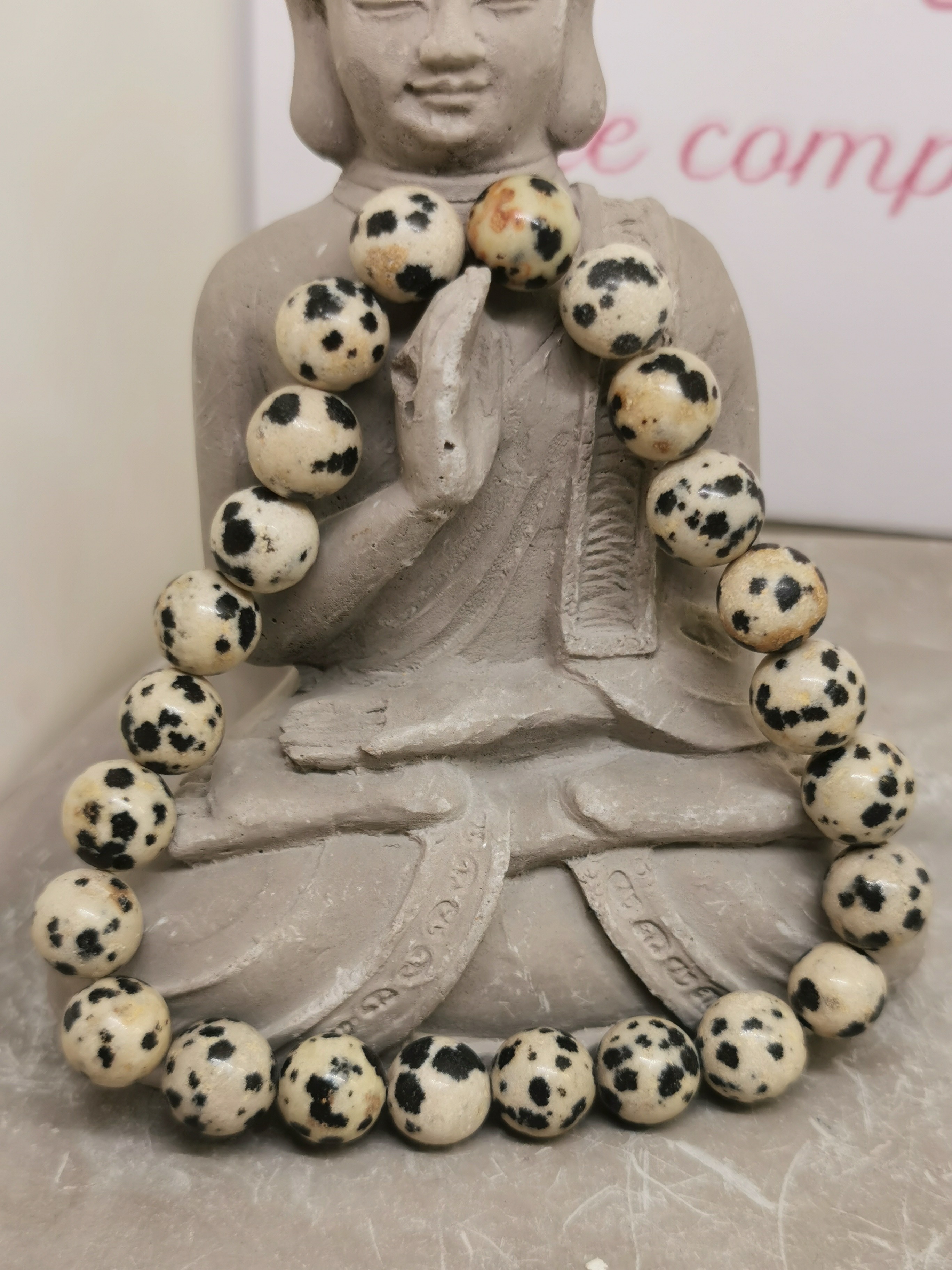 Le jaspe dalmatien se distingue immédiatement par son aspect unique : une pierre crème ou beige clair parsemée de taches noires, rappelant le pelage du célèbre chien dalmatien. Ce contraste naturel donne au bracelet une apparence originale, lumineuse et pleine de caractère.