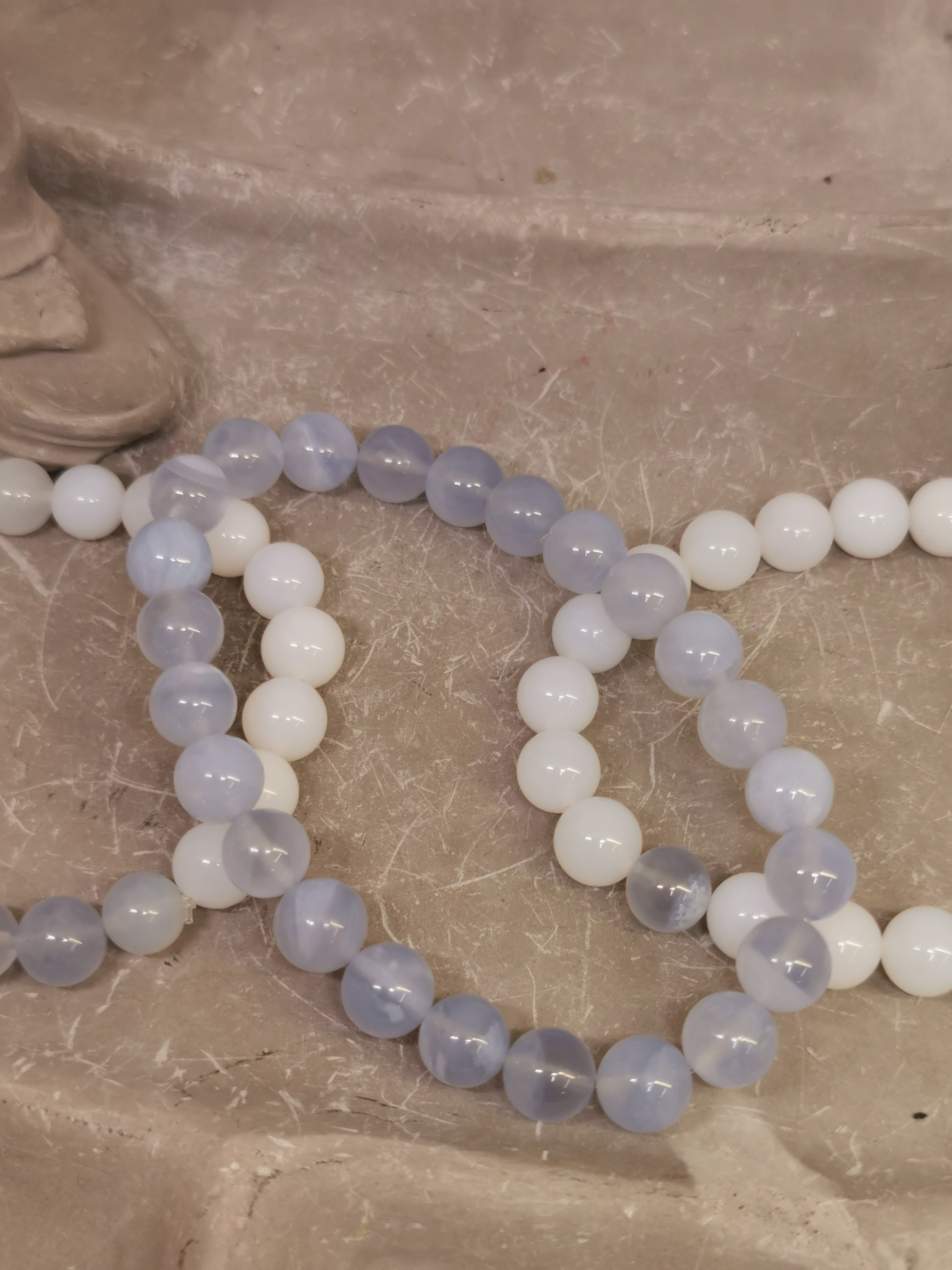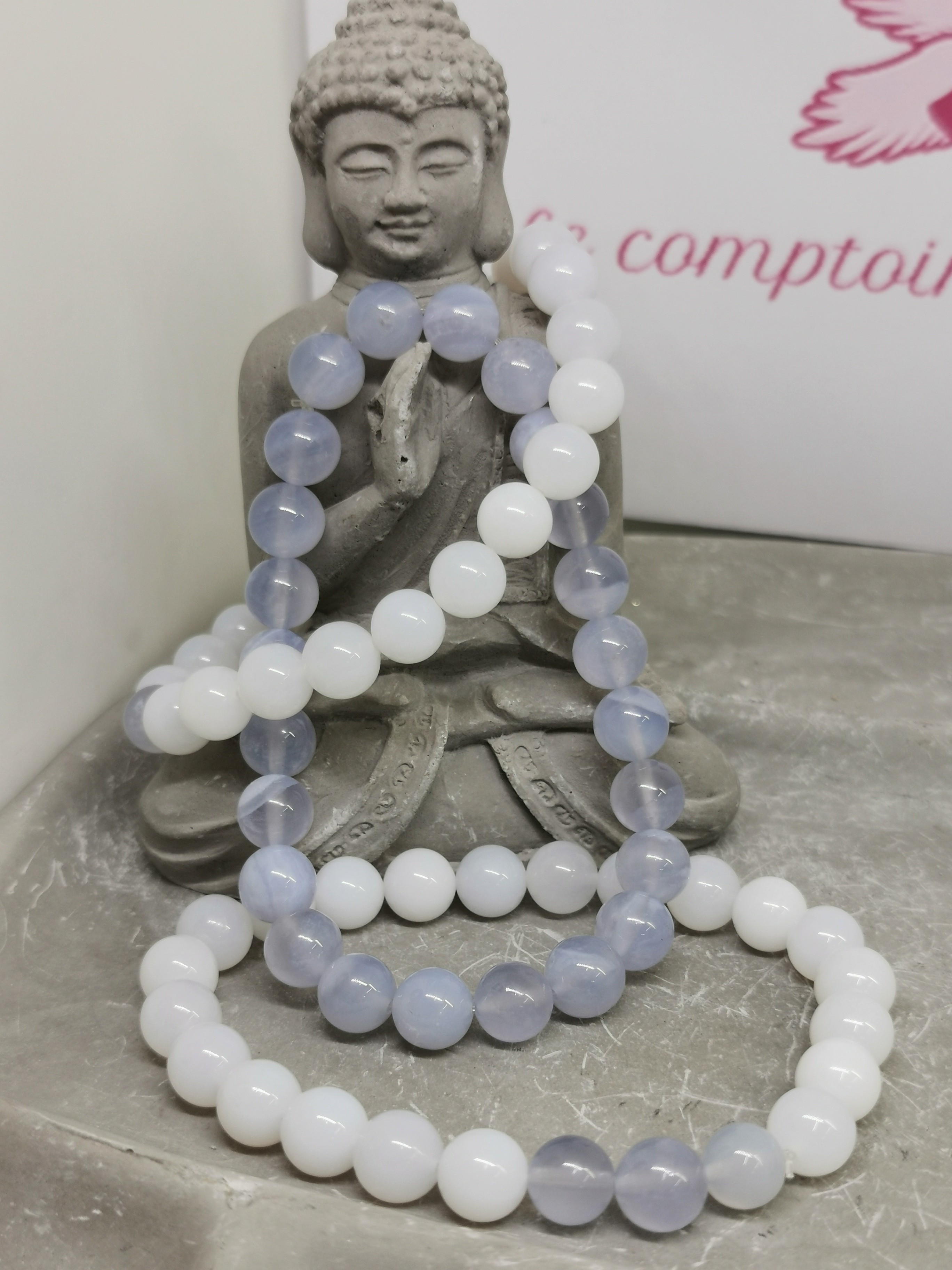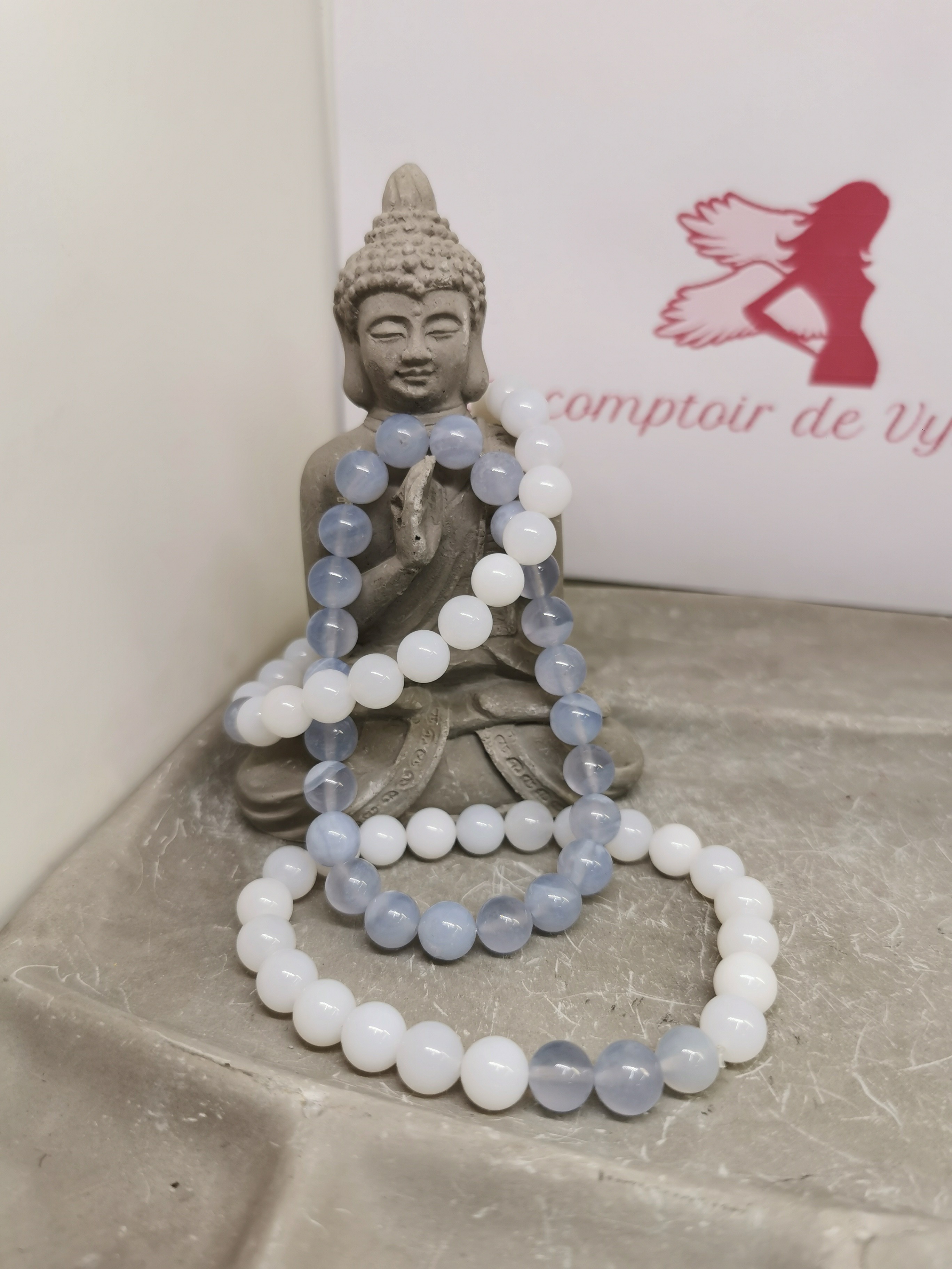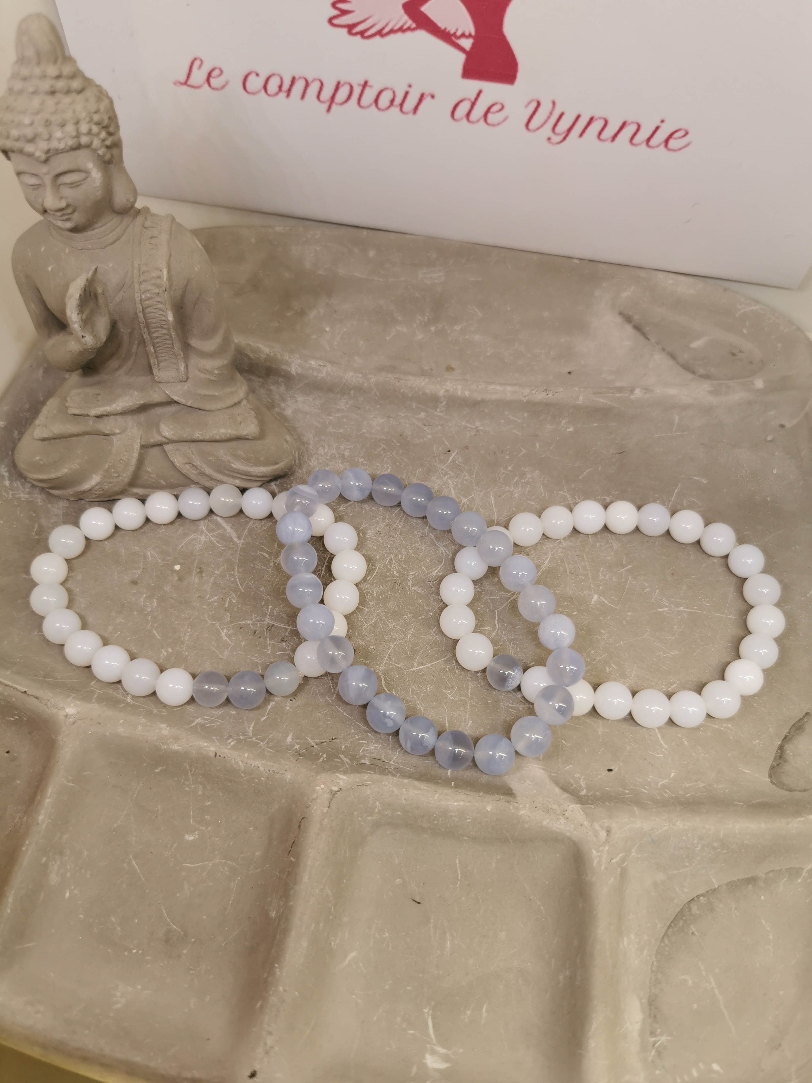 Les bracelets présentés associent différentes nuances naturelles de calcédoine :