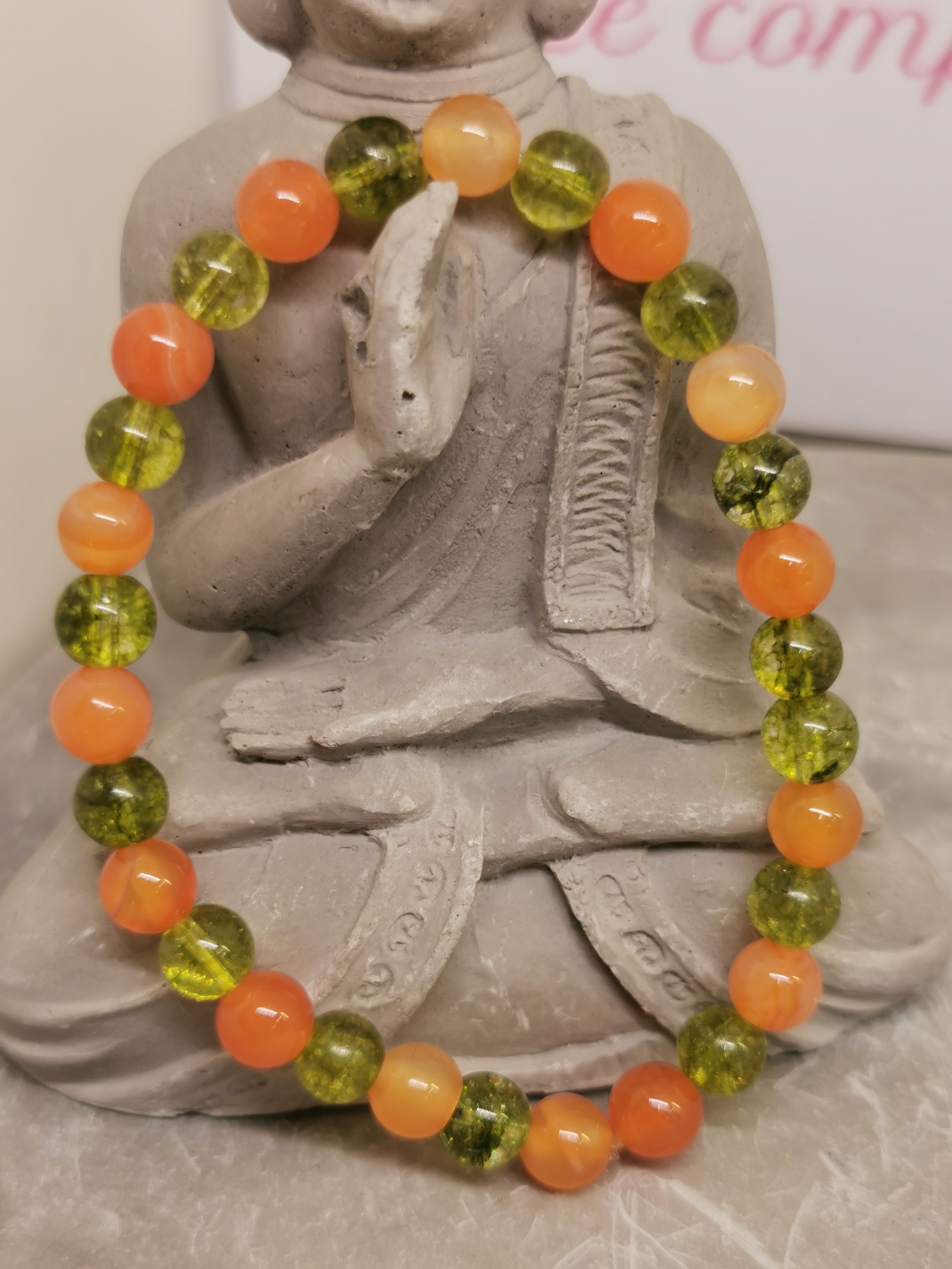 Les perles de 6 mm, alternant entre le vert lumineux du péridot et l’orange chaleureux de la cornaline, créent un bijou à la fois dynamique et harmonieux.