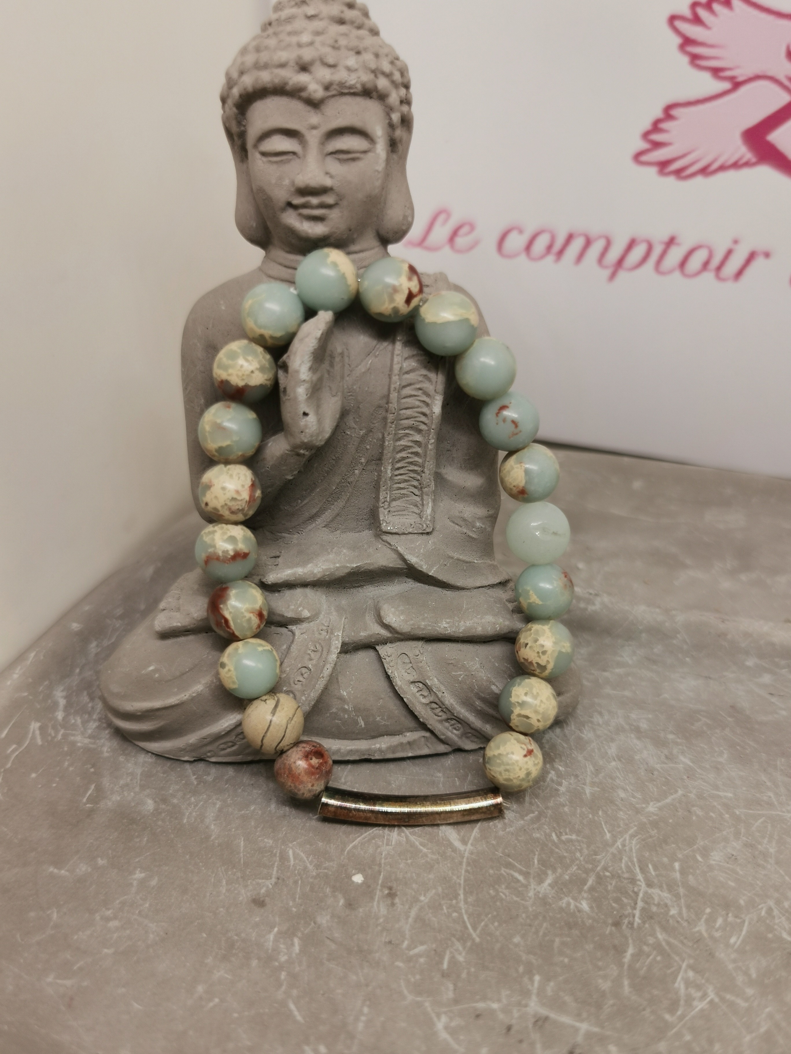 Chaque pierre étant naturelle, ses motifs et ses variations de couleurs peuvent différer légèrement d’un bracelet à l’autre.