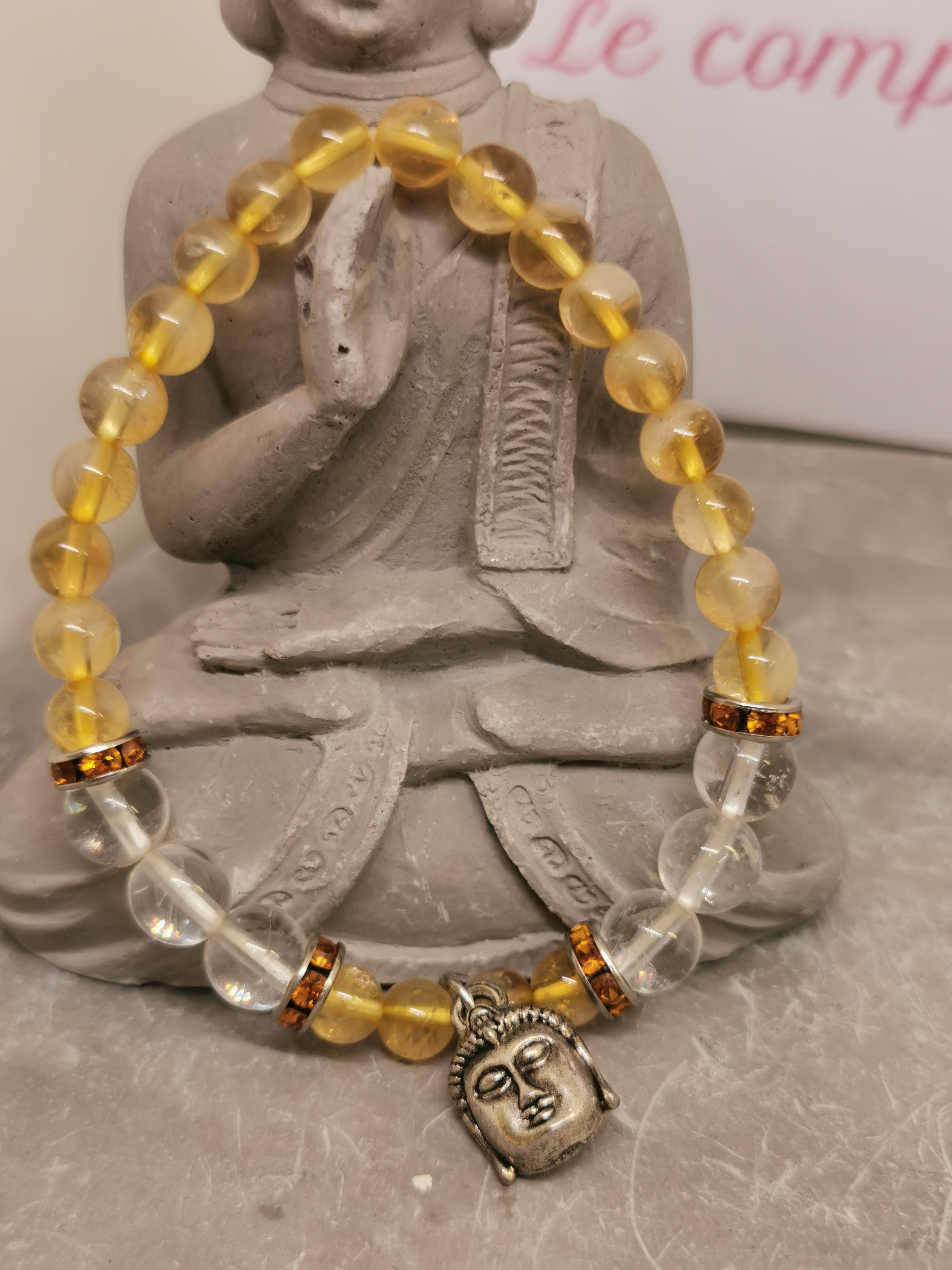 Bracelet citrine et cristal de roche avec tête de Bouddha argentée