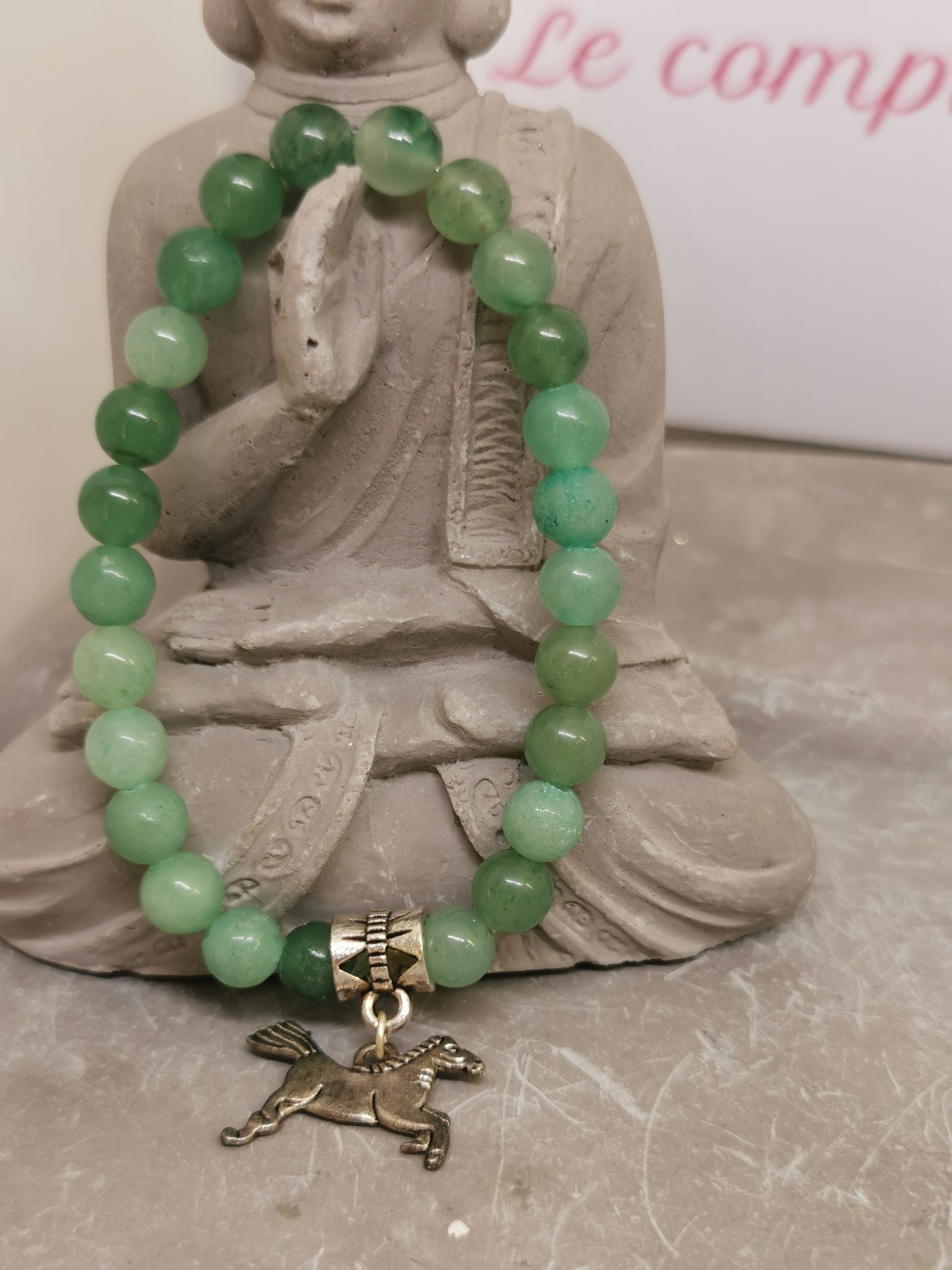 Au centre du bracelet, un pendentif cheval au galop apporte une touche symbolique forte. Le cheval incarne la liberté, la force intérieure et l’élan vers l’avenir. Associé à l’aventurine, il devient un véritable porte-bonheur énergétique pour accompagner l’enfant dans sa croissance, ses apprentissages et ses aventures du quotidien.