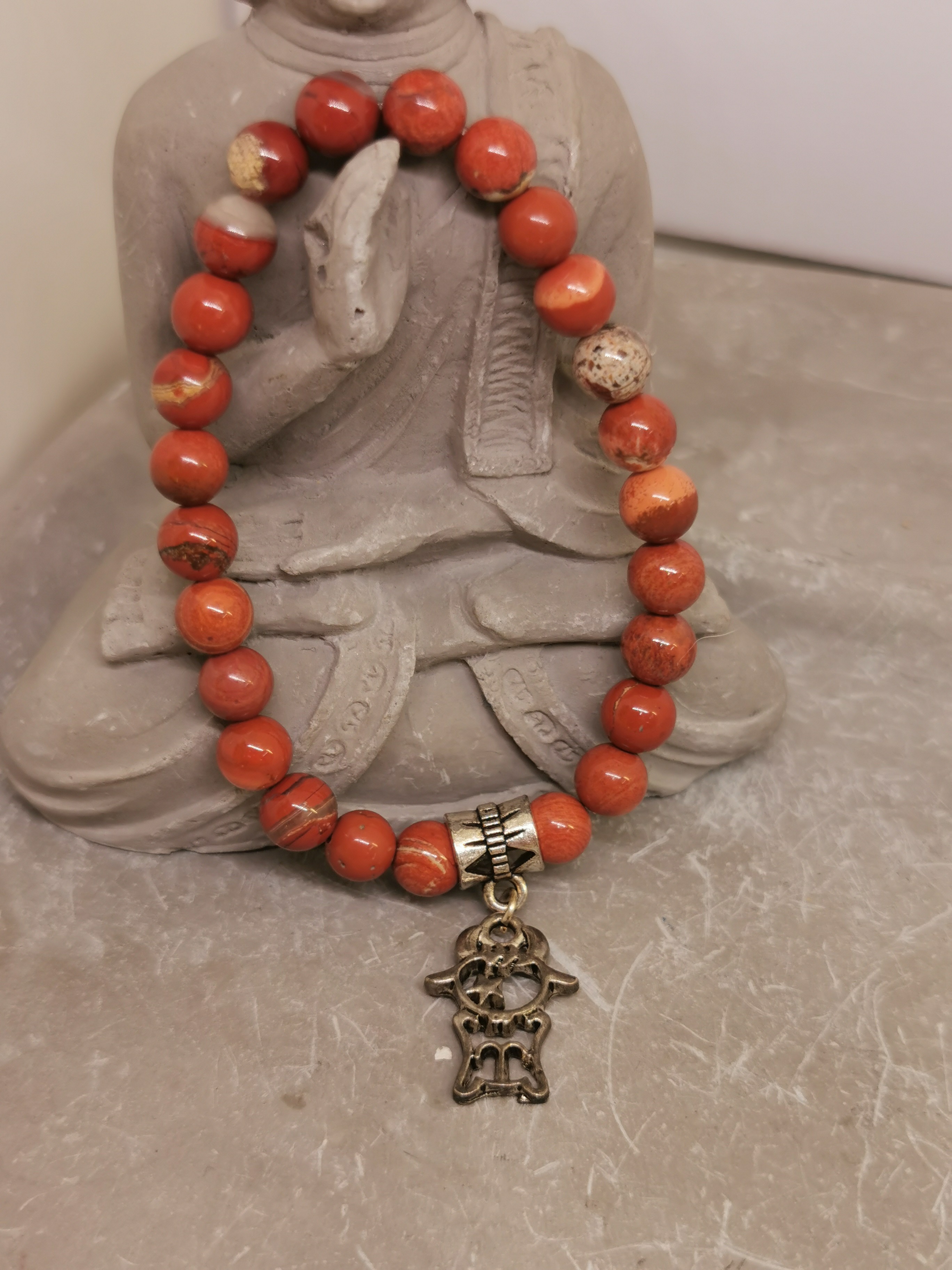 Les perles de jaspe rouge présentent de magnifiques nuances allant du rouge profond au rouge orangé, parfois marbrées de motifs naturels beiges ou bruns qui témoignent de l’authenticité de la pierre. Chaque bracelet est donc unique, car les pierres naturelles possèdent leurs propres variations de couleur.
