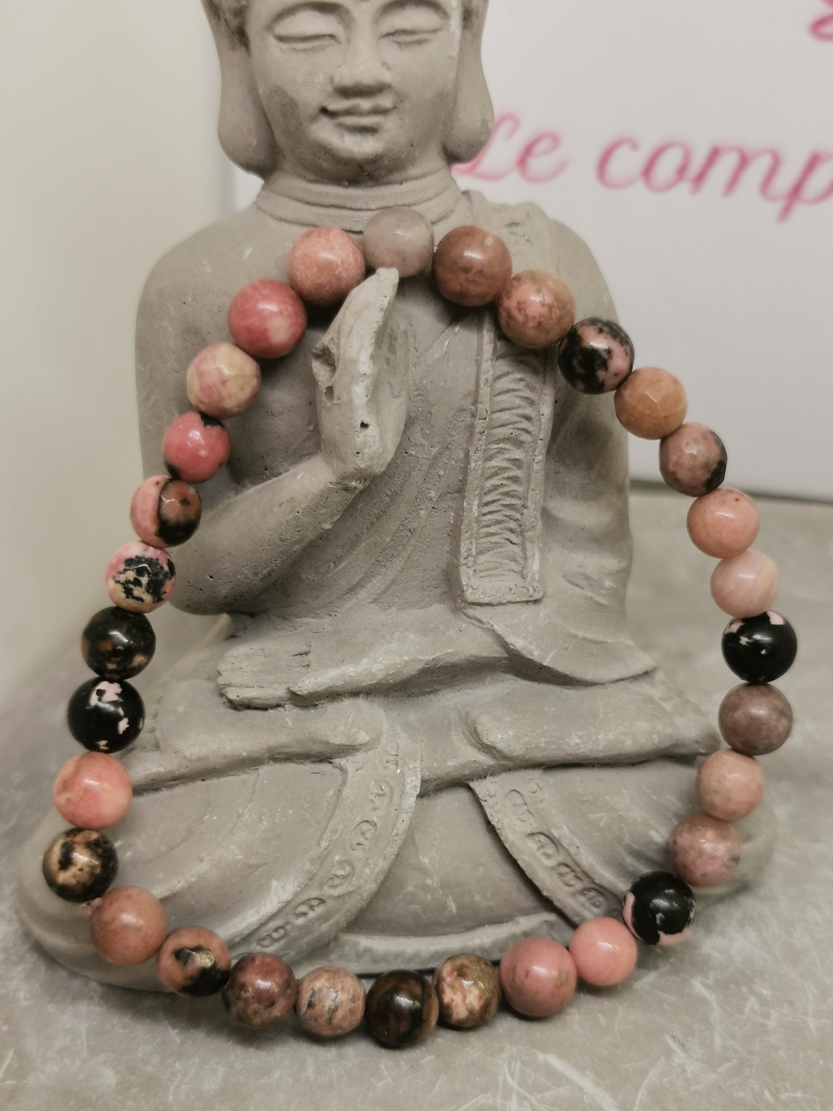 Ce bracelet en rhodochrosite naturelle séduit par ses teintes délicates allant du rose pâle au rose profond, parfois mêlées de nuances brunes, crème ou noires qui témoignent de l’authenticité de la pierre.