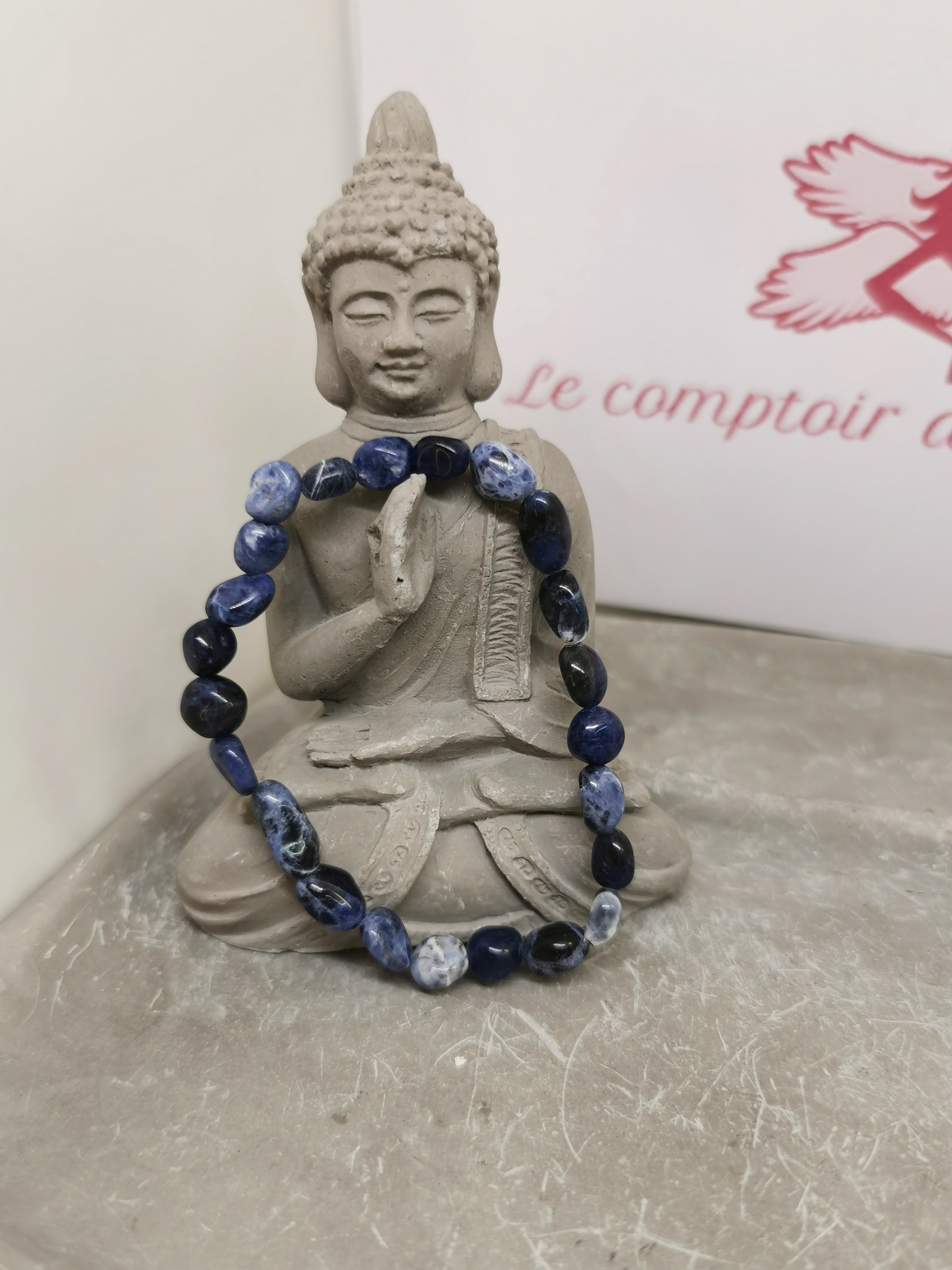 Les perles, aux formes légèrement ovales et polies, mettent en valeur la beauté naturelle de la sodalite et ses variations uniques. Chaque pierre présente des motifs minéraux différents, ce qui rend chaque bracelet unique.