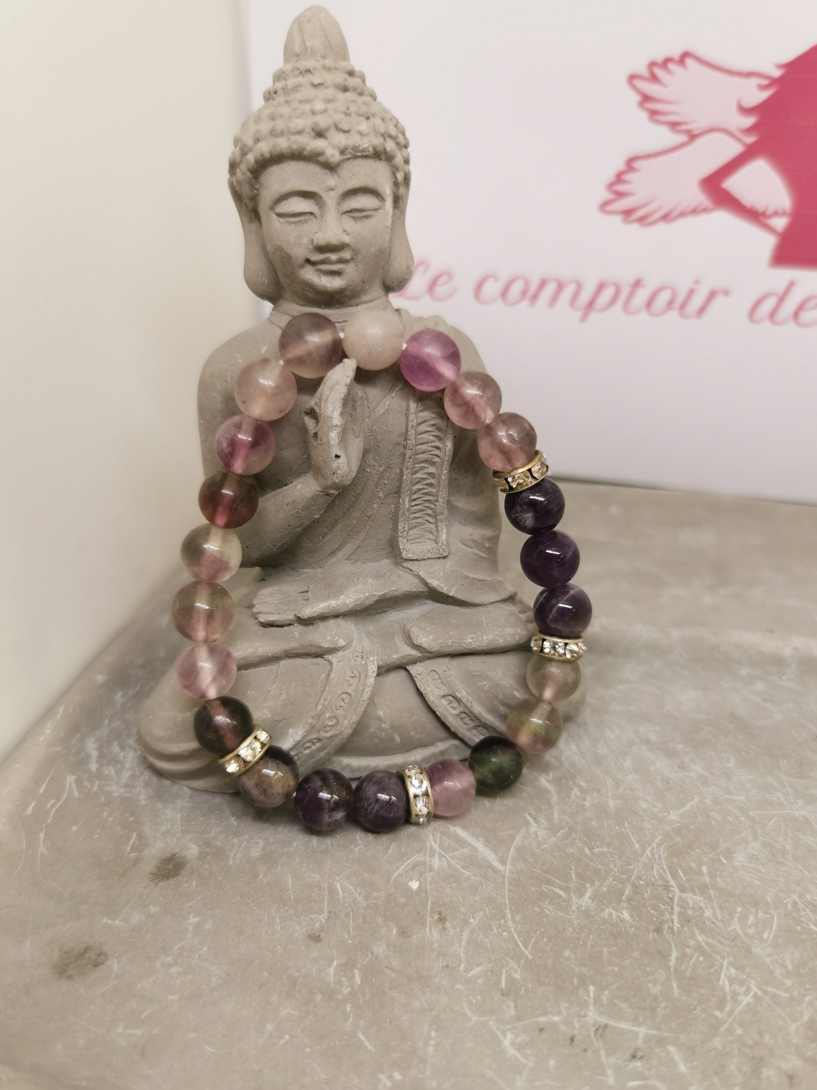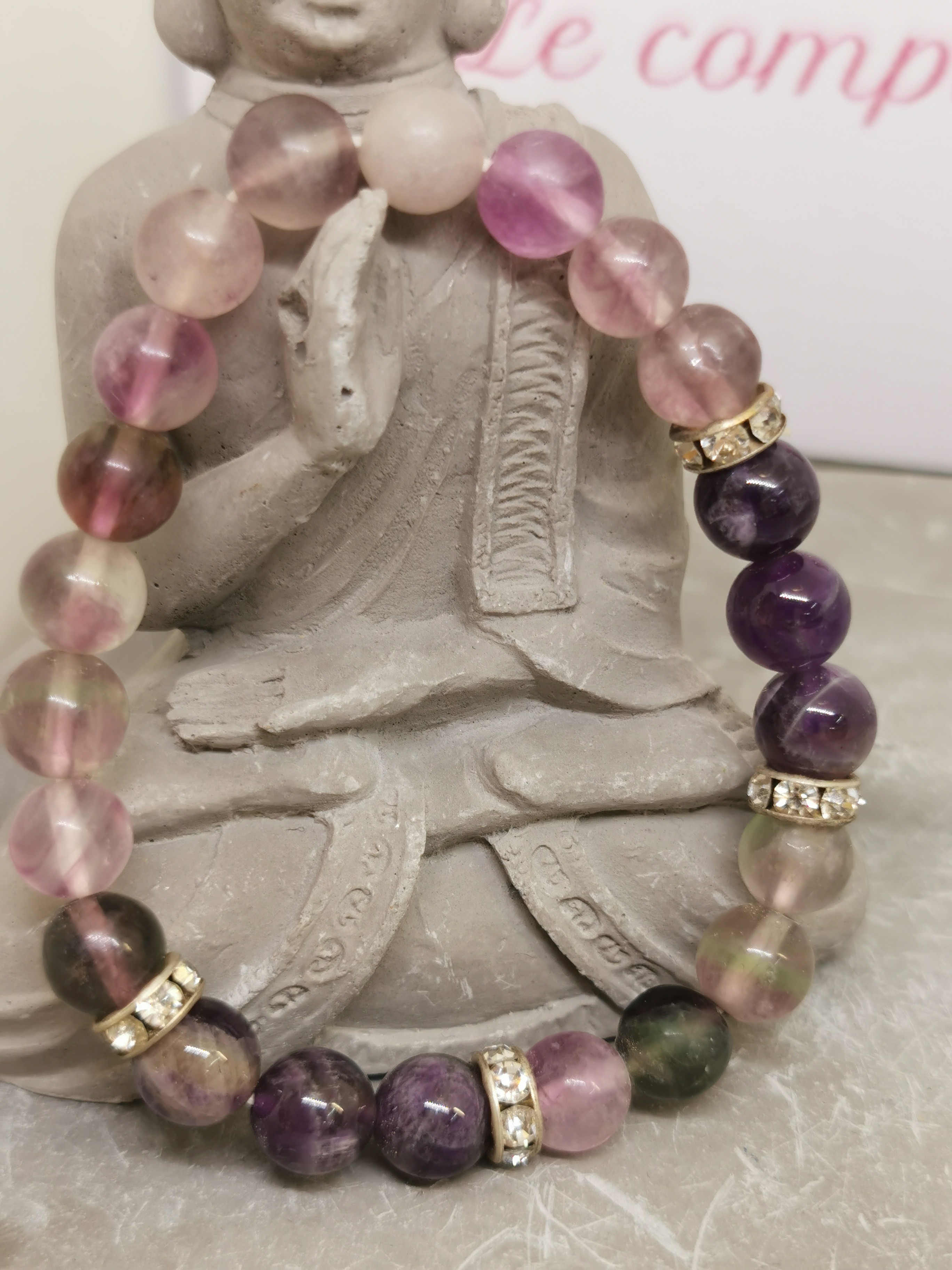Ce bracelet en fluorine naturelle multicolore séduit par ses magnifiques nuances mêlant vert translucide, violet profond, rose délicat et teintes légèrement cristallines. Les perles rondes de 8 mm mettent en valeur la beauté naturelle de la fluorine, dont chaque pierre possède ses propres variations de couleur.
