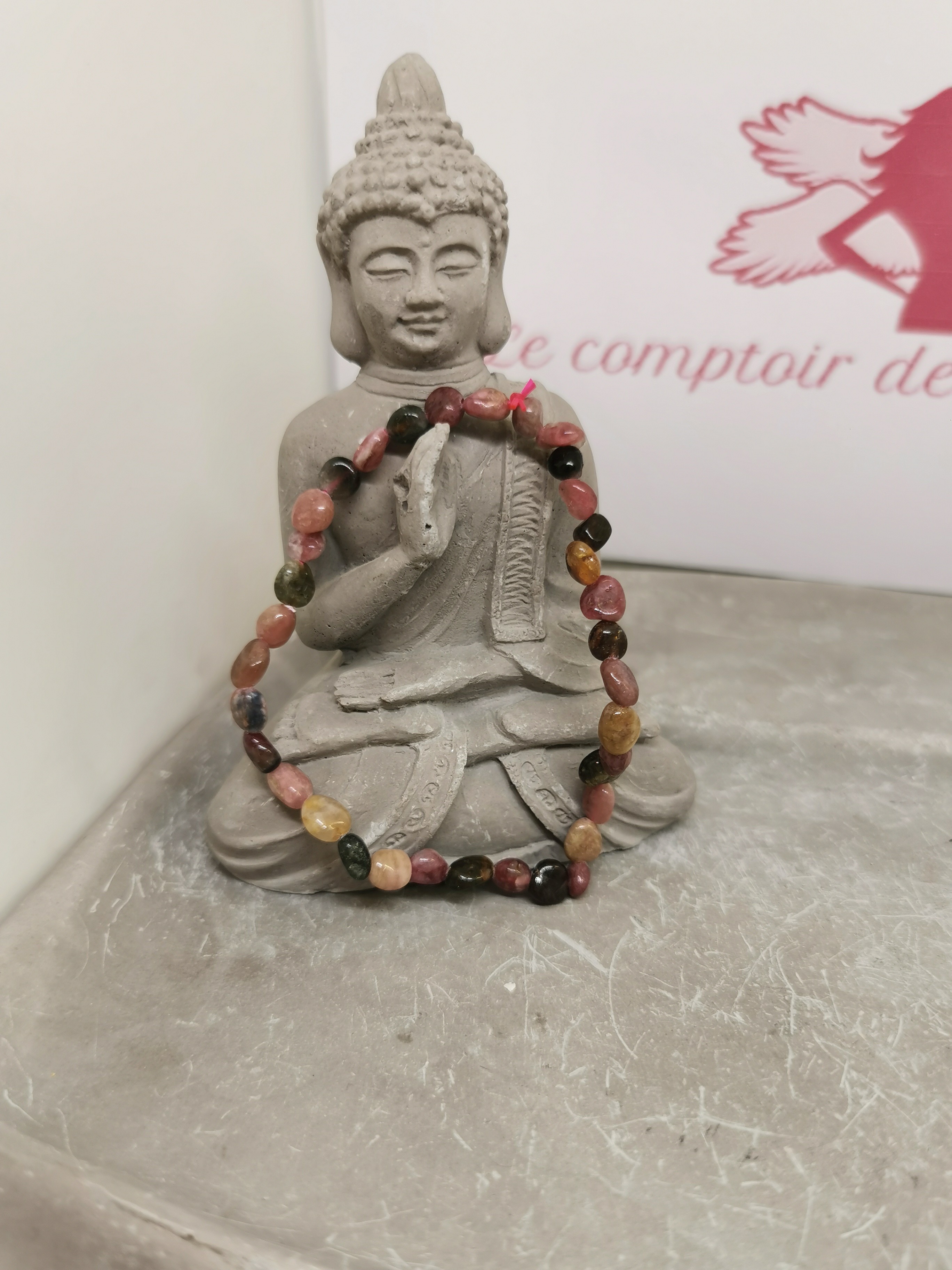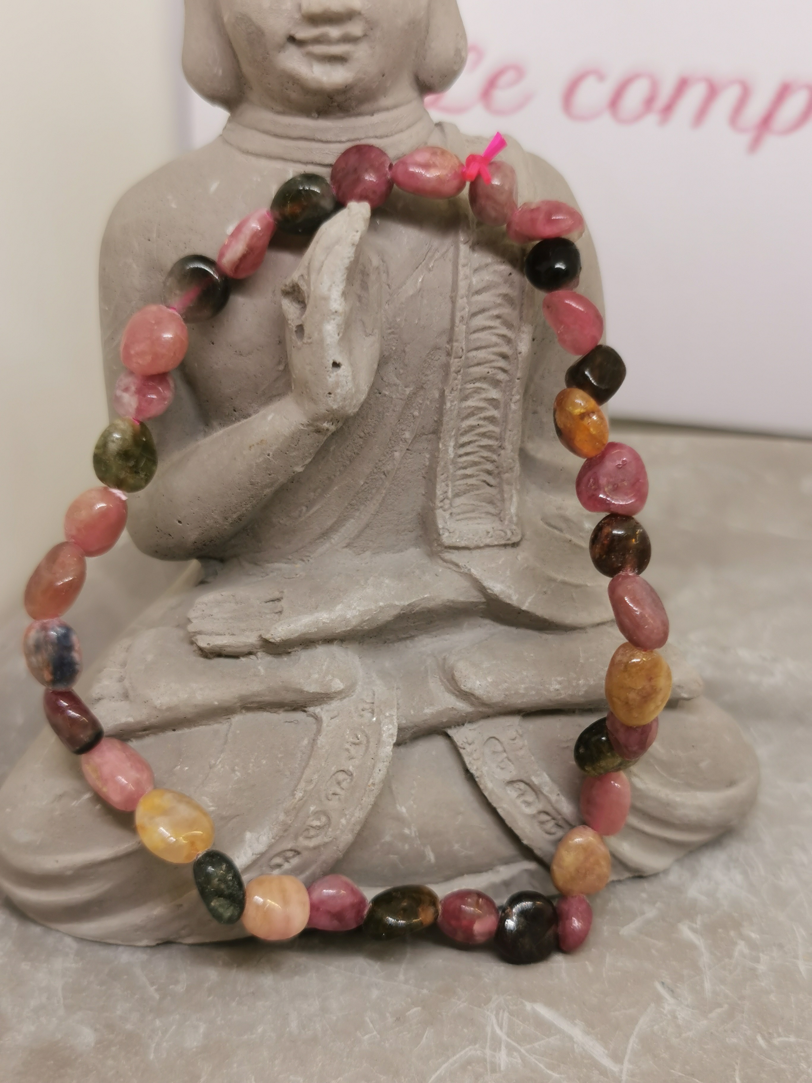 Ce bracelet en tourmaline multicolore naturelle séduit par la richesse de ses teintes naturelles. Les perles irrégulières présentent une palette de couleurs allant du rose au vert, en passant par le brun, le jaune et le noir, créant un bijou unique et lumineux.