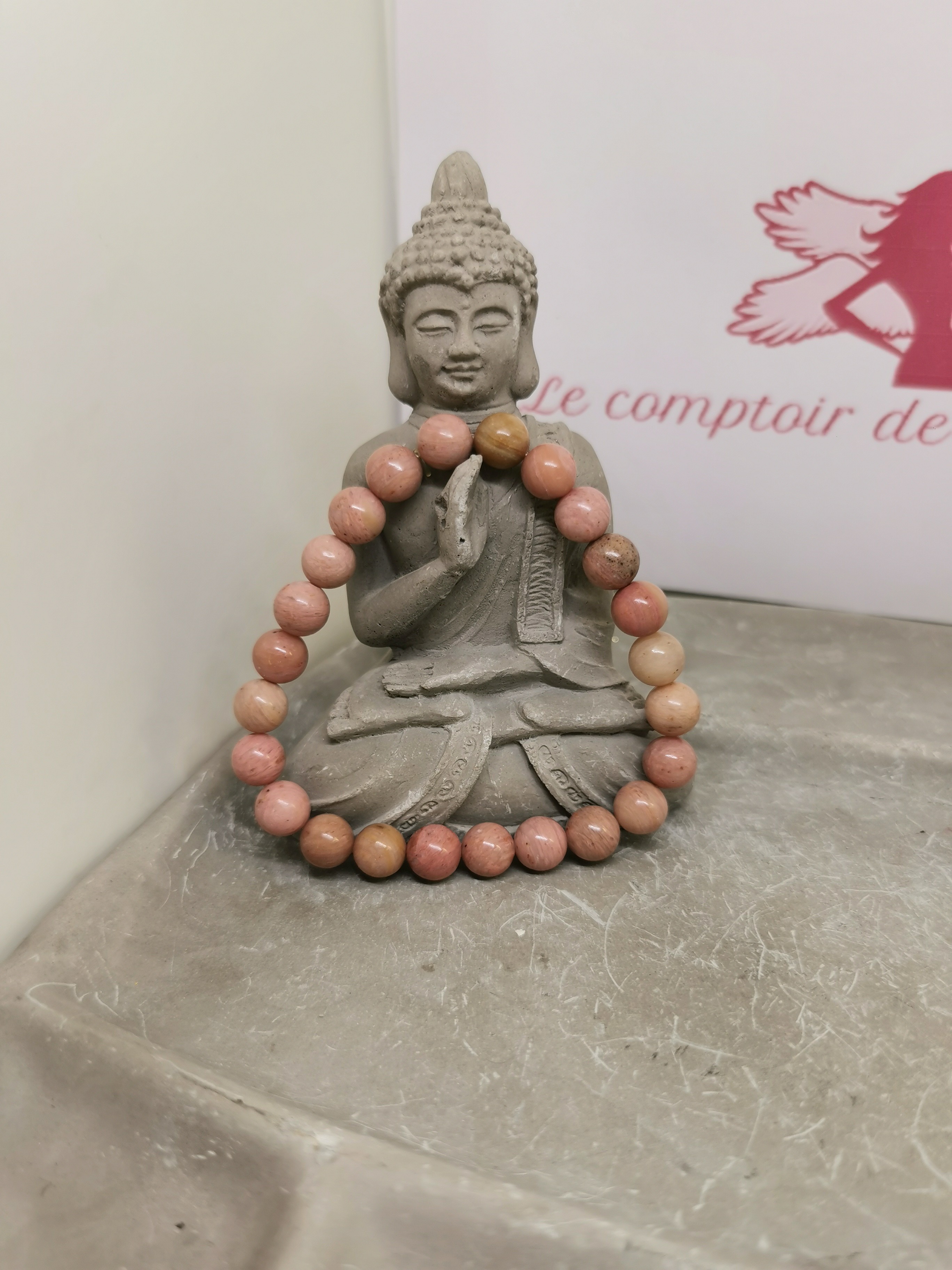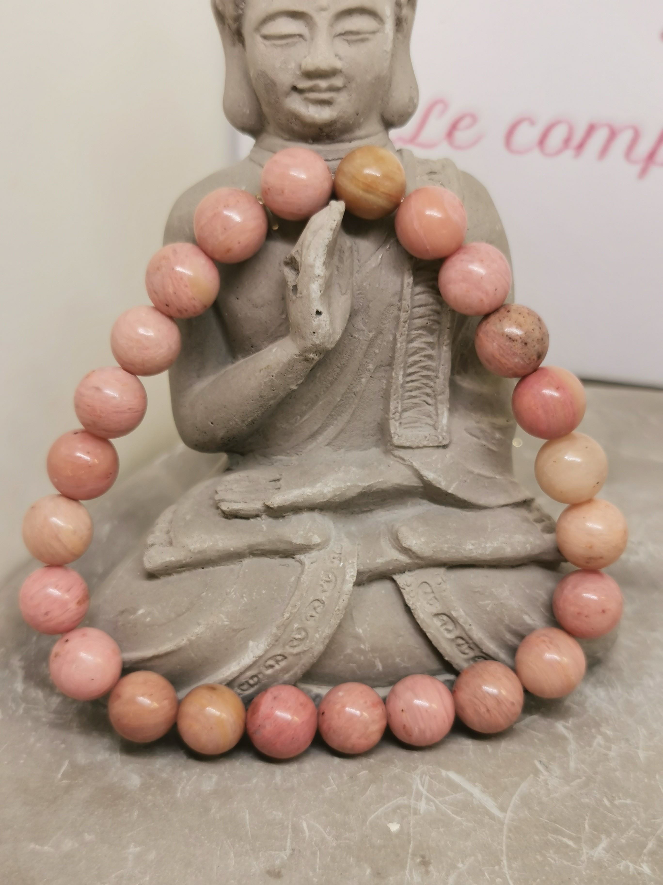 Ce bracelet en rhodonite naturelle séduit par ses magnifiques nuances de rose allant du rose pâle au rose soutenu, parfois accompagnées de fines inclusions naturelles plus sombres. Chaque perle révèle une teinte unique, faisant de ce bracelet un bijou à la fois élégant, naturel et authentique.