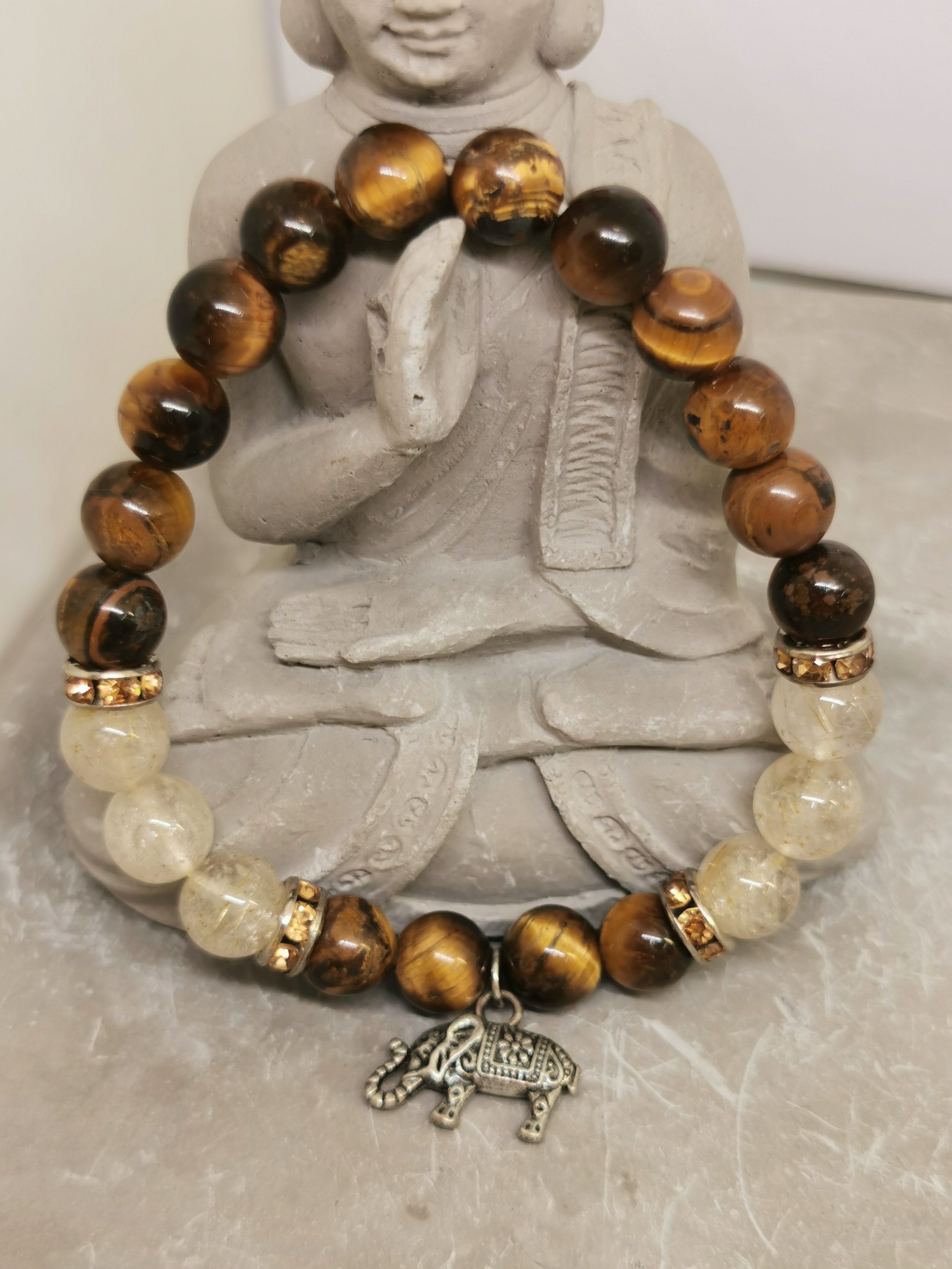 L’association de l’œil de tigre, de la citrine et du symbole de l’éléphant crée un bracelet évoquant :