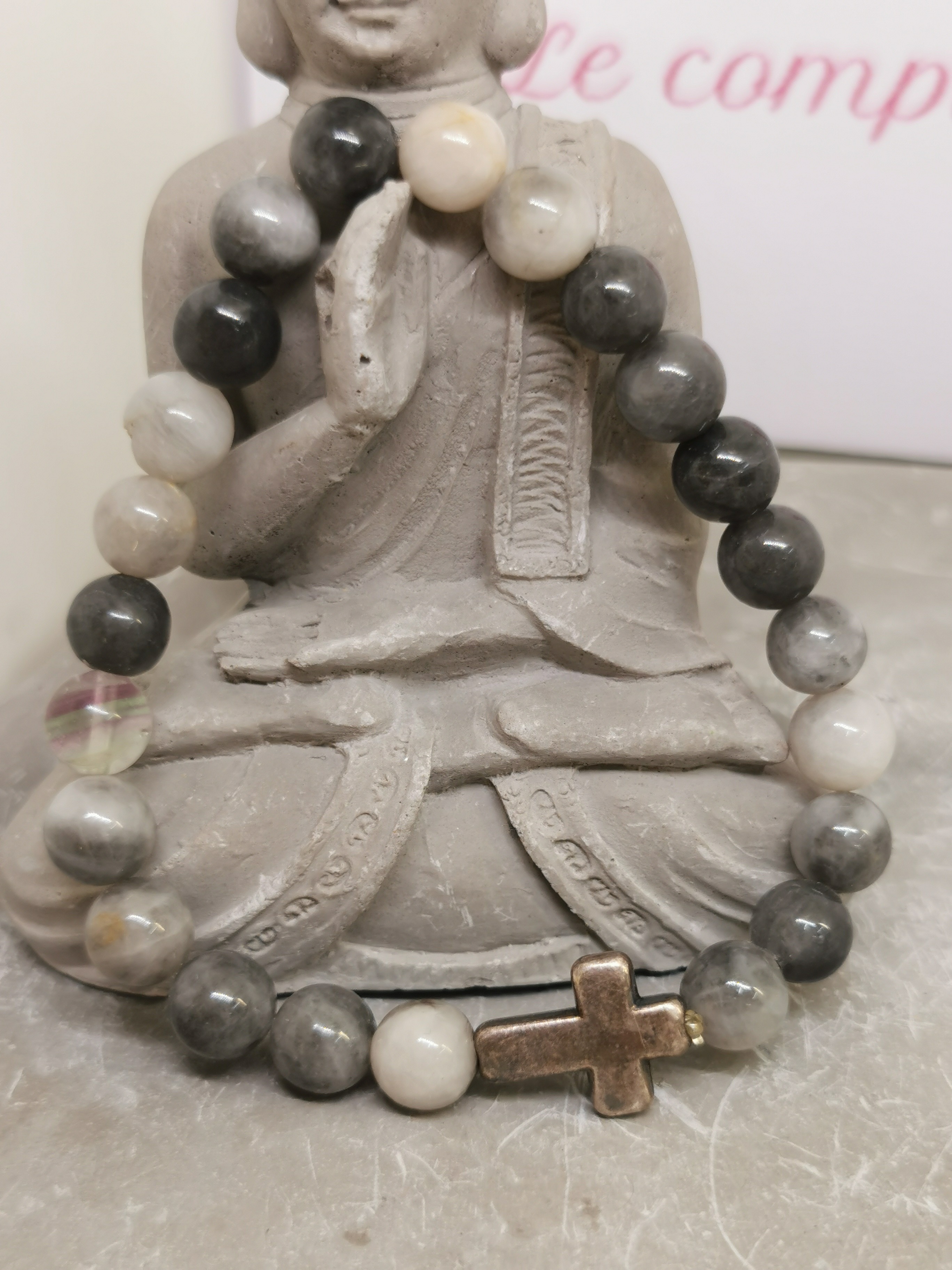 Au centre du bracelet se trouve une croix en acier inoxydable, symbole intemporel de foi, de protection et d’équilibre. Sa finition métallique apporte une touche moderne et souligne la force symbolique de l’ensemble.