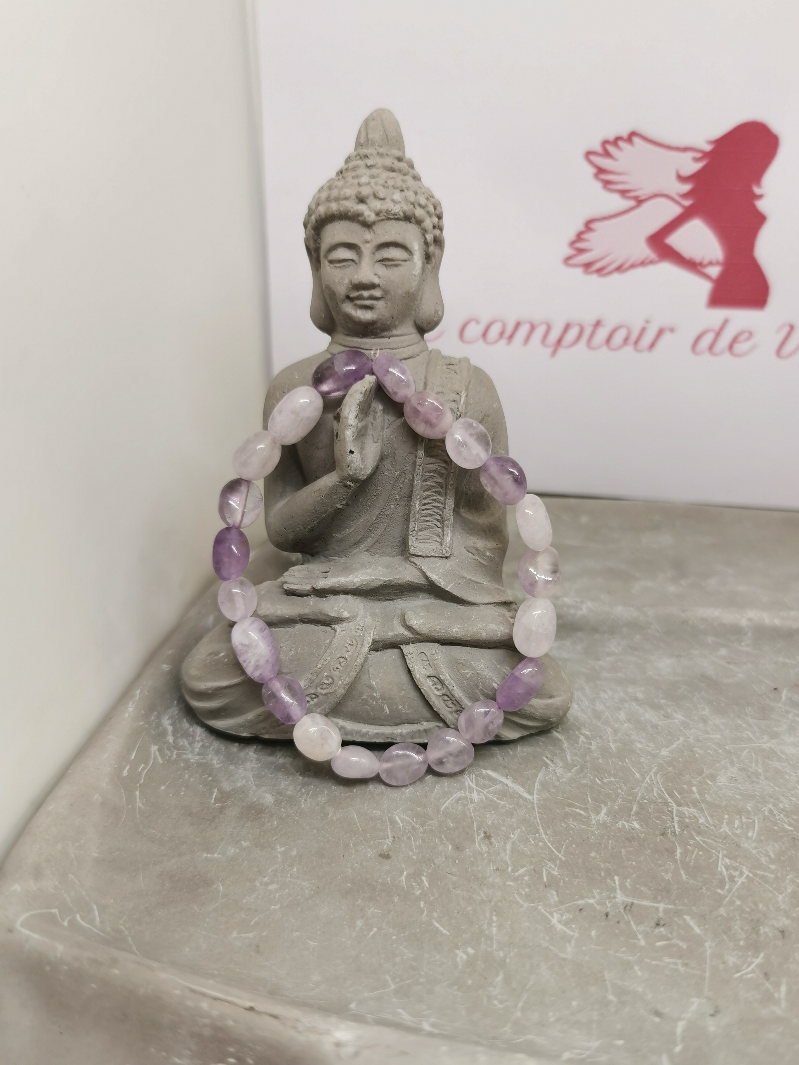 Ce bracelet en améthyste naturelle se distingue par la douceur de ses teintes violettes allant du lilas clair au violet plus profond. Les perles aux formes naturelles et légèrement irrégulières mettent en valeur l’authenticité de la pierre et lui donnent un charme minéral unique.