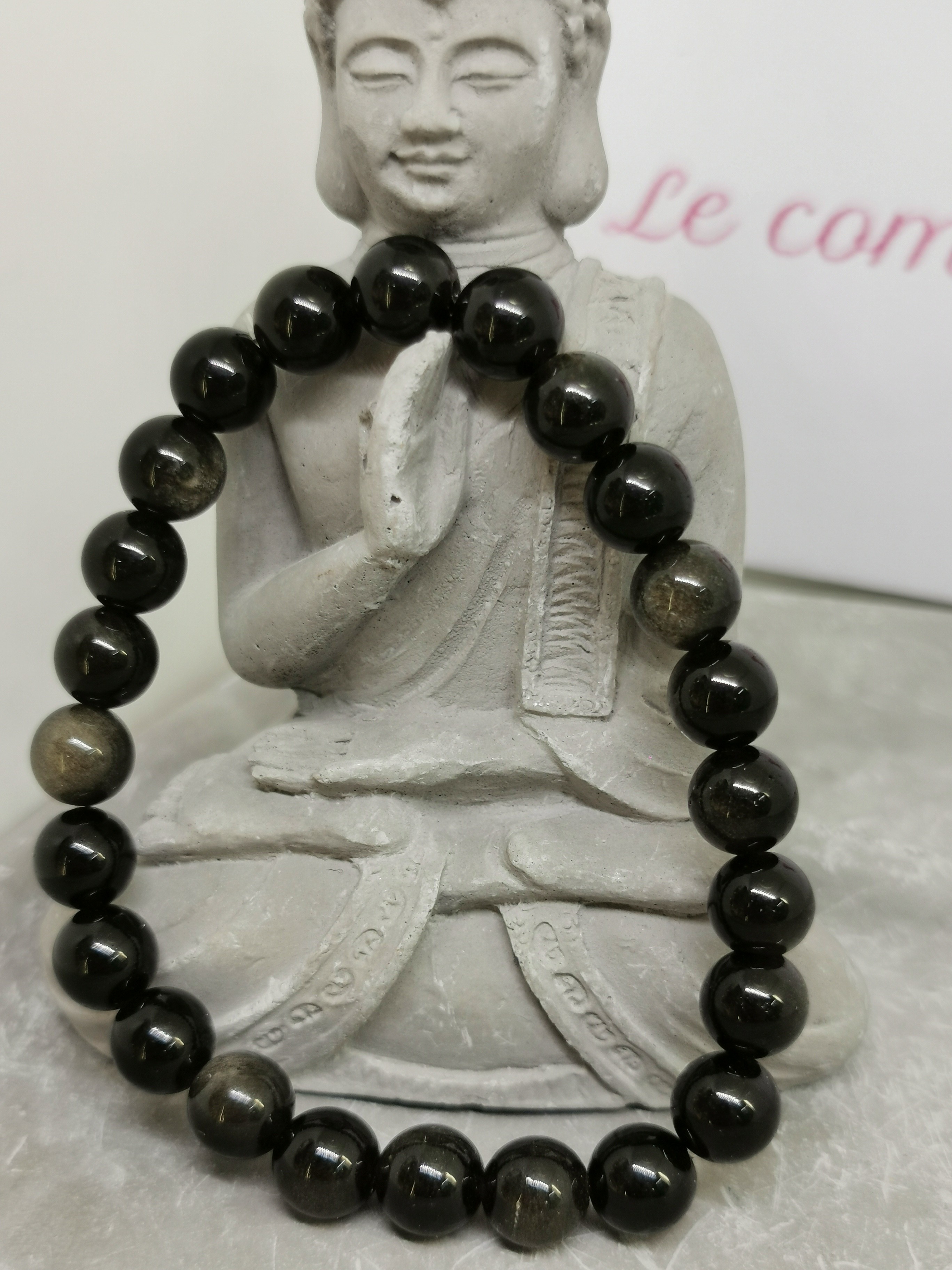 Ce bracelet en obsidienne céleste naturelle est composé de perles rondes de 8 mm, offrant un bijou élégant et mystérieux aux reflets profonds. La pierre présente une couleur noire intense dans laquelle apparaissent de subtiles nuances gris argenté et des reflets parfois légèrement dorés, caractéristiques de cette variété d’obsidienne.