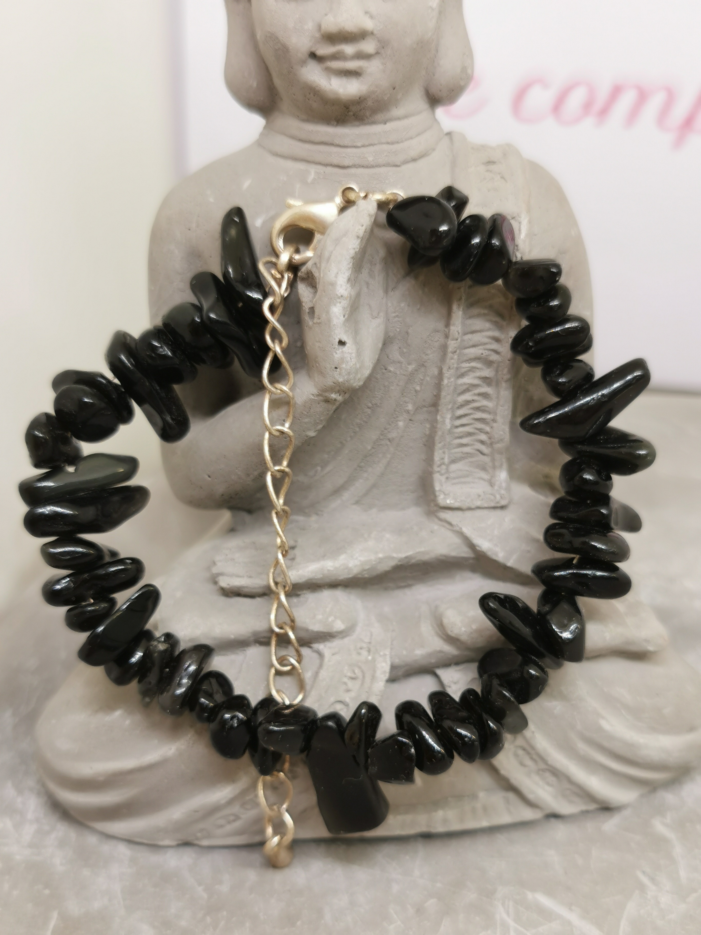 Ce bracelet en chips d’obsidienne noire naturelle est monté sur une chaîne en métal finition argent vieilli, lui donnant un style à la fois naturel et élégant. Les éclats de pierre (chips) présentent des formes irrégulières, ce qui rend chaque bracelet unique et authentique.