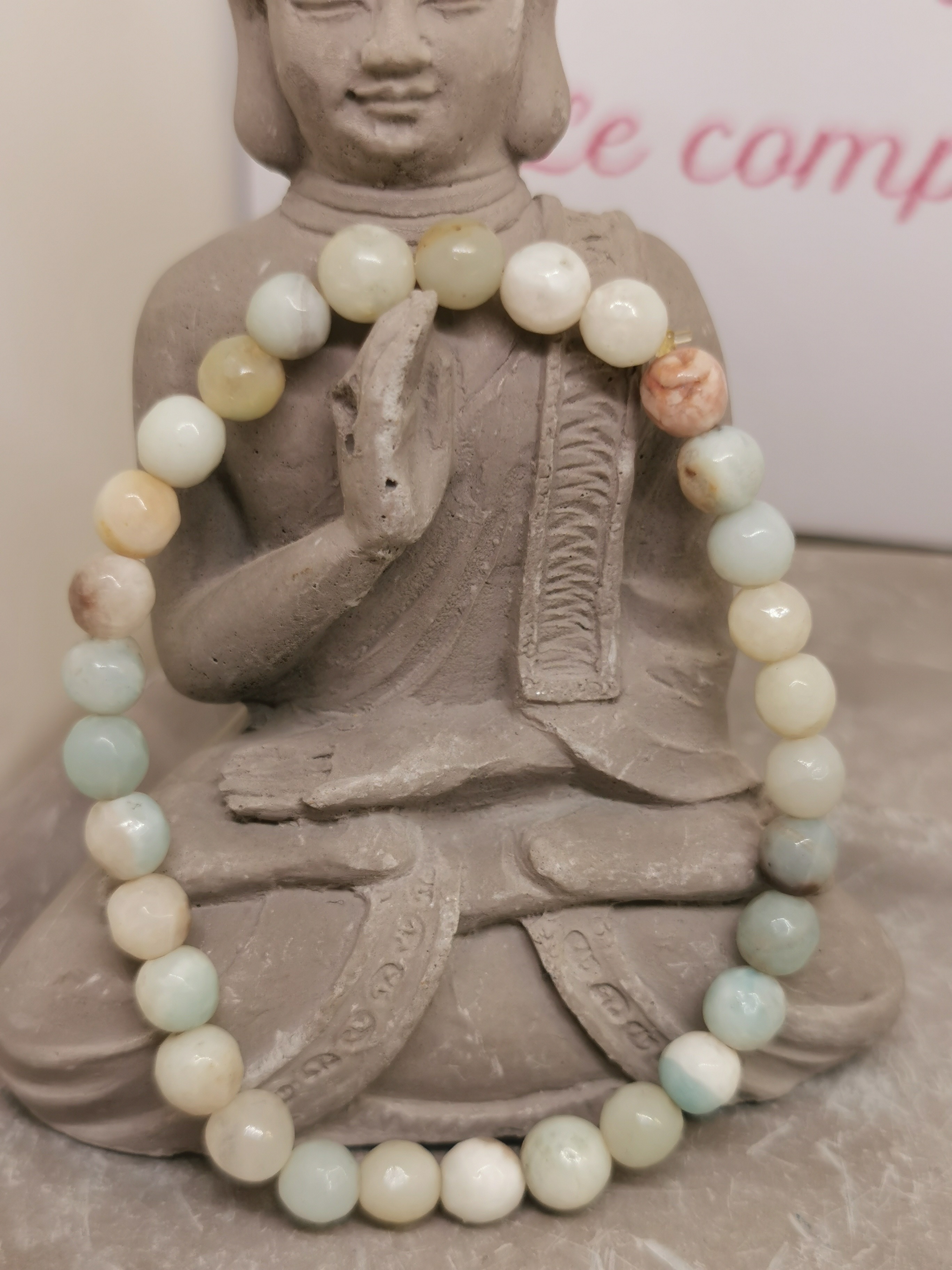 Ce bracelet en amazonite naturelle facettée séduit par ses nuances délicates allant du vert pâle au bleu doux, parfois mêlées de nuances crème ou légèrement beige. Les reflets subtils de la pierre apportent une touche de douceur et d’élégance à ce bijou naturel.