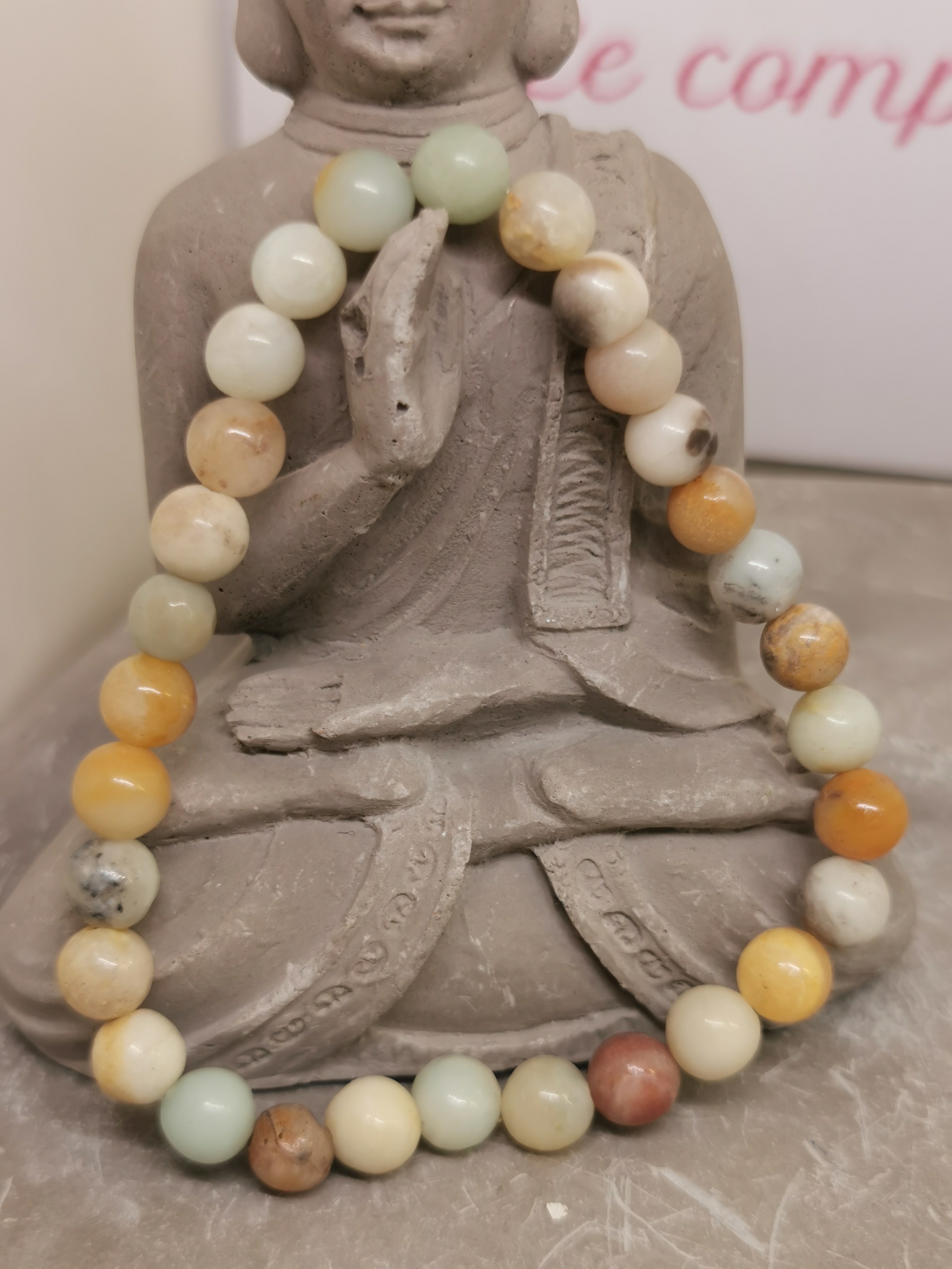 Ce bracelet en amazonite naturelle séduit par ses nuances douces et naturelles allant du vert tendre au bleu pâle, parfois mêlées de tons crème, beige ou légèrement orangés. Chaque perle possède ses propres variations de couleurs, ce qui rend chaque bracelet unique.