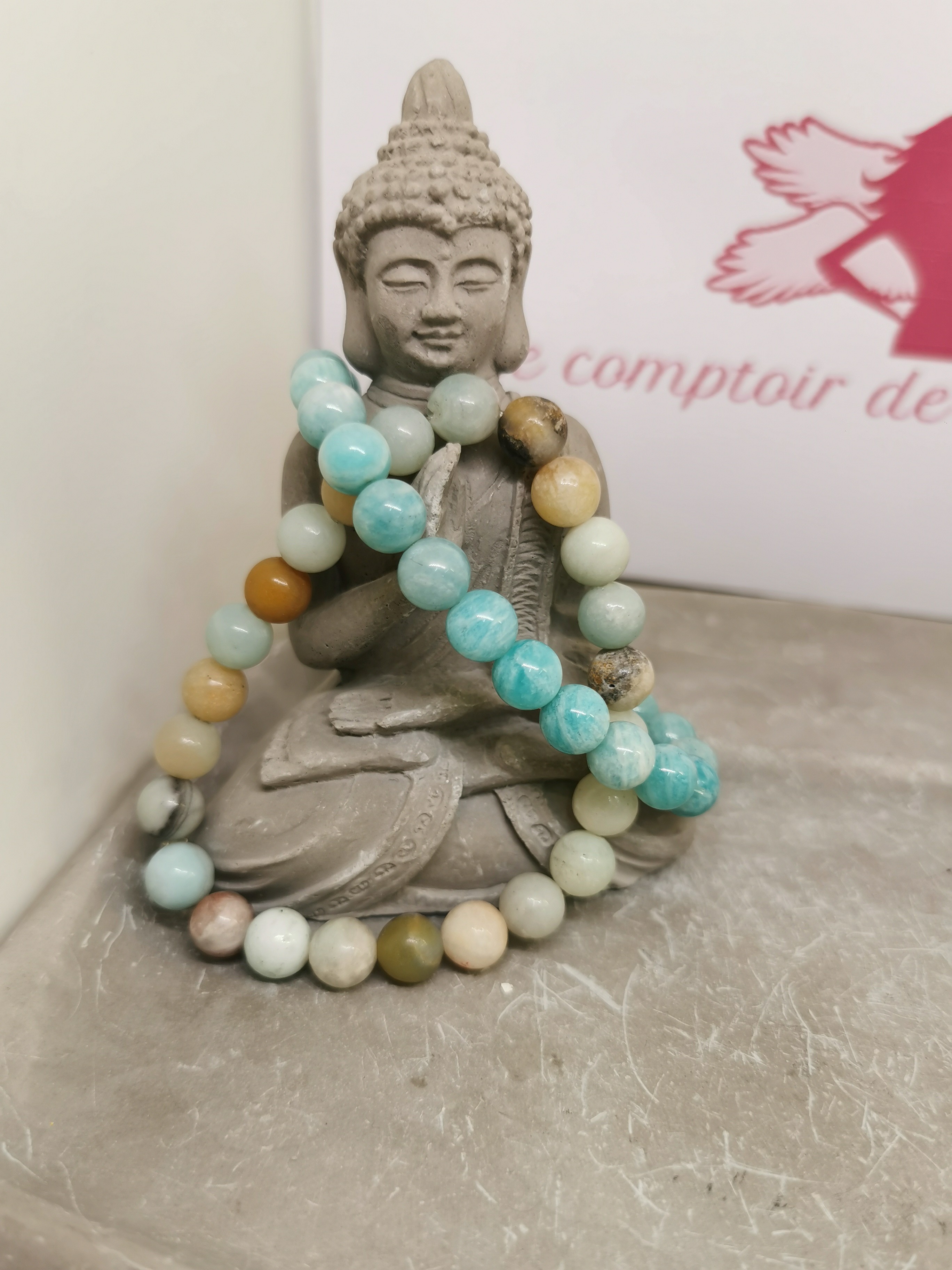 Ce bracelet en amazonite naturelle dévoile toute la beauté de cette pierre aux nuances douces et apaisantes. Les perles rondes présentent des couleurs allant du bleu turquoise au vert pâle, parfois mêlées de nuances crème, beige ou légèrement orangées. Ces variations naturelles rendent chaque bracelet unique.