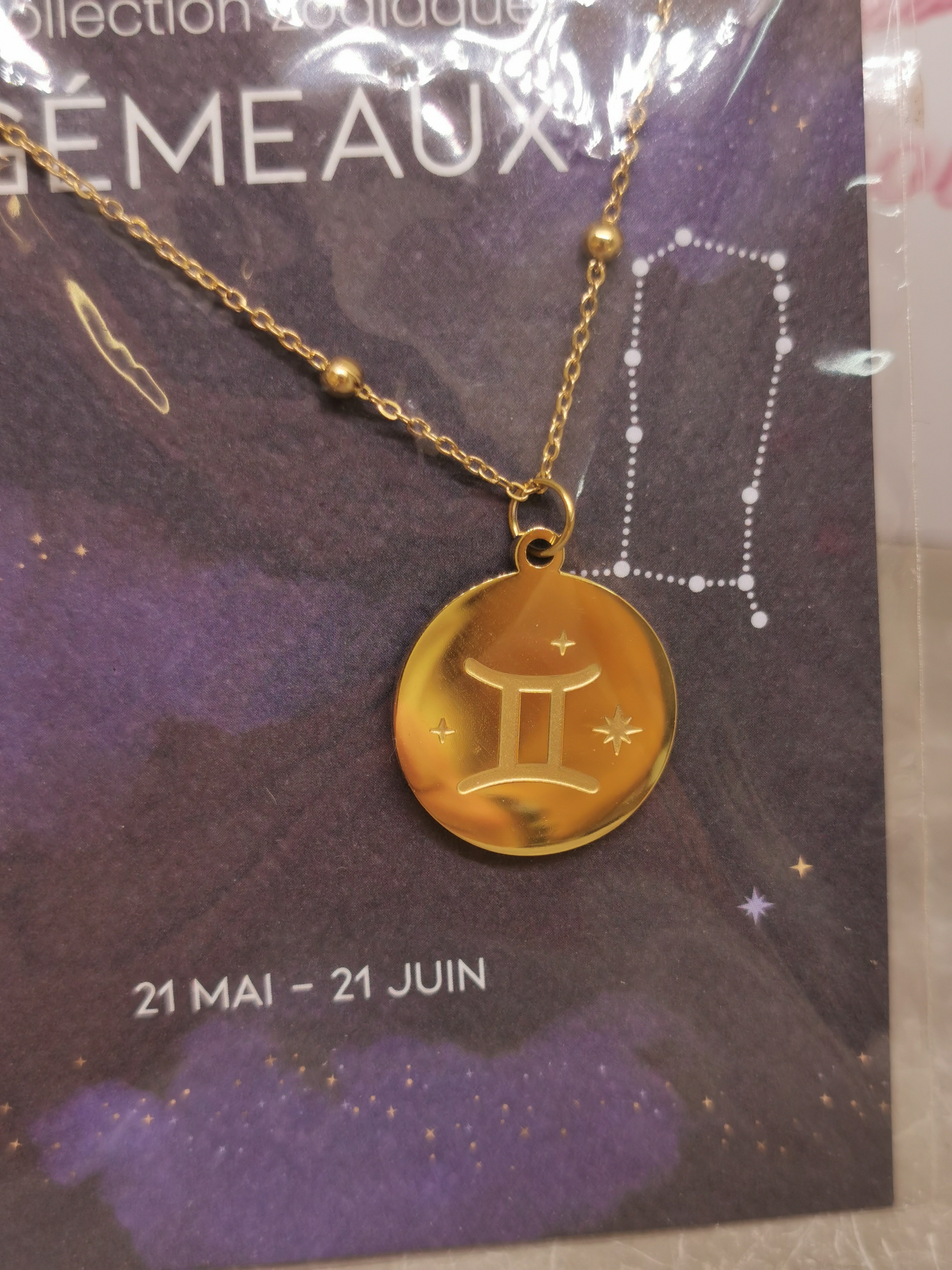 Ce collier raffiné met à l’honneur le signe astrologique des Gémeaux, symbole de curiosité, de communication et d’intelligence vive. La médaille dorée porte le symbole astrologique des Gémeaux, accompagné de petites étoiles gravées qui rappellent le lien entre l’homme et l’univers.