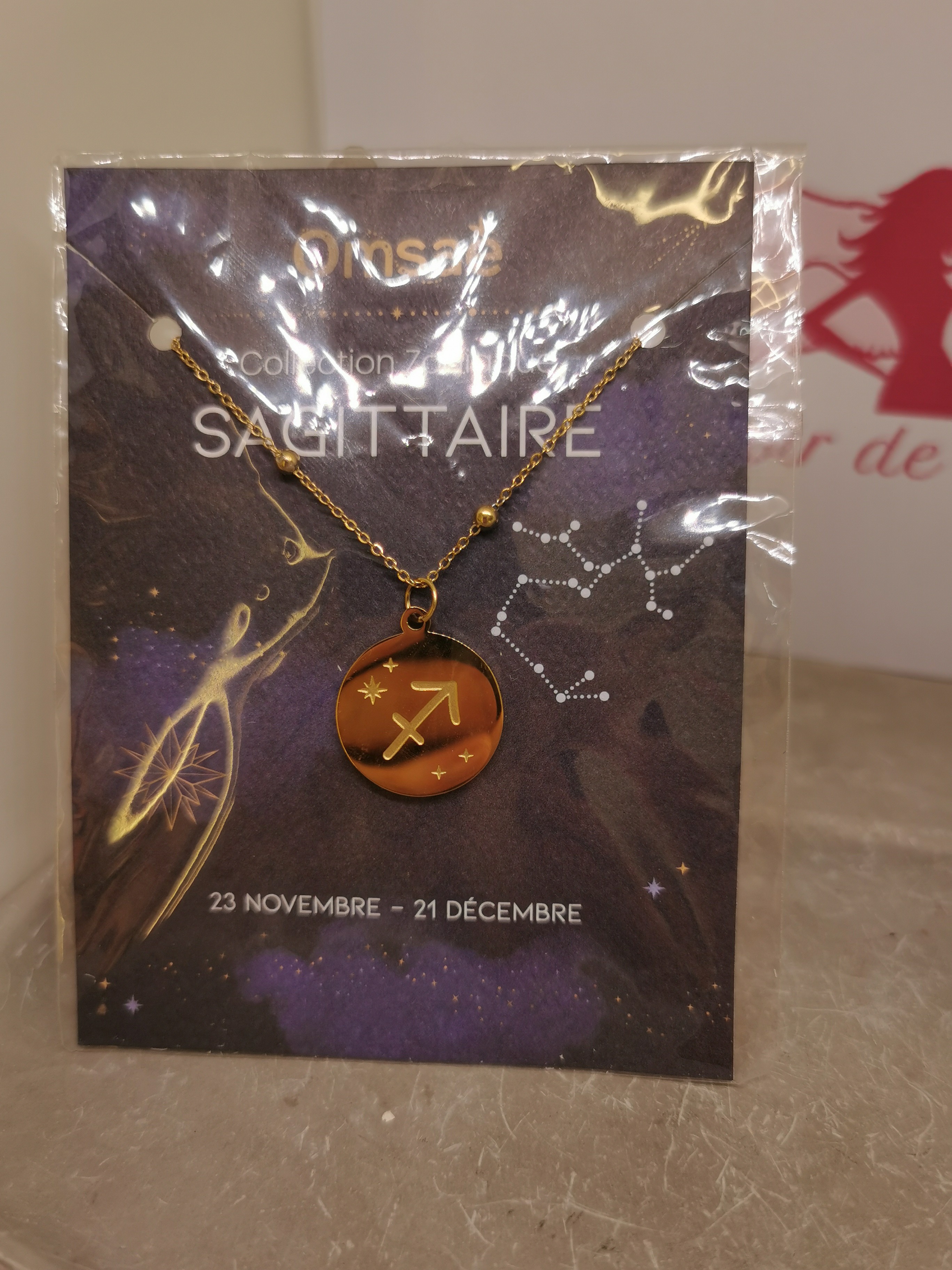 Ce collier élégant met à l’honneur le signe astrologique du Sagittaire, symbole d’aventure, de liberté et de quête de sens. Le pendentif rond est gravé du symbole astrologique du Sagittaire, accompagné de petites étoiles qui rappellent l’immensité du ciel et la connexion avec l’univers.