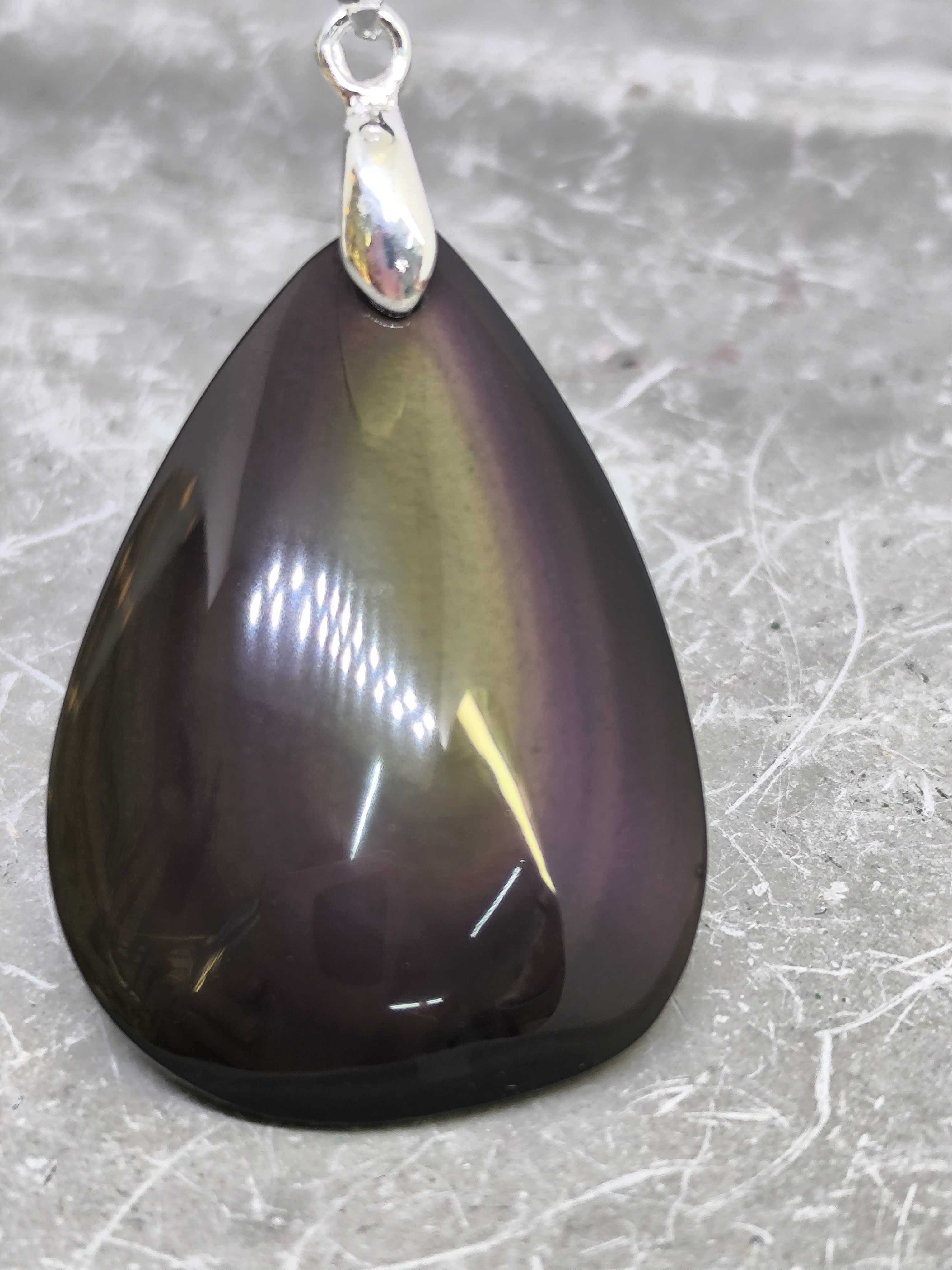 Chaque pendentif est unique : sous certains angles, la pierre révèle de subtiles nuances colorées, presque mystiques, qui témoignent de son origine volcanique.