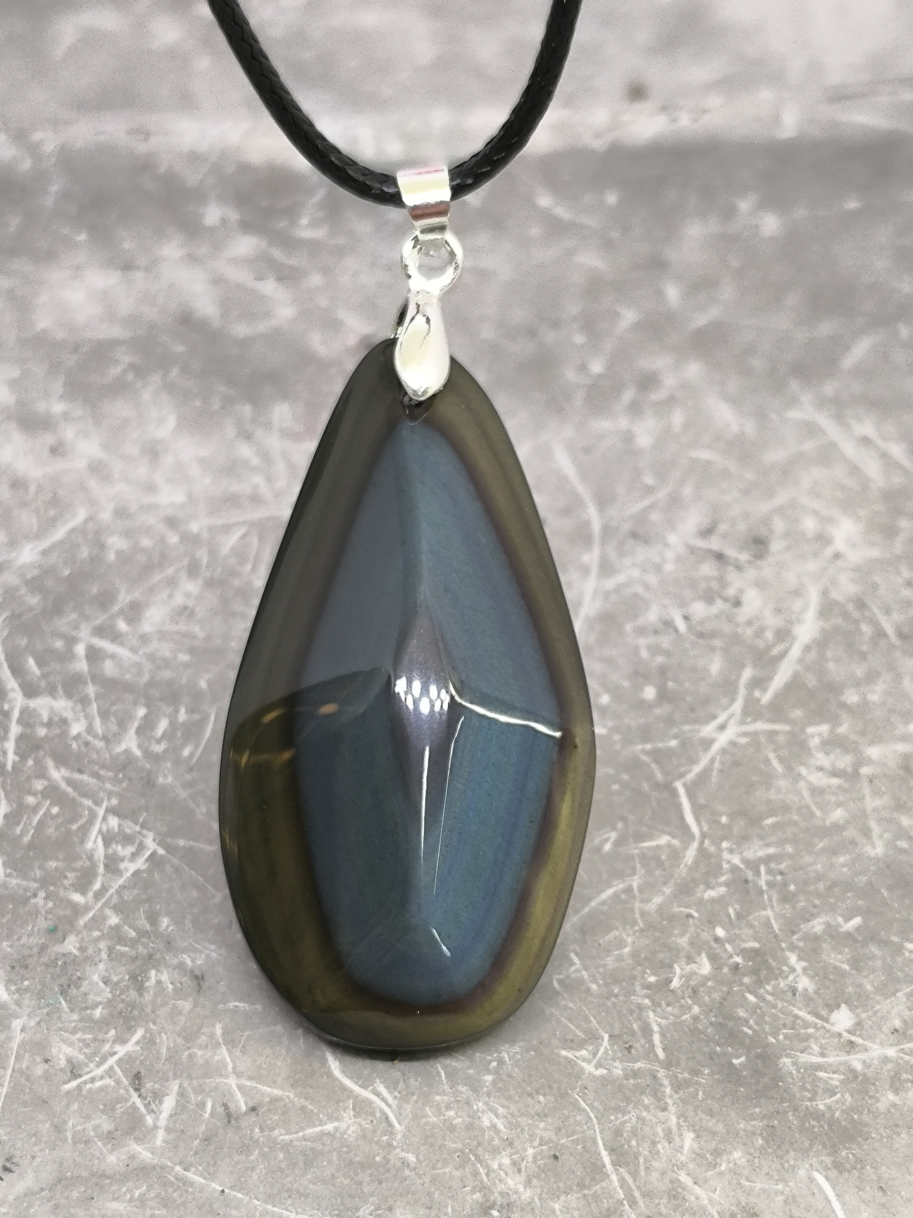 Ce pendentif en obsidienne arc-en-ciel naturelle révèle une particularité rare : un reflet bleuté profond, entouré de nuances dorées et verdâtres.